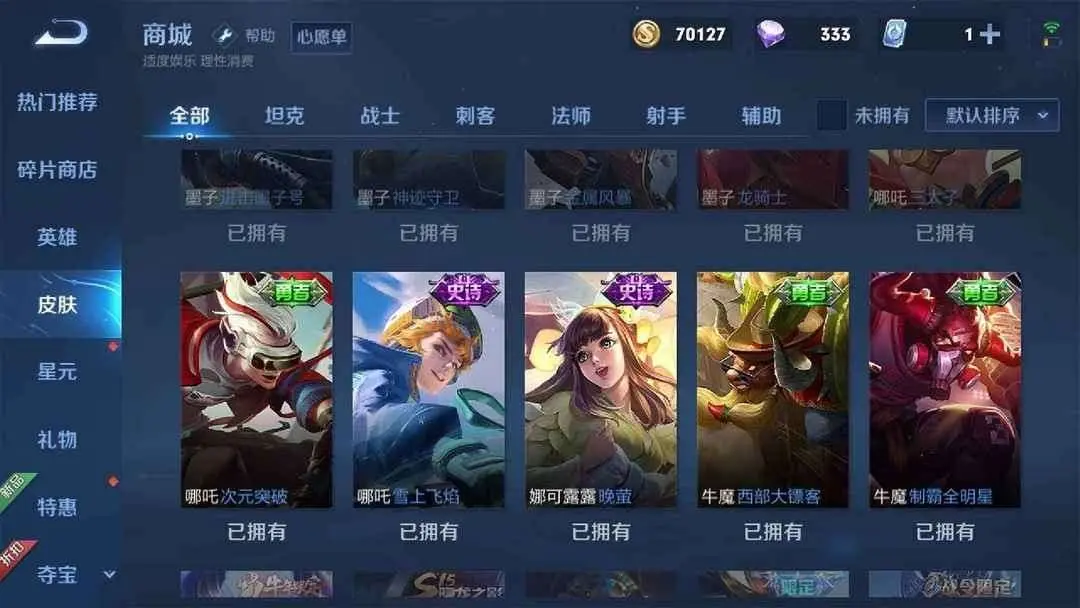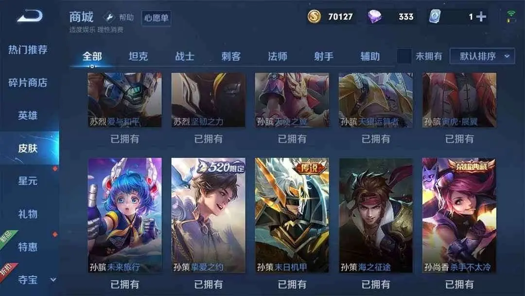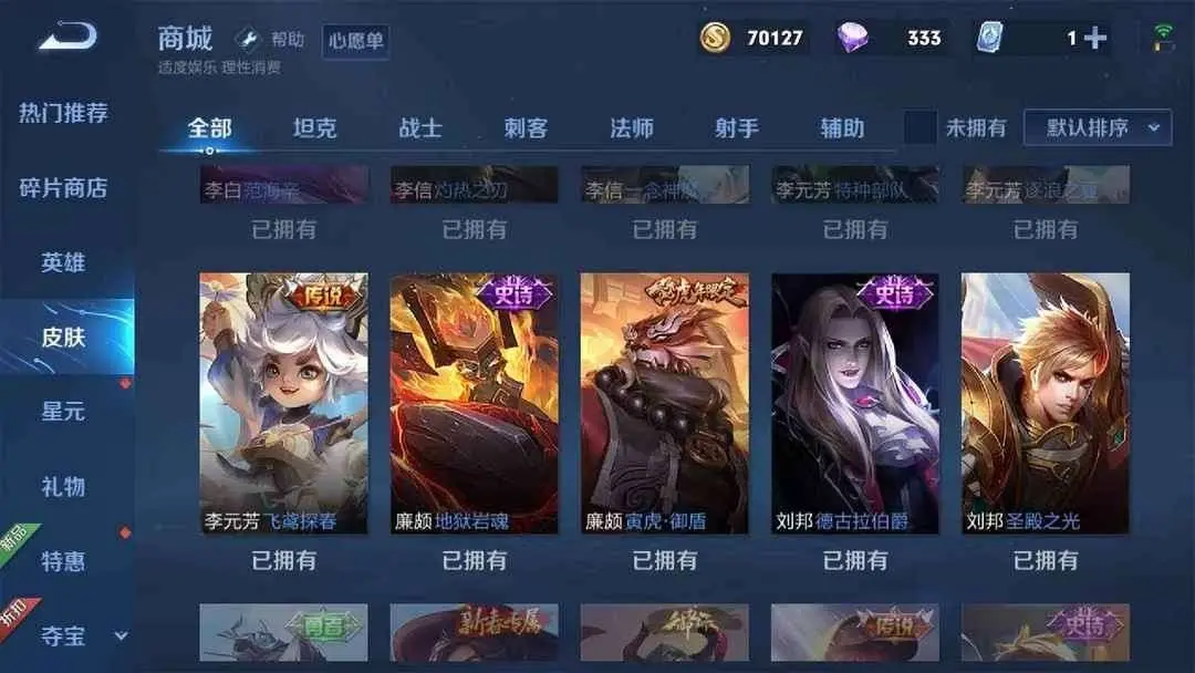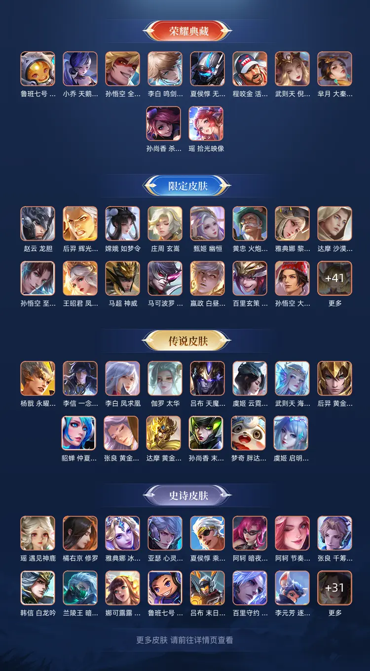 优质皮肤:拒霜思,猫狗日记男,久胜战神,一念神魔,猫狗日记女,电玩小子,云鹰飞将,猫影幻舞,苍穹之光,暗夜猫娘,时之恋人男,时之恋人女,修罗,冠军飞将,龙骑士,梁祝,未来纪元,云霓雀翎,黄金狮子座,黄金白羊座,黄金射手座,黄金分割率,仲夏夜之梦,魅语,晚萤,胖达荣荣,海洋之心,千年之狐,末日机甲男,末日机甲女,遇见神鹿,