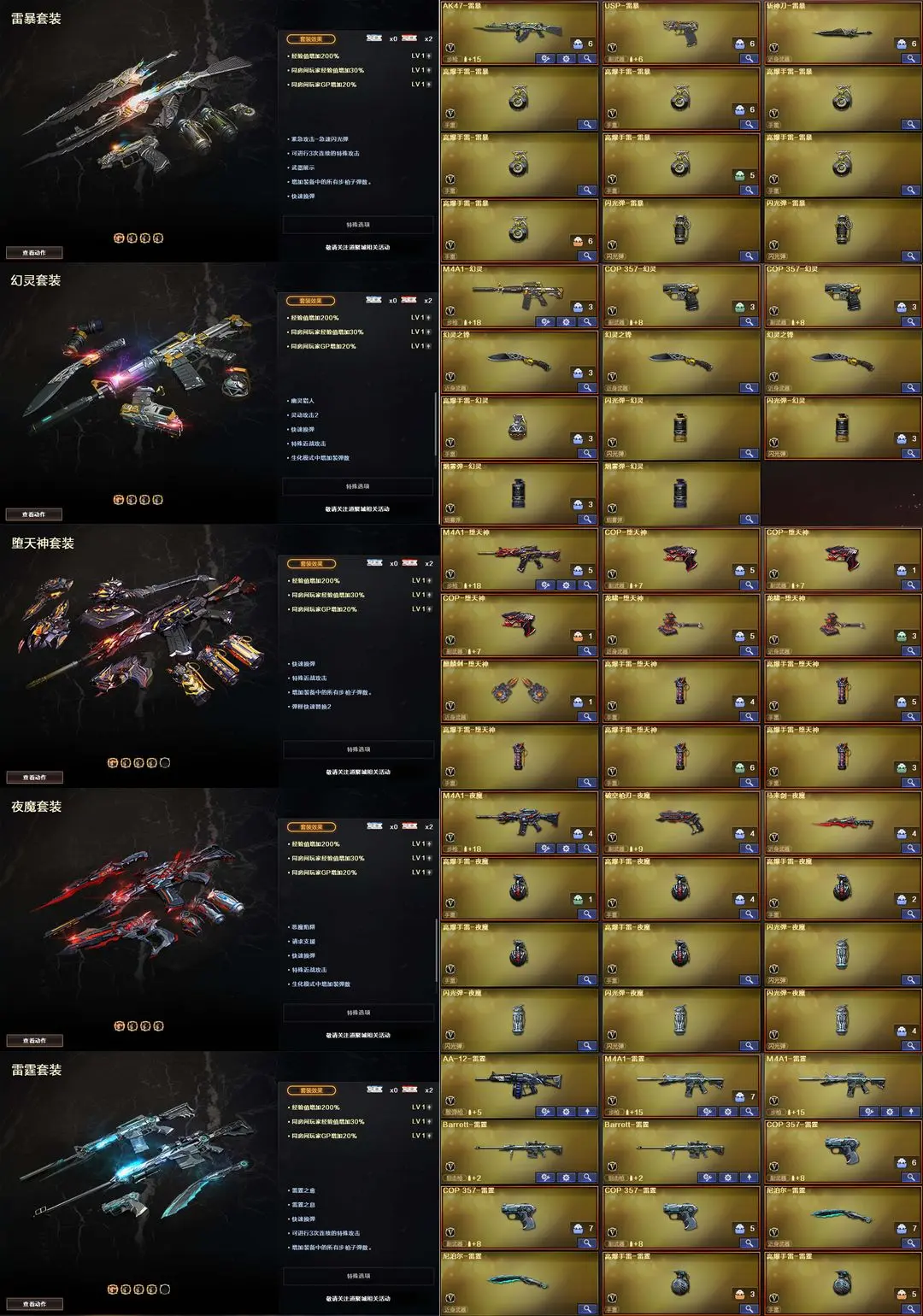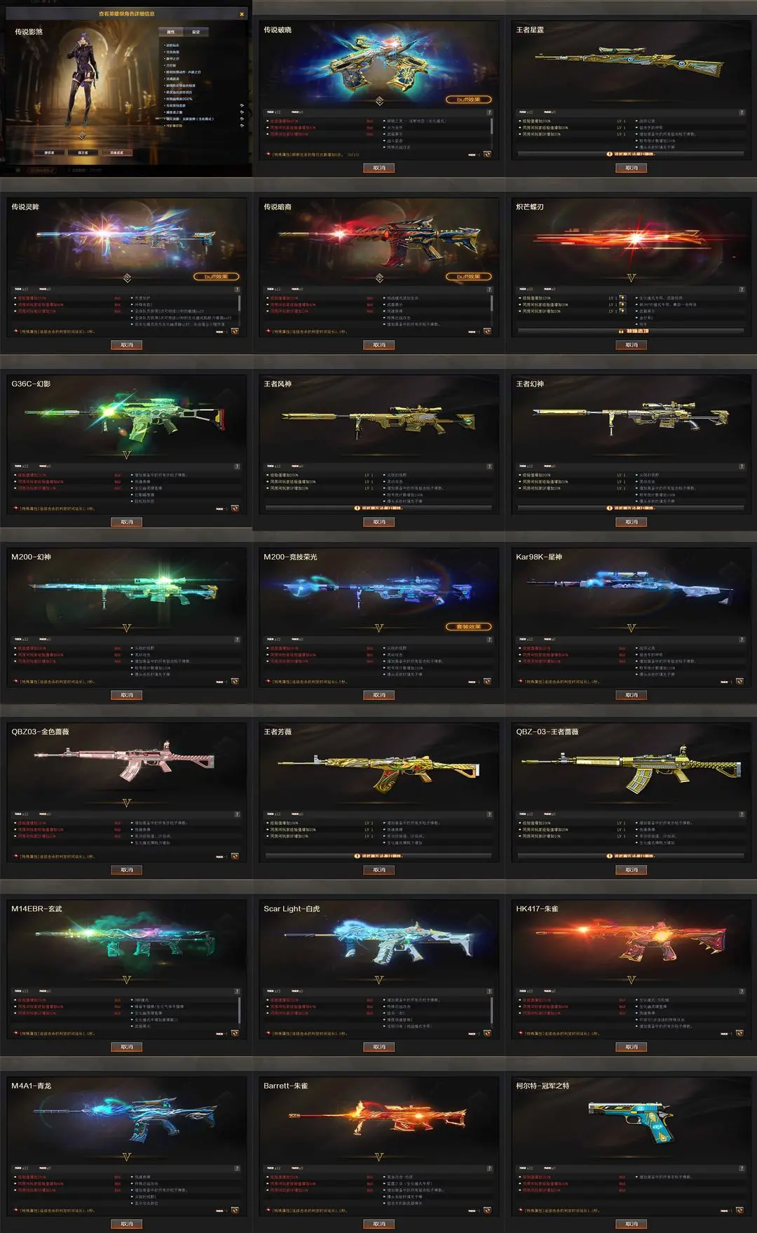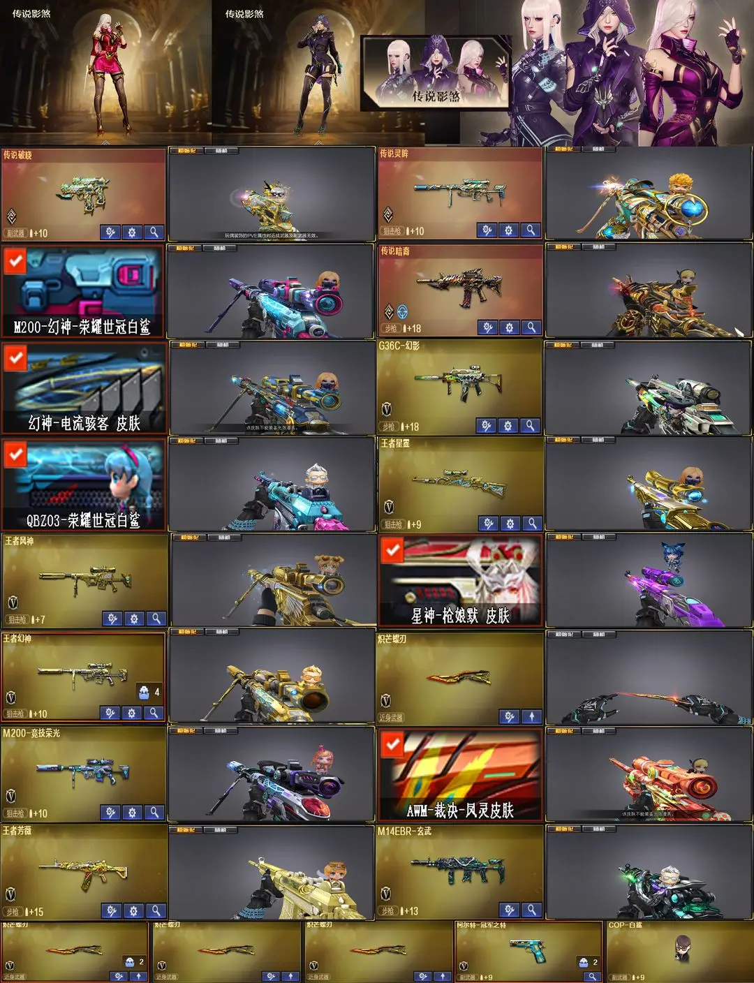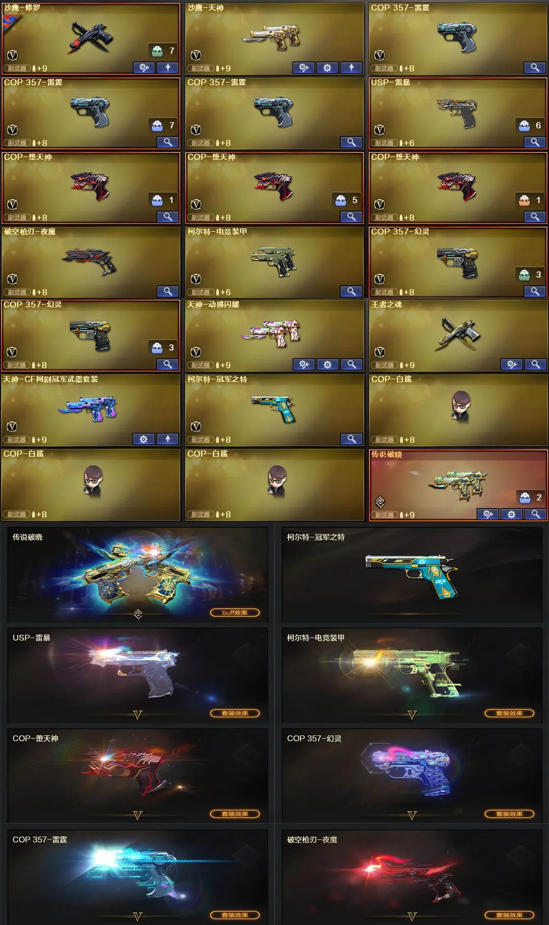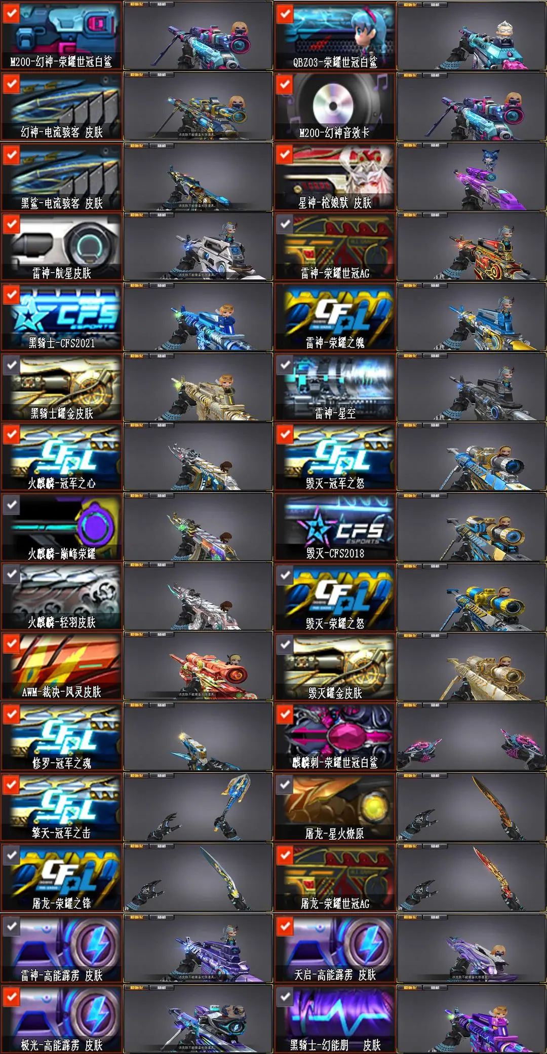 【装备道具】:【四传说】/【幻神三件套】/传说影煞/传说灵眸/传说暗裔/传说破晓/幻神/幻神音效卡/幻神荣耀世冠白鲨/幻神电流骇客/M200竞技荣光/星神/星神枪娘默/王者幻神/王者风神/王者星霆/柯尔特冠军之特/炽芒蝶刃/*3/【生化套装】/6盘龙/6烈龙/斯泰尔蝴蝶/【套装】/臻选金狐套/雷霆套/雷暴套/堕天神套/夜魔套/幻灵套/【四神兽套】/青龙/朱雀/朱雀音效卡/白虎/白虎热带奇洋/玄武/6黑骑士/6修罗/G36C幻影/QBZ金色蔷薇/QBZ荣耀世冠白鲨/QBZ王者蔷薇/王者芳薇/USP雷暴/COP堕天神/COP幻灵/火麒麟/火麒麟音效卡/火麒麟巅峰荣耀/火麒麟冠军之心/黑龙/黑龙音效卡/雷神/雷神音效卡/雷神高能霹雳/雷神荣耀之魄/雷神荣耀世冠AG/黑骑士/黑骑士音效卡/黑骑士幻能朋克/黑骑士CFS/毁灭/毁灭音效卡/毁灭荣耀之怒/毁灭CFS/毁灭冠军之怒/极光/极光音效卡/极光高能霹雳/裁决/裁决音效卡/【小人枪】/MA41雷神精英刀锋/裁决雪莉杨/迷你小钢/COP白鲨/蝴蝶枪