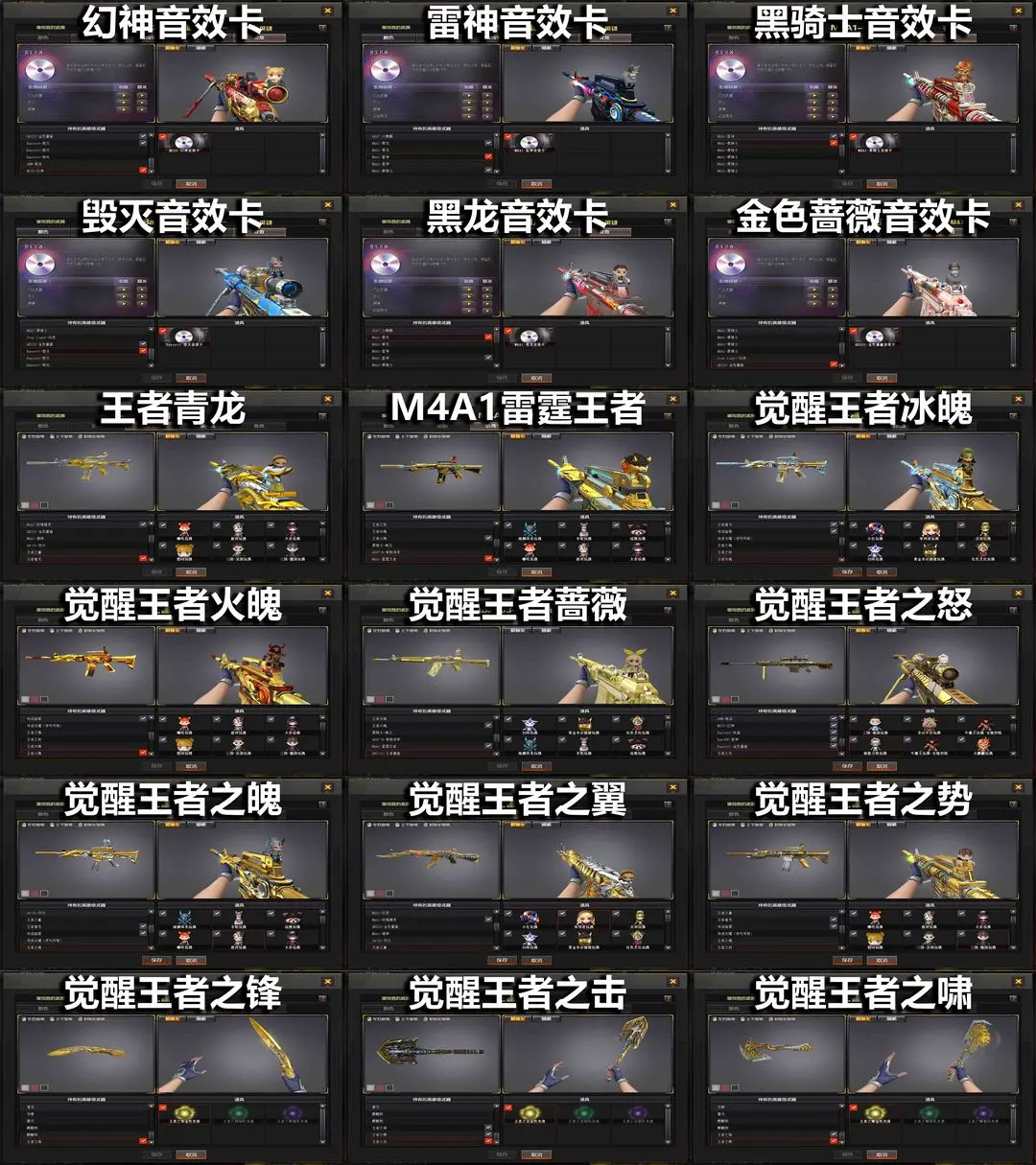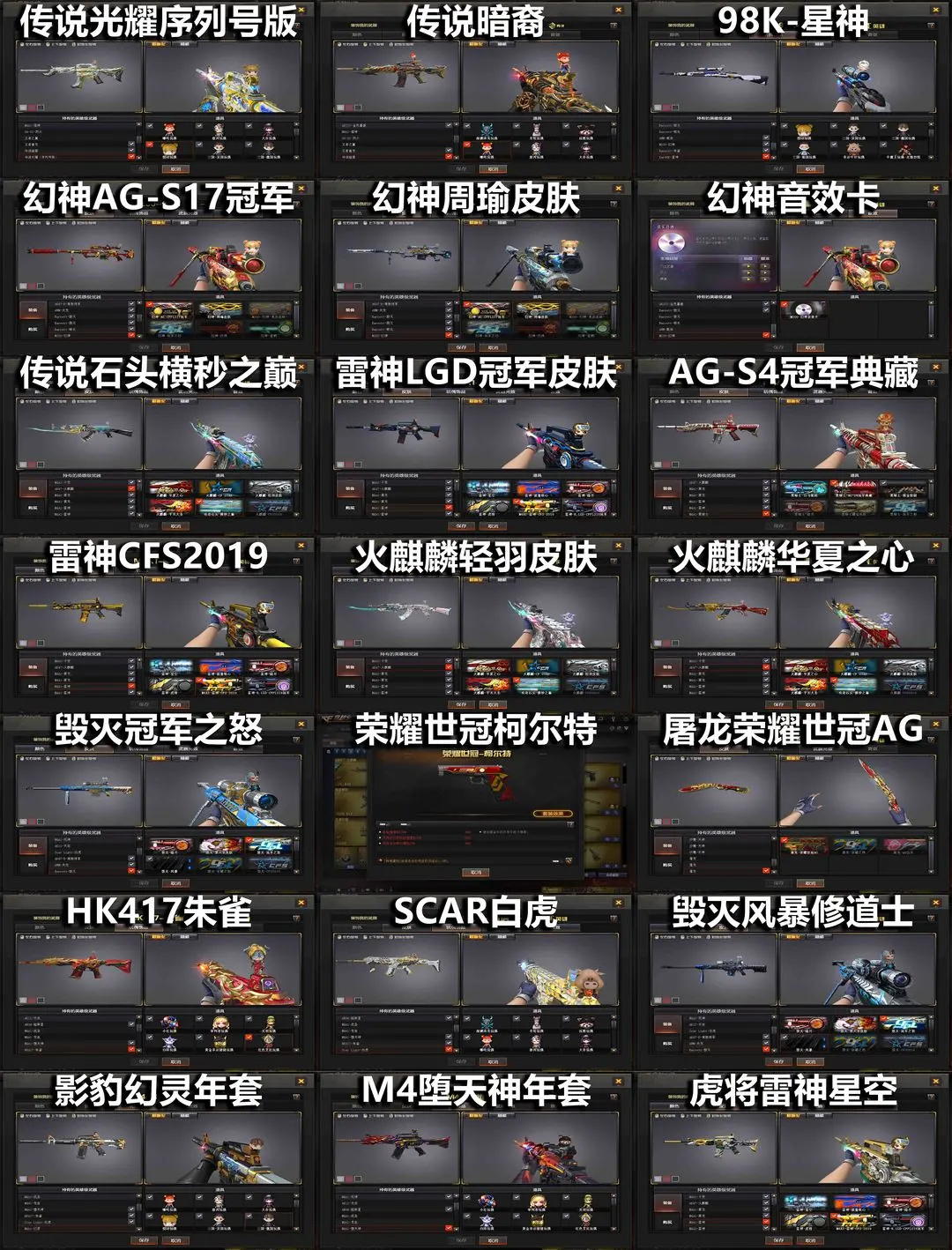 【装备道具】:幻神黄忠★98K星神★QBZ-金色蔷薇★HK417朱雀★5音效卡★火麒麟音效卡★毁灭音效卡★雷神音效卡★黑骑士音效卡★黑龙音效卡★斗鱼雷神★N9雷神★冠军SV皮肤★毁灭AG冠军★虎将雷神★雷神耀金★毁灭耀金★火麒麟轻羽★荣耀之锋★火麒麟AG战队★王者之魄★COP白鲨★炫COP雷霆套★凌霄夜魔年套★COP雷霆★柯尔特电竞装甲★6盘龙6烈龙炼狱★夜魔破空枪刃★烈火王者之影★AA12-雷霆★生化弹夹防化服变异宝贝死亡之眼对讲机不退包★佣兵觉醒无需换弹手斧镜减速雷★捕食者之眼查看血量★