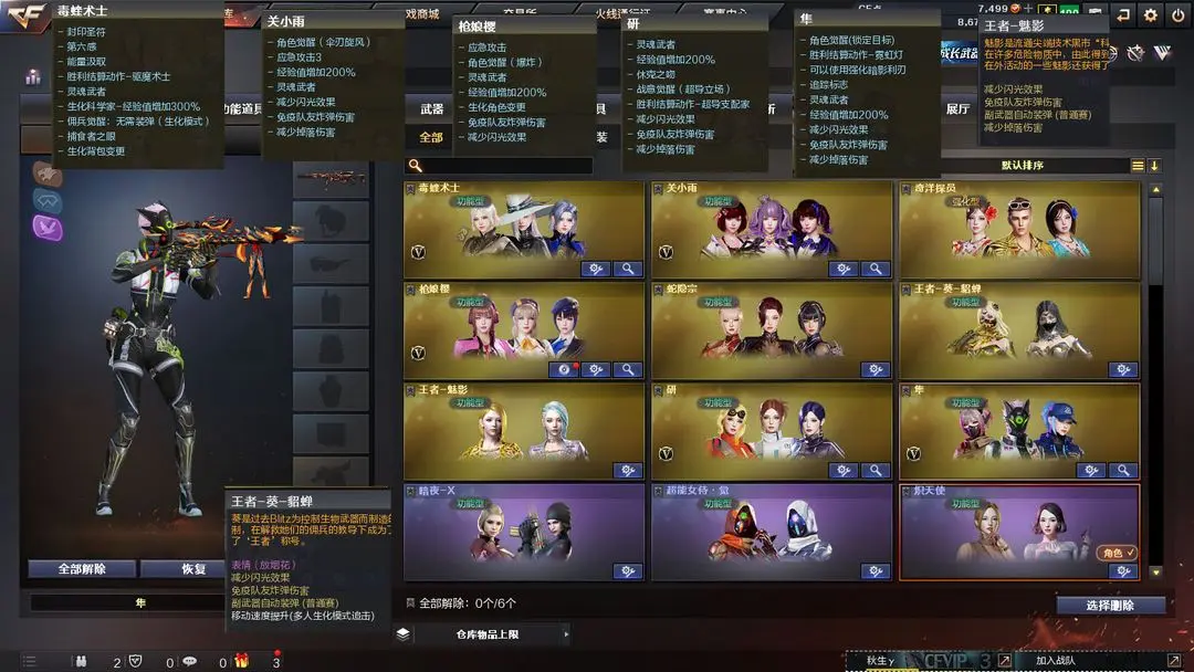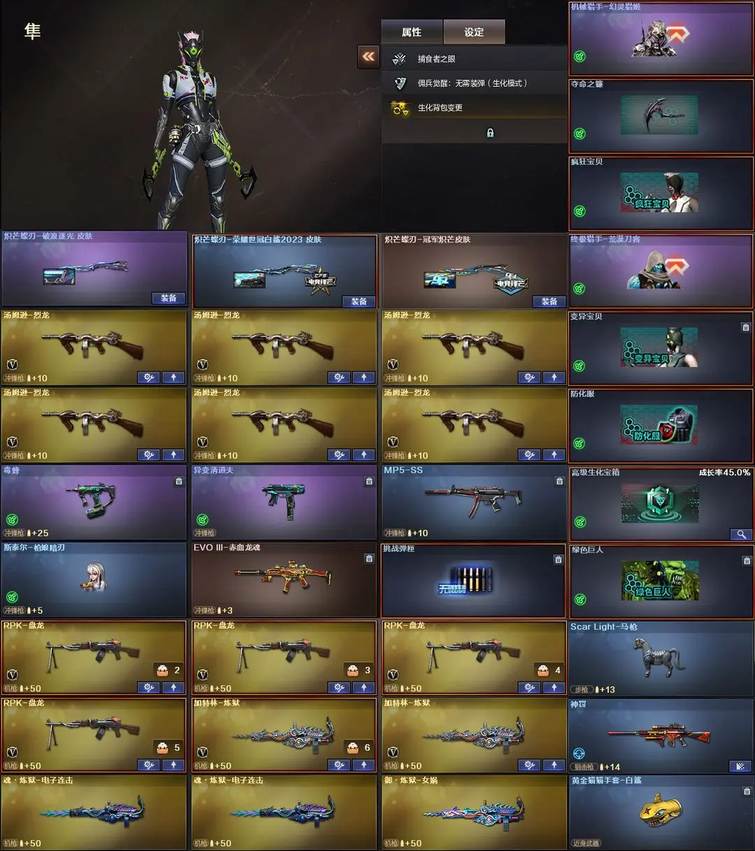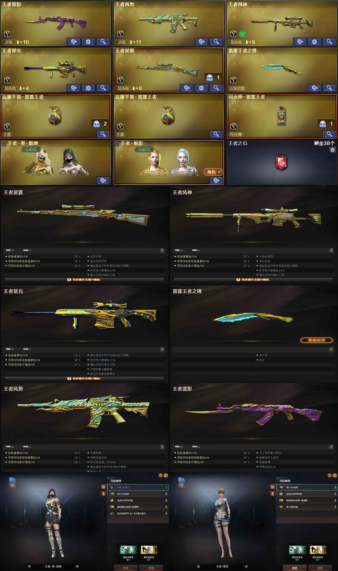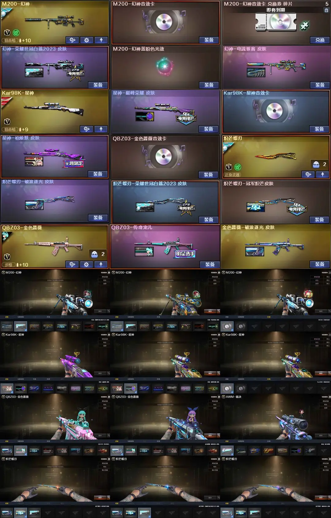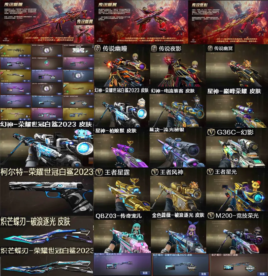 【装备道具】:【传说幽瞳+传说幽冥+传说夜影】【毒蝰术士】【M200-幻神+幻神音效卡+荣耀世冠白鲨2023幻神+电流骇客幻神】【黄金猫猫手套-鲨臂】【98K-星神+星神音效卡+星神巅峰荣耀+星神枪娘默】【6烈龙+毒蜂+蝴蝶斯泰尔枪娘暗刃+4盘2炼狱】【炽芒蝶刃+破浪逐光+荣耀世冠白鲨2023+冠军炽芒】【荣耀世冠雷神和柯尔特和龙啸+竞技荣光套+g36c幻影+金色蔷薇+王者风势+王者雷影+王者风神+王者星霆】【角色:四防王者葵貂蝉+四防王者魅影+关小雨+枪娘樱+研+隼+电竞少女+暗夜X】【音效:呛娘凯撒琳+金色蔷薇】【皮肤:屠龙星耀+金色蔷薇破浪逐光+火麒麟呛娘凯萨林+冠军之击+屠龙巅峰荣耀+火麒麟-横秒之巅+麒麟刺荣耀世冠白鲨+雷神荣耀之魄+柯尔特-竞技荣光+荣耀世冠柯尔特-COP白鲨-COP旗袍】★变异宝贝死亡对讲机不退包★佣兵觉醒无需换弹手斧镜减速雷★捕食者之眼查看血量★
