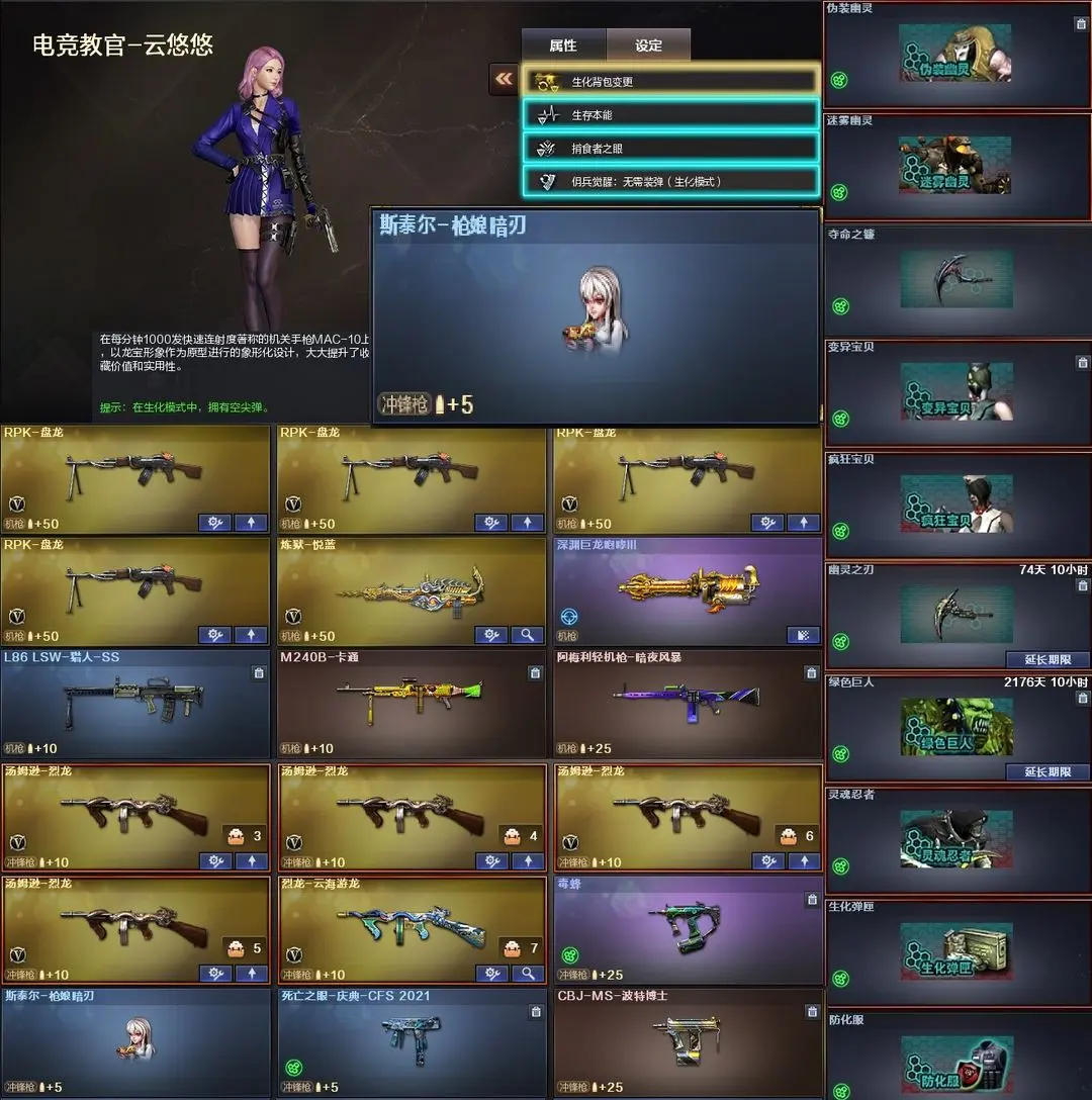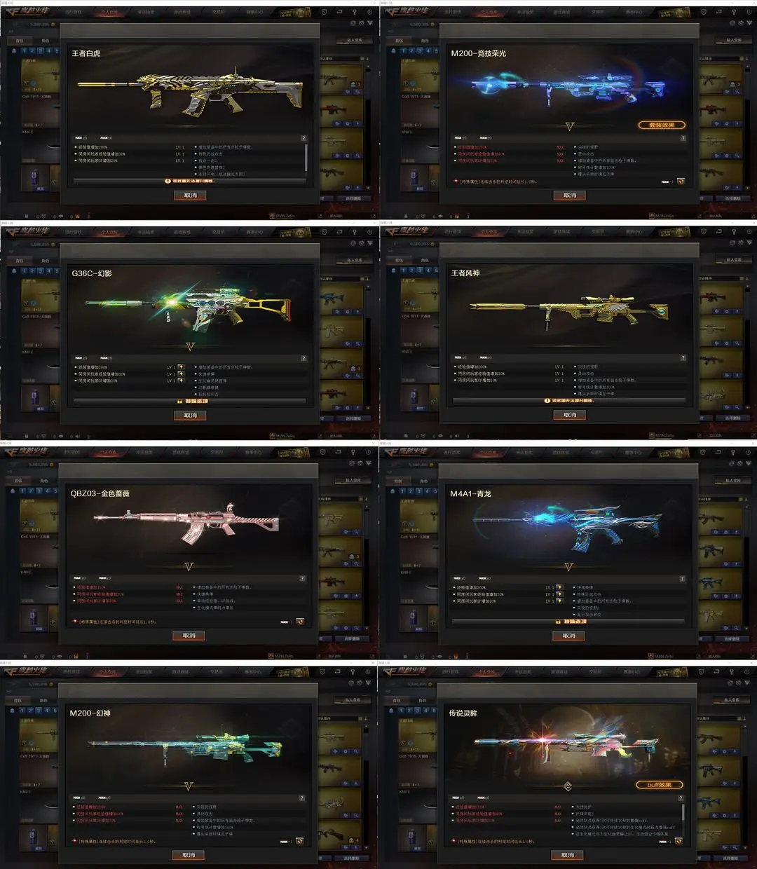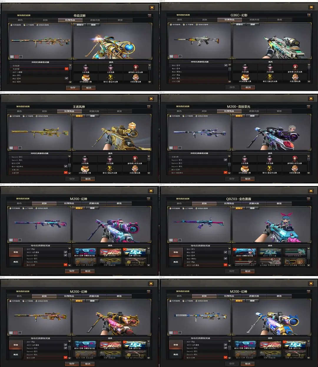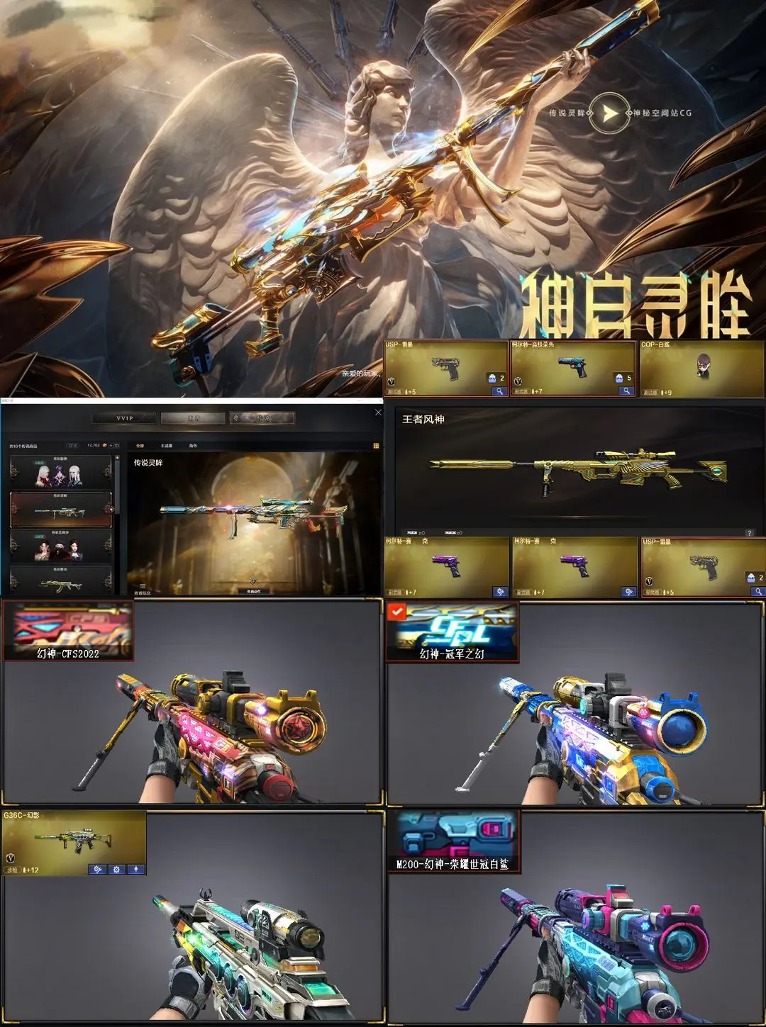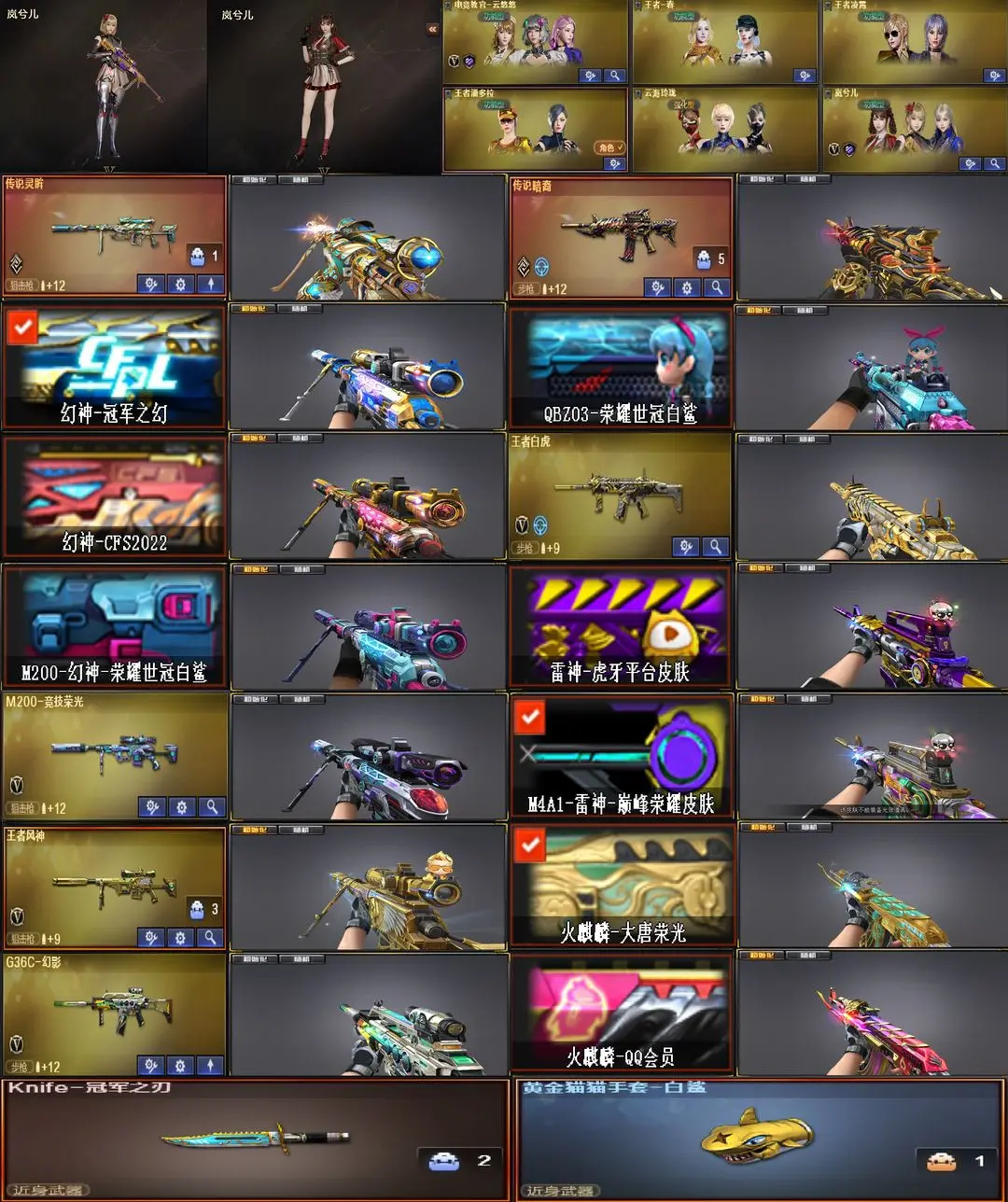 【装备道具】:幻神三皮【幻神-m200+幻神-冠军之幻+幻神-cfs2022+幻神-荣耀世冠白鲨】【传说灵眸*+冠军之刃】【传说暗裔】【qbz金色蔷薇+荣耀世冠白鲨】【觉醒王者白虎*】【g36c-幻影】【觉醒王者风神】【m200竞技荣光全套+柯尔特竞技荣光】【觉醒王者之势/王者之烈/王者之怒】【cop幻灵、竞技荣光柯尔特、usp雷包】【火麒麟+荣耀世冠ag+雷神-q会员+大唐荣光、黑龙、雷神+虎牙平台皮肤+荣耀世冠ag+荣耀巅峰皮肤+暗月、黑骑士+暗月+摸金校尉+幻能朋克、黑鲨、毁灭+荣耀之怒+冠军之怒+黑大圣+墨兰+呛娘格雷、极光】【4盘龙、5烈龙+云海游龙、炼狱、aa12-雷霆】【修罗+cfstra】【屠龙/q会员+荣耀世冠ag、龙啸、擎天+冠军之击、麒麟刺+荣耀世冠白鲨、幻灵之锋、龙啸-烈火龙威、擎天-云海游龙】【幻灵道具套*2、竞技荣光道具套*7】【角色:云悠悠+王者春+王者凌霄+王者潘多拉+岚兮儿+云海游龙】★生化弹夹防化服死亡之眼对讲机不退包★佣兵觉醒无需换弹手斧镜减速雷★G36C幻影⚡传说灵眸⚡6色白鲨幻神冠军之幻2022⚡暗裔王者风神白虎⚡白鲨qbz虎牙雷神巅峰世冠套