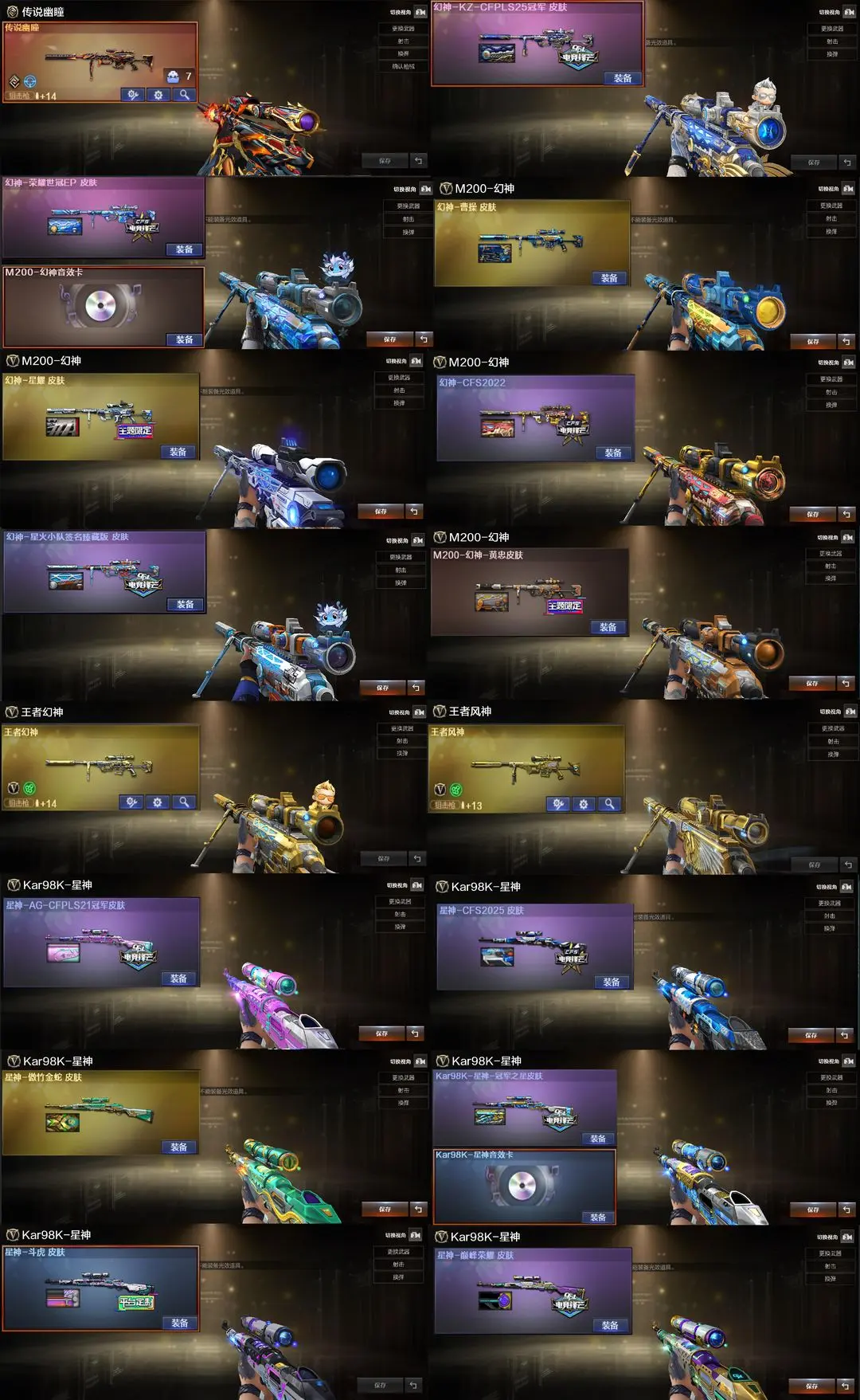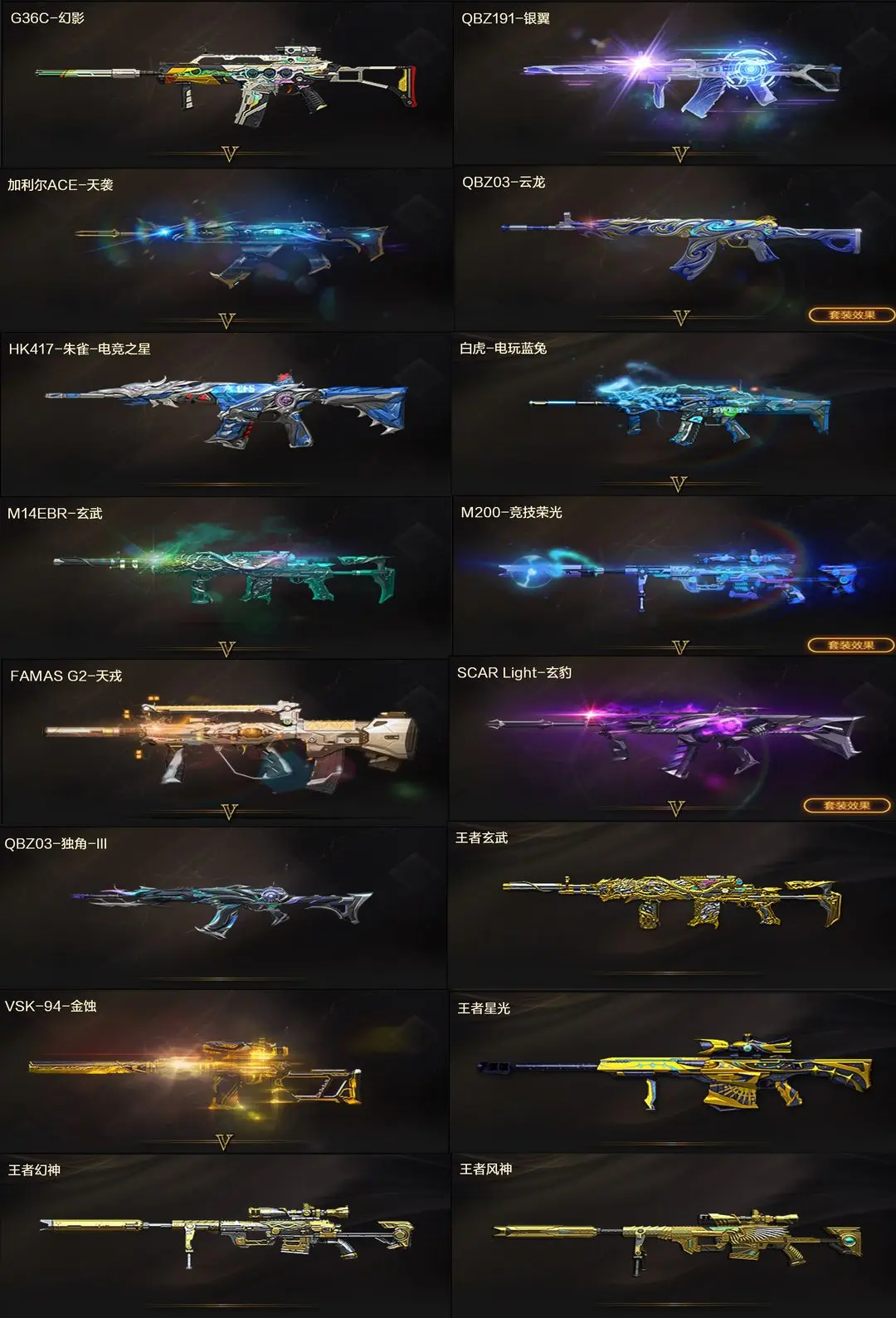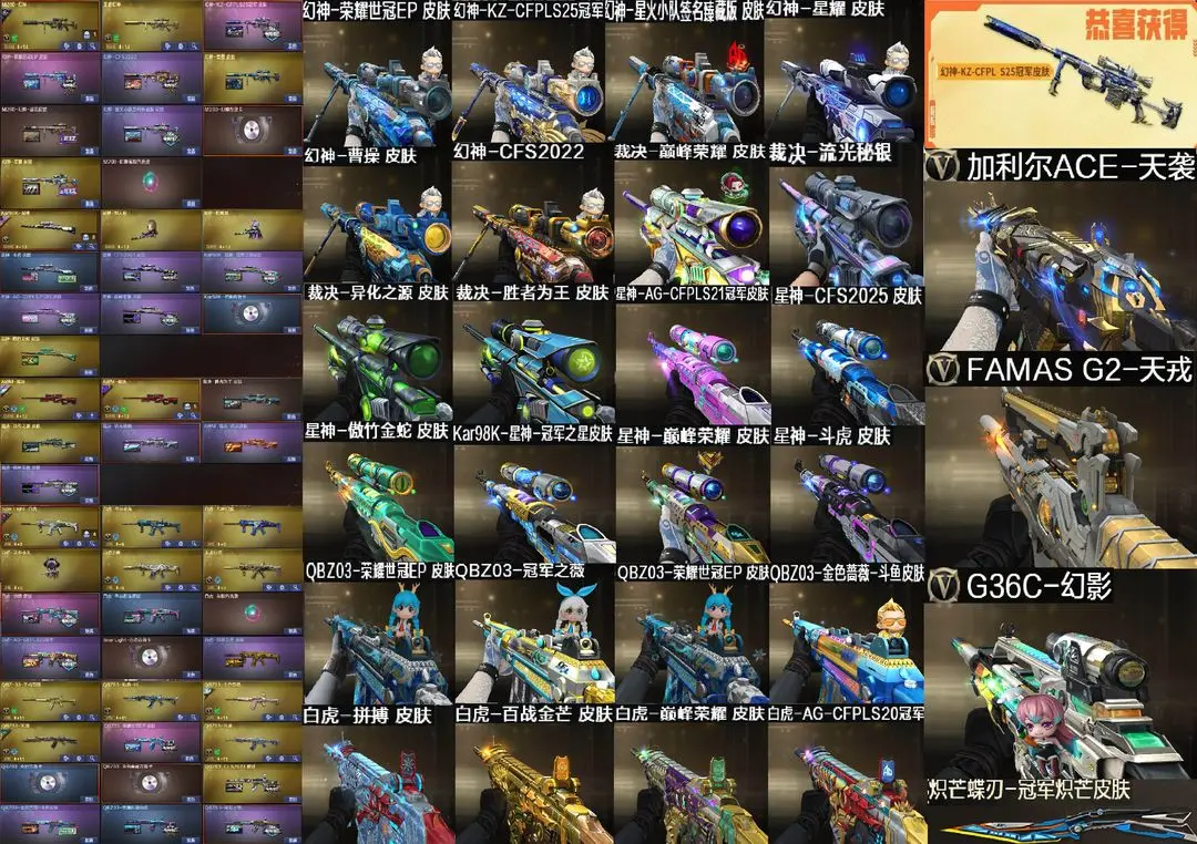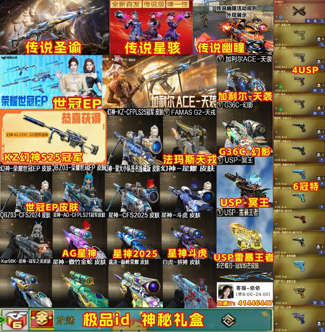 【装备道具】:传说星骇/传说幽瞳/传说幽冥❤幻神-荣耀世冠EP/幻神-星火小队签名臻藏版/幻神-KZ-CFPLS25冠军/幻神-黄忠/幻神-曹操 皮肤/幻神-CFS2022/幻神-星耀/星神-斗虎/星神-巅峰荣耀/星神-傲竹金蛇/星神-冠军之星/星神-AG-CFPLS21冠军/星神-CFS2025❤裁决-胜者为王/裁决-流光秘银/裁决-异化之源/裁决-凤灵/裁决-巅峰荣耀/金色蔷薇-破浪逐光/金色蔷薇-Heartshot/白虎-拼搏/白虎-百战金芒/Scar-白虎-暗星/白虎-电玩粉兔/白虎-巅峰荣耀/白虎-AG-CFPLS20冠军/天罚-孙权/QBZ03-荣耀世冠EP肤/QBZ03-CFS2024/QBZ03-荣耀世冠白鲨/QBZ03-冠军之薇/QBZ03-金色蔷薇-斗鱼❤炽芒蝶刃-冠军炽芒❤王者玄武/王者凛烈/王者星光/USP-雷暴王者/王者破空枪刃/斯泰尔-蝴蝶/MK5-炽火炎龙/FAMAS G2-天戎/加利尔ACE-天袭/SCAR Light-玄豹/G36C-幻影/QBZ191-银翼游侠/VSK-94-金蚀/❤竞技荣光套装/荣耀世冠套装/雷霆王者套装/云龙套装/玄豹套装❤全生化