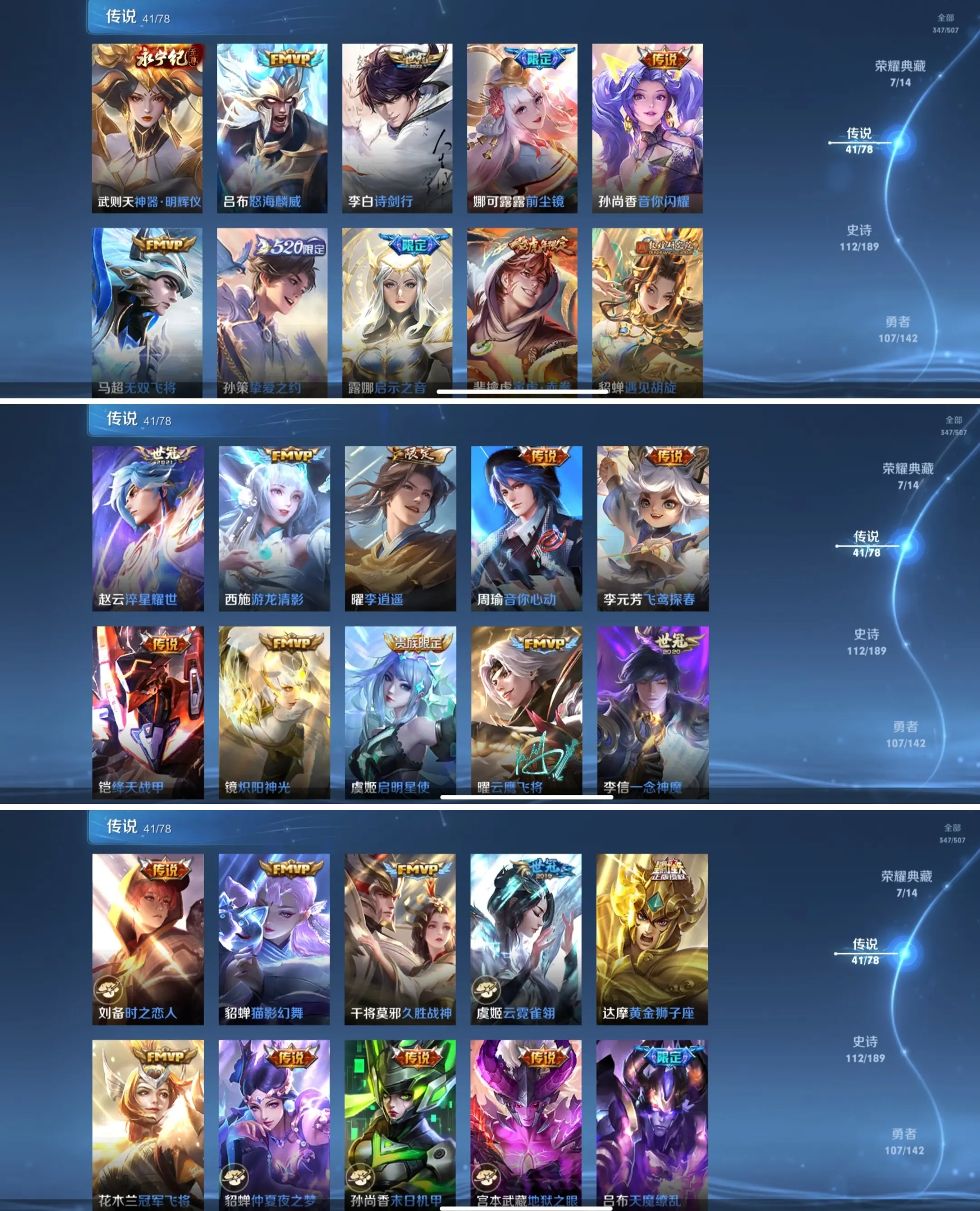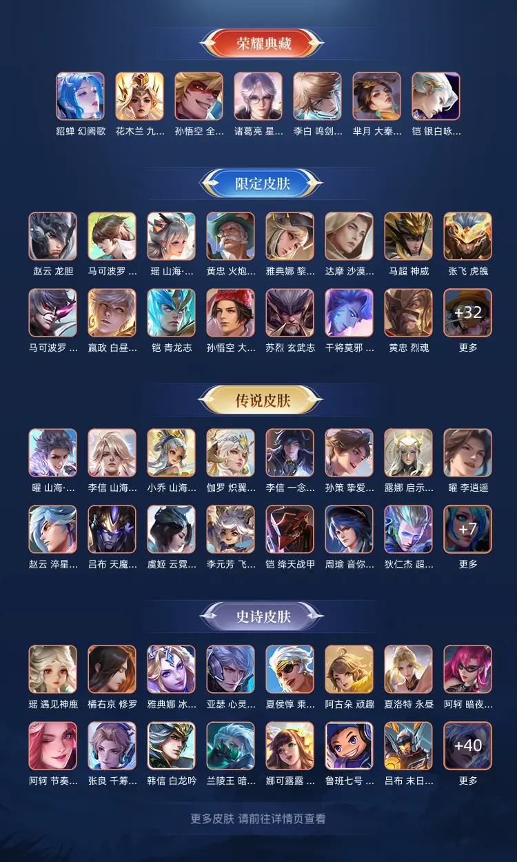 【传说限定】:无双飞将/前尘镜/神器明辉仪/冰霜神祇/齐天大圣/山海碧波行/山海玄木吟/山海苍雷引/山海琳琅生/山海炽霜斩/无限倾心女/无限倾心男/炽翼辉光/浮生妄/画中仙/燃星之曲/怒海麟威/诗剑行/李逍遥/天魔缭乱/真爱至上/逐梦之光/青龙志/玄武志/大圣娶亲/冰霜恋舞曲/龙胆/烈魂/神威/虎魄/游龙清影/猪悟能/遇见胡旋/
