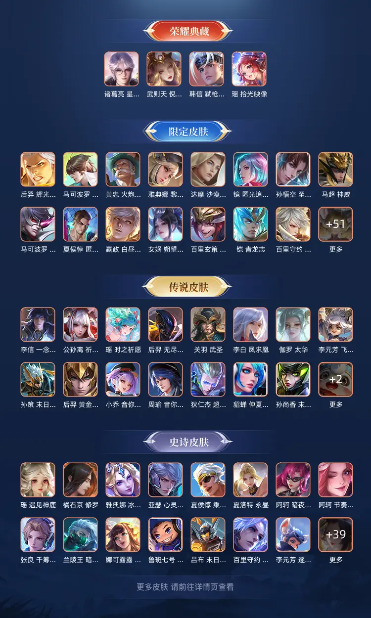 本游戏账号: V10用户,基础段位:最强王者,英雄多,皮肤多。典藏皮肤3个,感受典藏皮肤带来的优质体验快感,FMVP皮肤4个,尽情享受FMVP皮肤带来的主角光环, 私人所属英雄皮肤有:韩信 弑枪猎影||诸葛亮 星域神启||武则天 倪克斯神谕吕布 遇见神鼓||孙悟空 齐天大圣||狄仁杰 超时空战士||孙尚香 末日机甲||公孙离 祈雪灵祝||李白 凤求凰||桑启 鸣野蒿||关羽 武圣||孙策 末日机甲||云缨 鹤归松栖||伽罗 太华||李信 一念神魔||大乔 时之奇旅||虞姬 启明星使||瑶 时之祈愿||艾琳 觅芳踪||鲁班七号 时之奇旅||李元芳 飞鸢探春||兰陵王 影龙天霄||貂蝉 仲夏夜之梦||后羿 无尽星芒||后羿 黄金射手座||小乔 音你心动||宫本武藏 地狱之眼||梦奇 胖达荣荣||周瑜 音你心动,等等