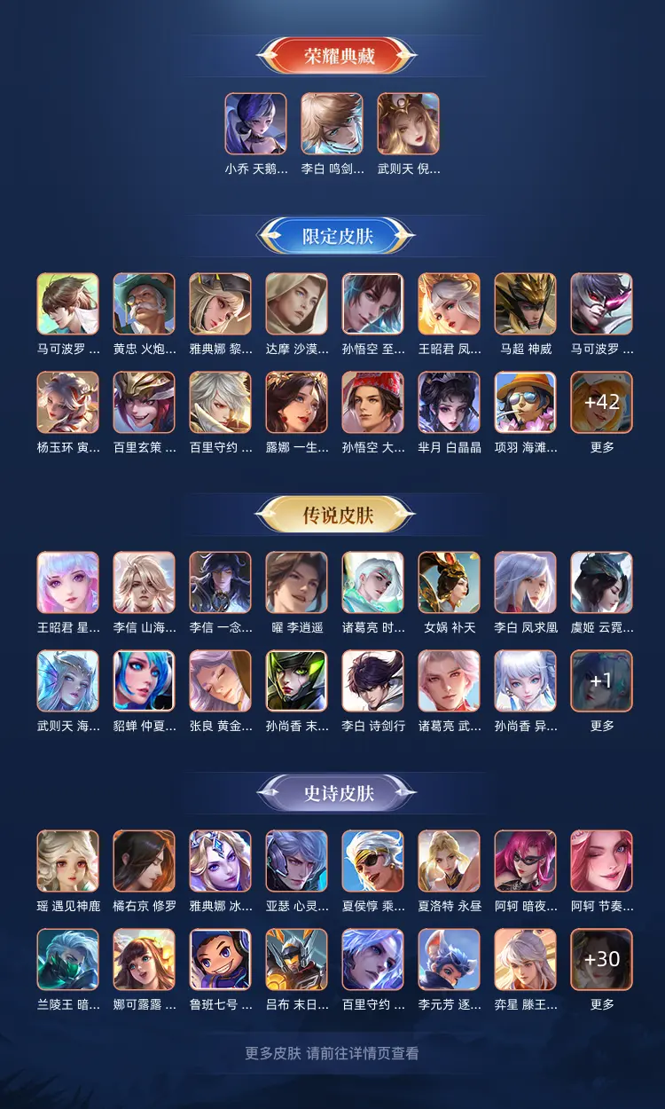 本游戏账号: V10用户,基础段位:至尊星耀V,英雄多,皮肤多。典藏皮肤3个,感受典藏皮肤带来的优质体验快感,FMVP皮肤7个,尽情享受FMVP皮肤带来的主角光环, 私人所属英雄皮肤有:李白 鸣剑·曳影||武则天 倪克斯神谕||小乔 天鹅之梦孙尚香 末日机甲||澜 电玩·雷克斯||李白 诗剑行||武则天 海洋之心||貂蝉 仲夏夜之梦||张良 黄金白羊座,等等