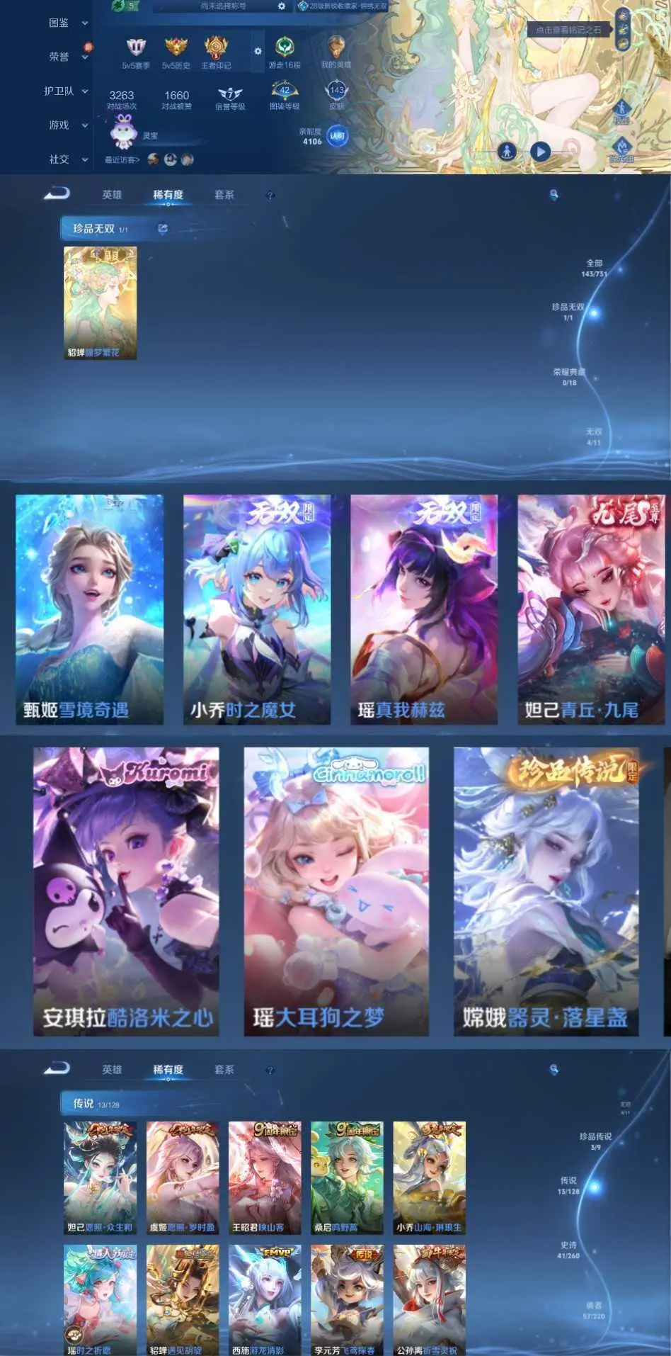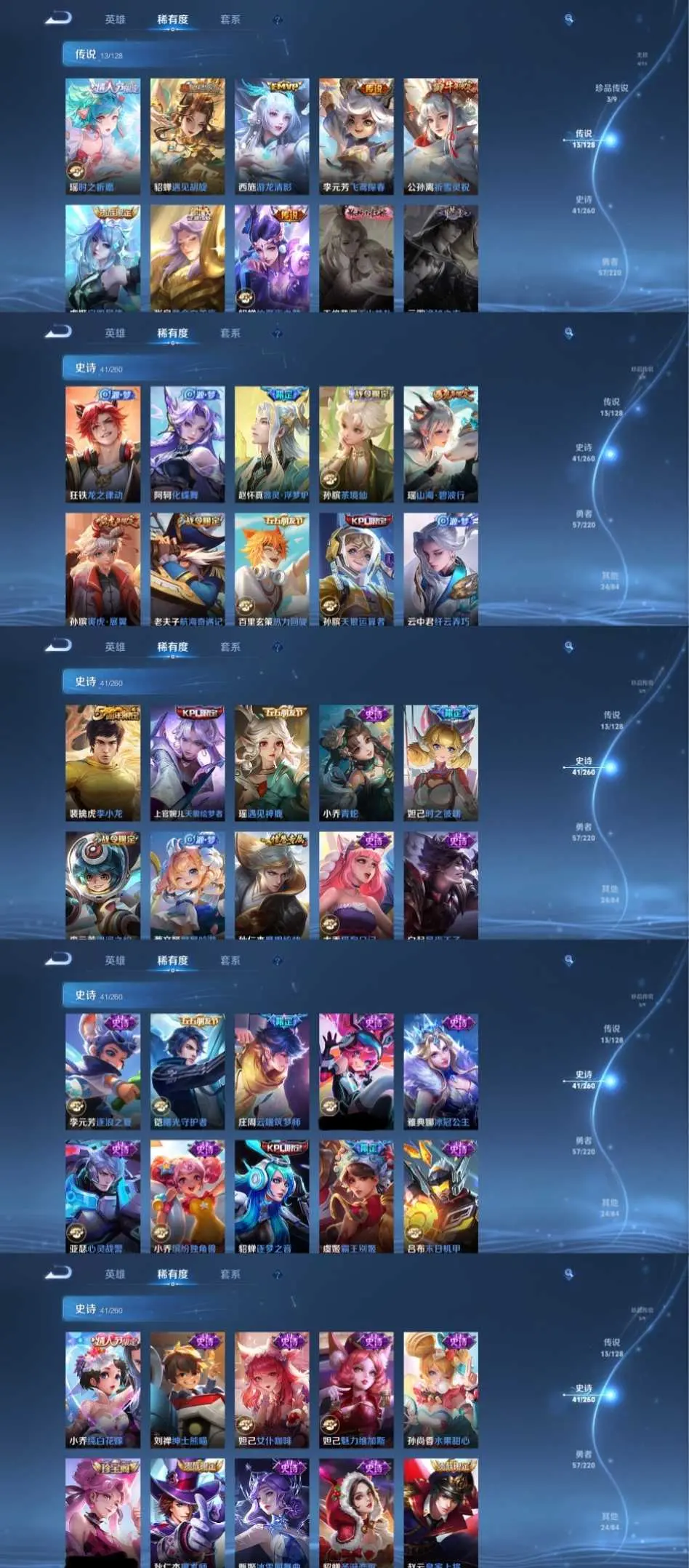 该号英雄127个皮肤148个,珍品无双1个,无双4个,珍品传说3个,传说14个,史诗41个,祝你游戏愉快~