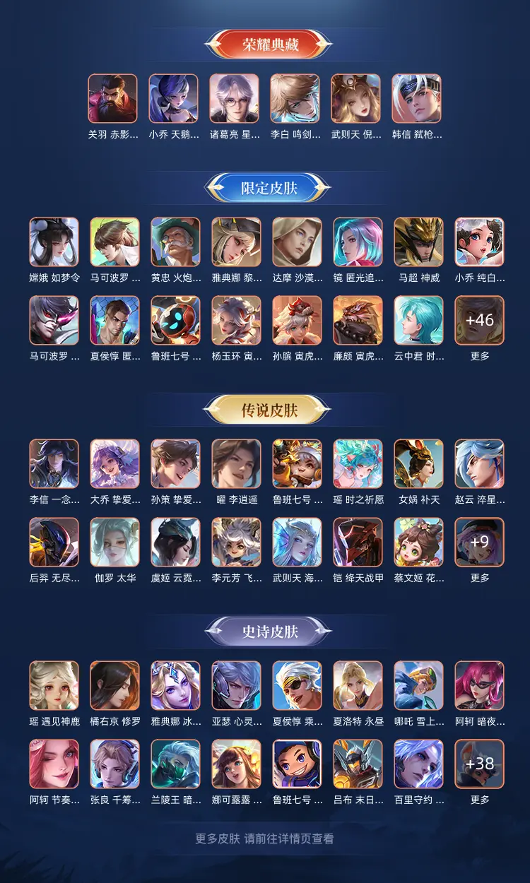 本游戏账号: ,英雄多,皮肤多。典藏皮肤5个,星传皮肤2个,感受精典皮肤带来的体验快感,FMVP皮肤5个,尽情享受FMVP皮肤带来的主角光环, 私人所属英雄皮肤有:关羽 赤影疾锋||李白 鸣剑·曳影||诸葛亮 星域神启||武则天 倪克斯神谕||小乔 天鹅之梦李信 一念神魔||孙尚香 异界灵契||诸葛亮 武陵仙君||孙悟空 齐天大圣||李元芳 飞鸢探春||大乔 挚爱花嫁||狄仁杰 超时空战士||王昭君 乞巧织情||后羿 无尽星芒||虞姬 云霓雀翎||虞姬 启明星使||武则天 海洋之心||花木兰 燃星之曲||貂蝉 仲夏夜之梦||貂蝉 遇见胡旋||瑶 时之祈愿||张良 黄金白羊座||孙策 挚爱之约||项羽 无限倾心||蔡文姬 花朝如约||赵云 淬星耀世||鲁班七号 寅虎·瑞焰||女娲 补天||曜 李逍遥||小乔 音你心动||艾琳 觅芳踪||裴擒虎 寅虎·赤拳||铠 绛天战甲||伽罗 太华||亚瑟 追逃游戏||宫本武藏 地狱之眼等。