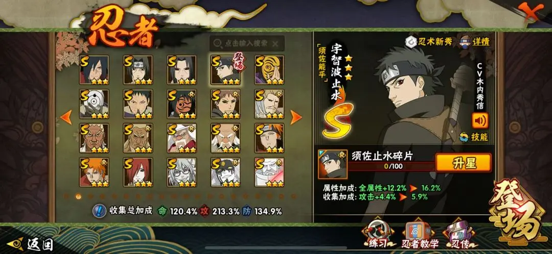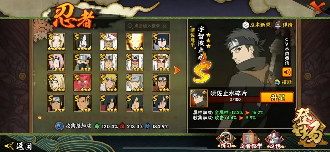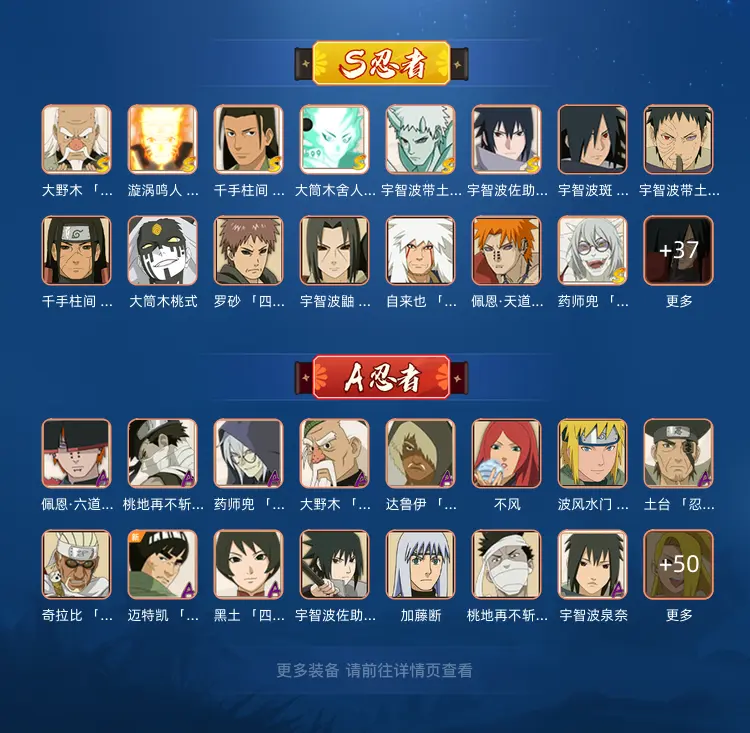 S忍者:大筒木金式;艾 「四代目雷影」;迈特凯 「死门」;自来也 「舞之豪杰」;佩恩·天道 「超」;纲手 「百豪」;艾 「三代目雷影」;宇智波斑 「木叶创立」;自来也;神秘面具男 「红夜之刃」;罗砂 「四代目风影」;猿飞日斩;宇智波带土 「忍界大战」;药师兜 「仙人模式」;“宇智波斑” 「白面具」;鬼灯幻月 「二代目水影」;宇智波鼬 「须佐能乎」;大野木 「三代目土影」;宇智波佐助 「永恒万花筒」;神秘面具男;千手柱间 「秽土转生」;大野木 「忍界大战」;大蛇丸;波风水门;宇智波斑;漩涡鸣人 「九喇嘛连结」;纲手;宇智波斑 「秽土转生」;宇智波鼬 「秽土转生」