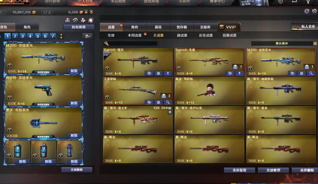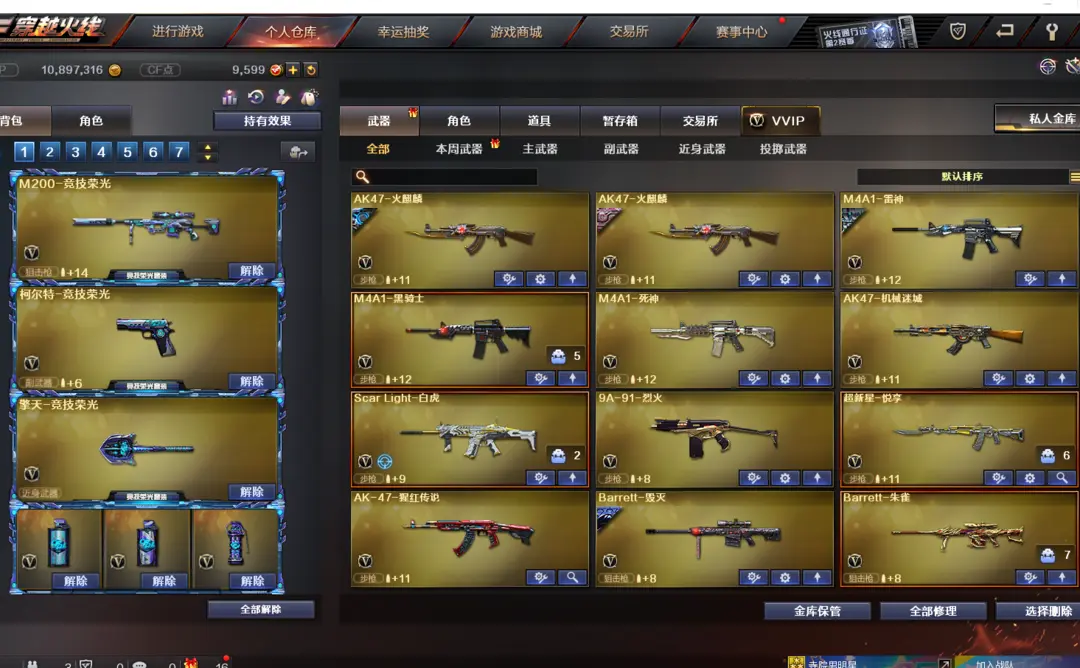 本游戏账号:英雄武器35个; 王者武器7个。 装备不多,但是主武器、副武器、近身武器够用 拥有完美游戏体验。重要的是,特殊装备有:闪光弹-竞技荣光、擎天-竞技荣光、麒麟刺、M200-竞技荣光、USP-雷暴、柯尔特-竞技荣光、AK47-火麒麟、烟雾弹-竞技荣光、加特林-炼狱、炫金火麒麟、堕天使、生化弹匣、等,随意畅选。