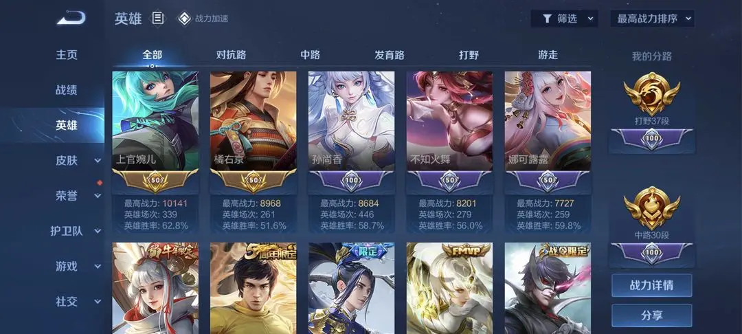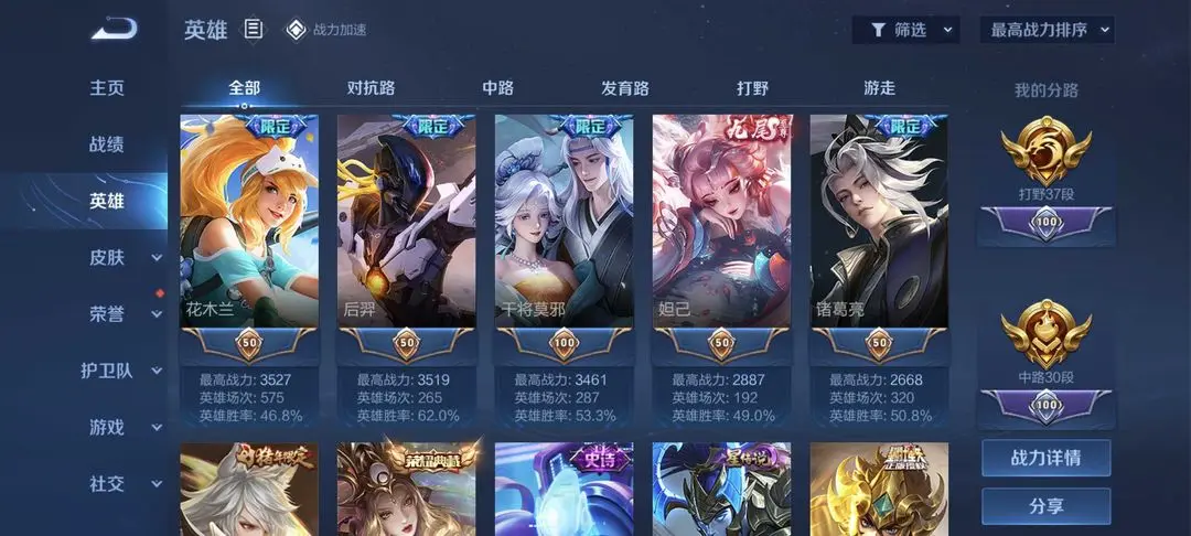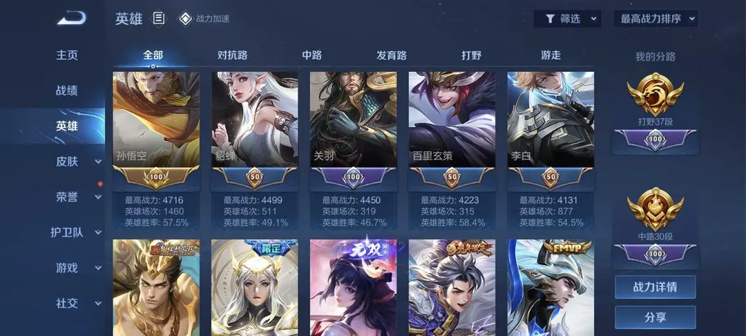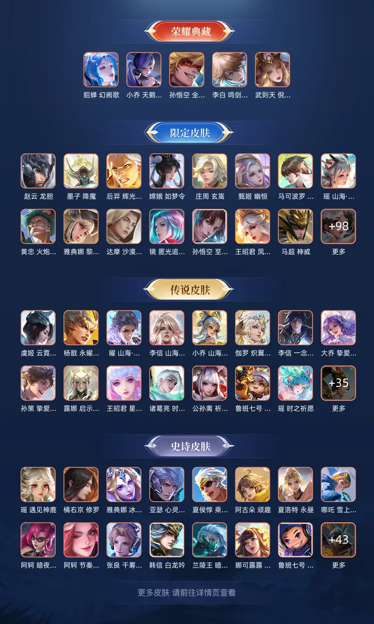 本游戏账号: V10用户,基础段位:至尊星耀II,英雄多,皮肤多,英雄皮肤121个,以孙悟空、武则天、项羽、太乙真人为代表的限定皮肤134个,以王昭君、小乔、虞姬张飞等为代表的传说皮肤81个,以杨玉环、周瑜、庄周、赵云、张良等为代表的史诗皮肤70个。典藏皮肤5个,星传皮肤5个,FMVP皮肤9个,三大金标:上官婉儿丶至尊宝悟空、橘右京;三大飞将:云鹰飞将曜、无双飞将马超、冠军飞将花木兰。尽情享受精选皮肤带来的优质体验,同时尽享FMVP皮肤带来的主角光环。 私人所属英雄皮肤有:|李白 鸣剑·曳影||武则天 倪克斯神谕||貂蝉 幻阙歌|孙悟空 全息碎影||小乔 天鹅之梦,等等