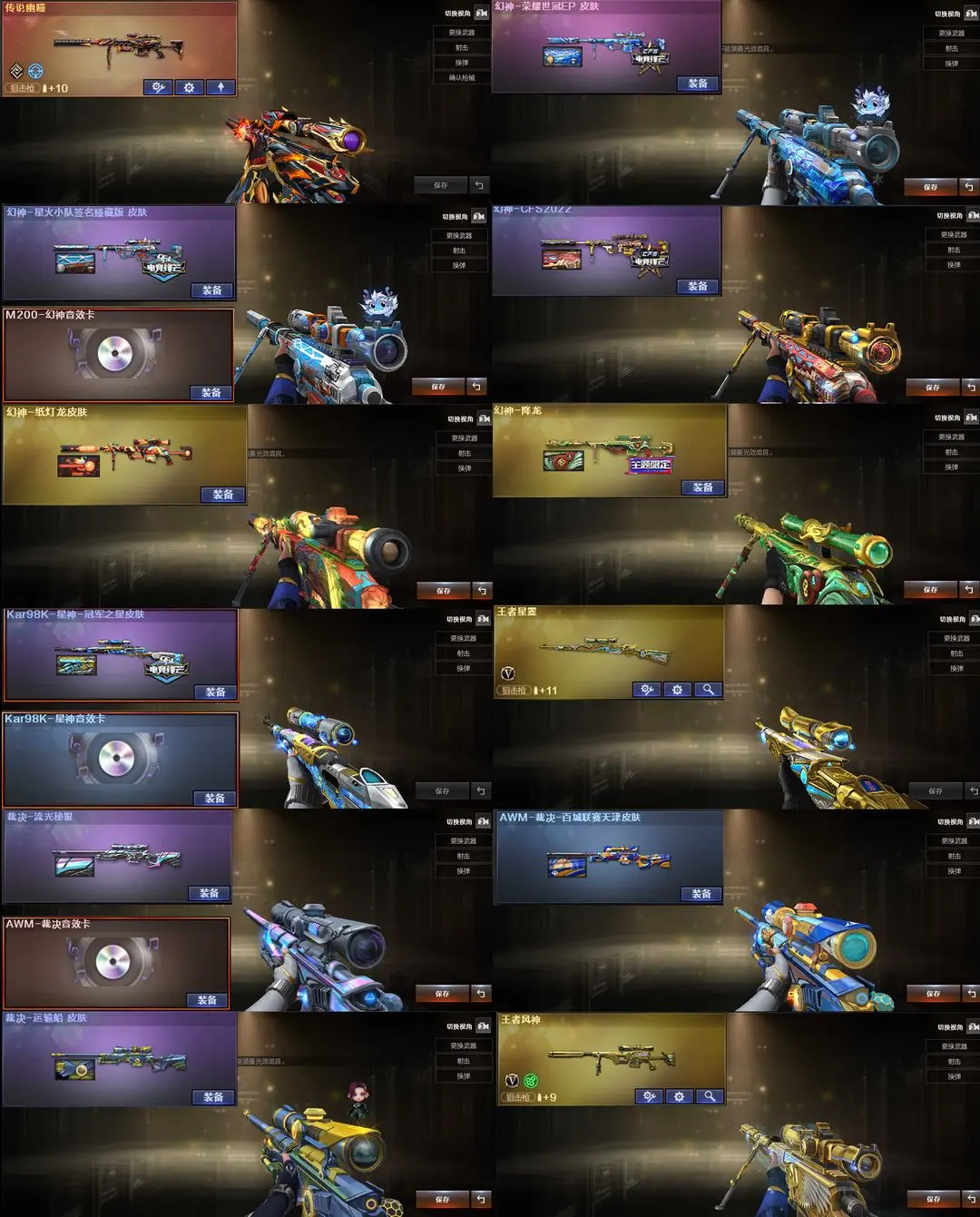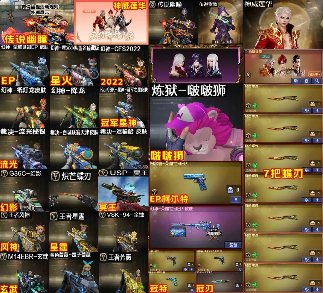 【装备道具】:传说影煞/传说幽瞳/传说幽冥★幻神-荣耀世冠EP 皮肤/幻神-纸灯龙皮肤/幻神-星火小队签名臻藏版 皮肤/幻神-降龙/幻神-CFS2022/Kar98K-星神-冠军之星皮肤/裁决-运输船 皮肤/裁决-流光秘银/AWM-裁决-百城联赛天津/冠军之心火麒麟-巅峰荣耀/雷神-仲达白露/雷神-R.LGD冠军/雷神-白鲨/金色蔷薇-量子蔷薇/屠龙-巅峰荣耀 皮肤/屠龙-荣耀之锋/屠龙-星火燎原/幻神音效卡/星神音效卡/金色蔷薇音效卡/白虎-盛典舞曲音效卡/朱雀音效卡/玄武音效卡/雷神音效卡/黑骑士音效卡/火麒麟音效卡/毁灭音效卡/裁决音效卡/极光音效卡/炼狱-百战金芒★星神-炽天使/王者星霆/王者星光/王者雷影/王者风势/王者猎神/VSK-94-金蚀/王者风神-觉醒版/柯尔特-荣耀世冠EP/USP-冥王/柯尔特-荣耀世冠白鲨2023/屠龙-电竞之星/G36C-幻影/王者芳薇-觉醒版/COP雷霆王者/柯尔特-冠军之特/HK417-朱雀/M14EBR-玄武/★98K-星神/AWM-裁决★雷霆王者套装★炫/荒漠琉璃/关小雨/_晴雅/雨墨/幻面灵狐/王者炫/王者潘多拉/6盘龙炼狱
