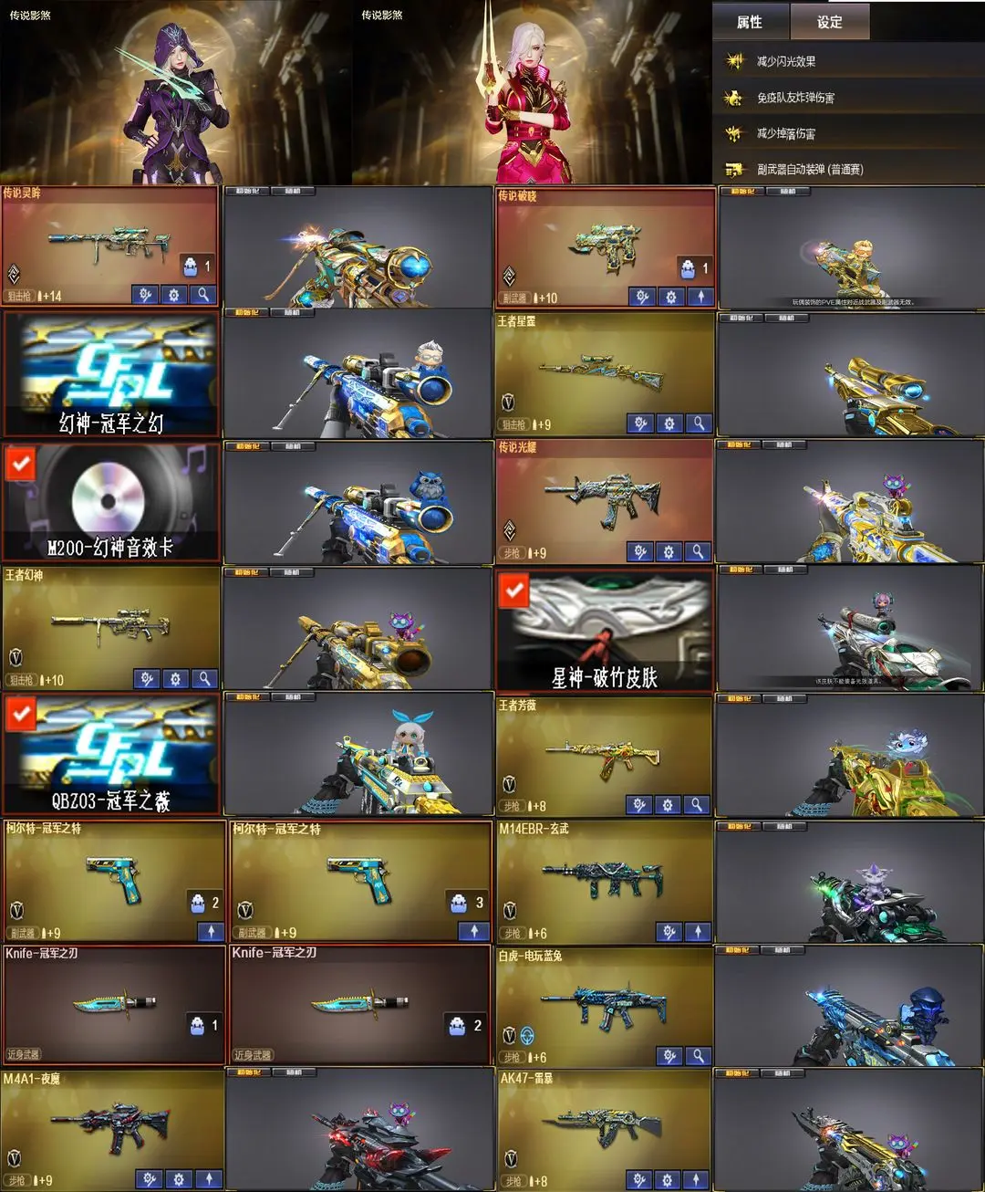 装备道具:传说灵眸/幻神三件套/幻神/幻神音效卡/幻神冠军之幻/王者幻神/觉醒版/星神/星神破竹/王者星霆/传说影煞/传说光耀/传说破晓/(/OBZ三件套/0BZ金色蔷薇/0BZ热带奇洋音效卡/0BZ冠军之薇/】/王者芳薇/觉醒版/白虎电玩蓝兔/M14EBR-玄武/6烈龙/斯泰尔蝴蝶/Knife-冠军之刃*2/(/四防角色/王者春/王者潘多拉/】 /USP雷暴*2/荣耀世冠柯尔特*2/柯尔特冠军之特*2/COP堕天神*2/雷暴手雷套*7/夜魔手雷套*5/电竞装甲手雷套/荣耀世冠雷神/雷神音效卡/雷神宠儿/雷神荣耀之魄/雷神冠军之魄/黑骑士音效卡/黑骑士冠军之势/毁灭音效卡/毁灭AG15冠军/毁灭冠军之怒/火麒麟冠军之心/火麒麟轻羽★雷神星空★裁决流光秘银★宠儿雷神★毁灭星空★AG战队★王者潘多拉★王者春★迷迭香★春★王者玲珑★魅影★职业选手★王者芳薇★王者之心★王者冰魄★王者之烈★王者之魄★王者之灵★王者之锋★王者之啸★变异宝贝对讲机不退包★佣兵觉醒无需换弹手斧镜减速雷★捕食者查看血量