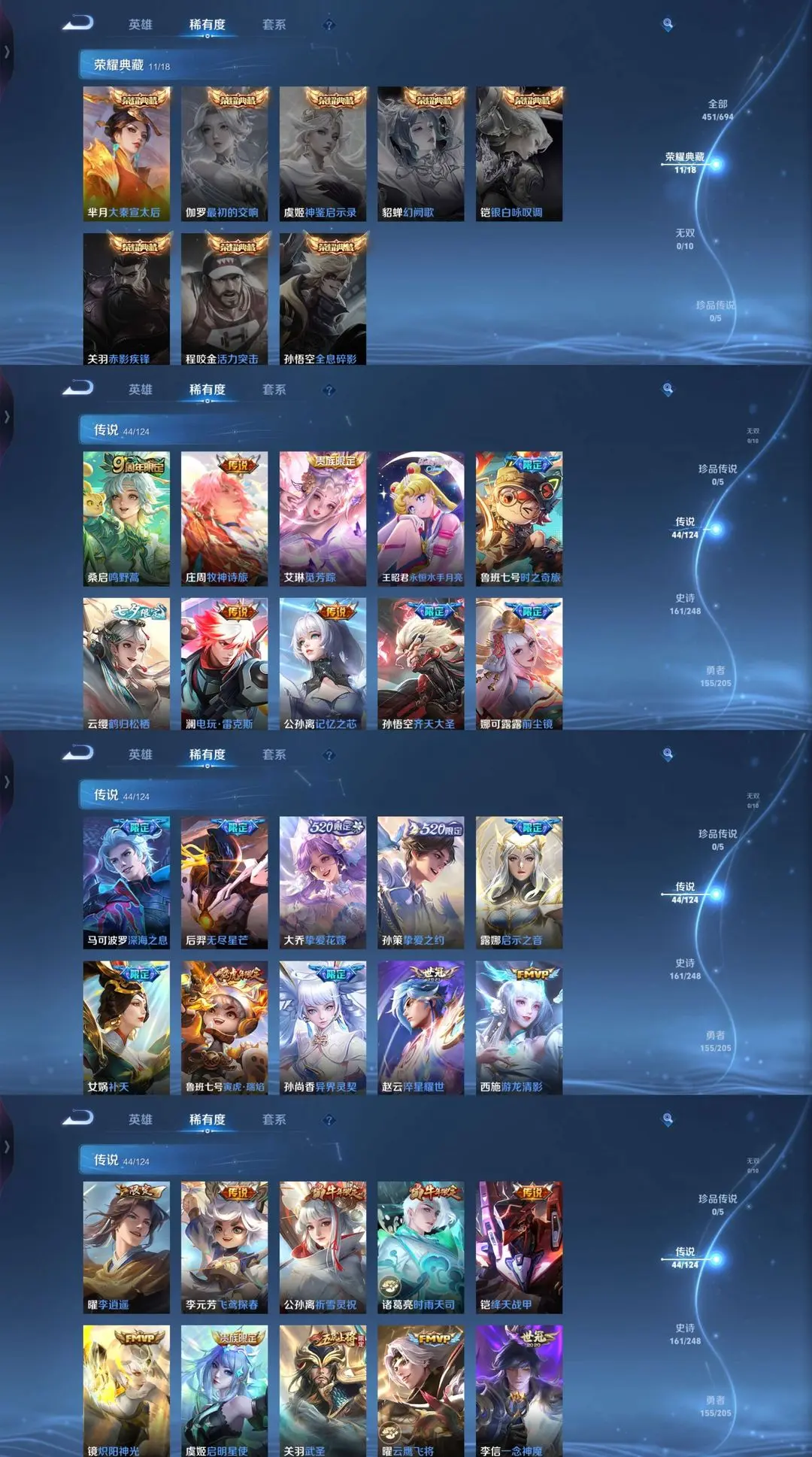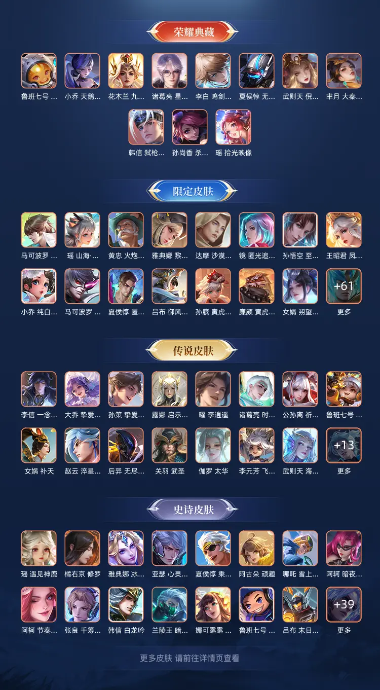 【44 传说皮肤】胖达荣荣 梦奇,鹤归松栖 云缨,武圣 关羽,永恒水手月亮 王昭君,启明星使 虞姬,前尘镜 娜可露露,电玩·雷克斯 澜,飞鸢探春 李元芳,李逍遥 曜,云鹰飞将 曜,齐天大圣
