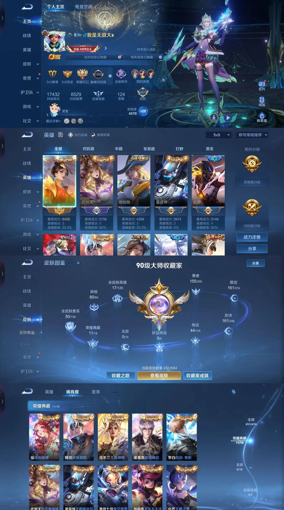 【11 典藏皮肤】鸣剑·曳影 李白,杀手不太冷 孙尚香,天鹅之梦 小乔,倪克斯神谕 武则天,星空梦想 鲁班七号,弑枪猎影 韩信,无限飓风号 夏侯惇,九霄神辉 花木兰,大秦宣太后 芈月,星域神启 诸葛亮,拾光映像 瑶,