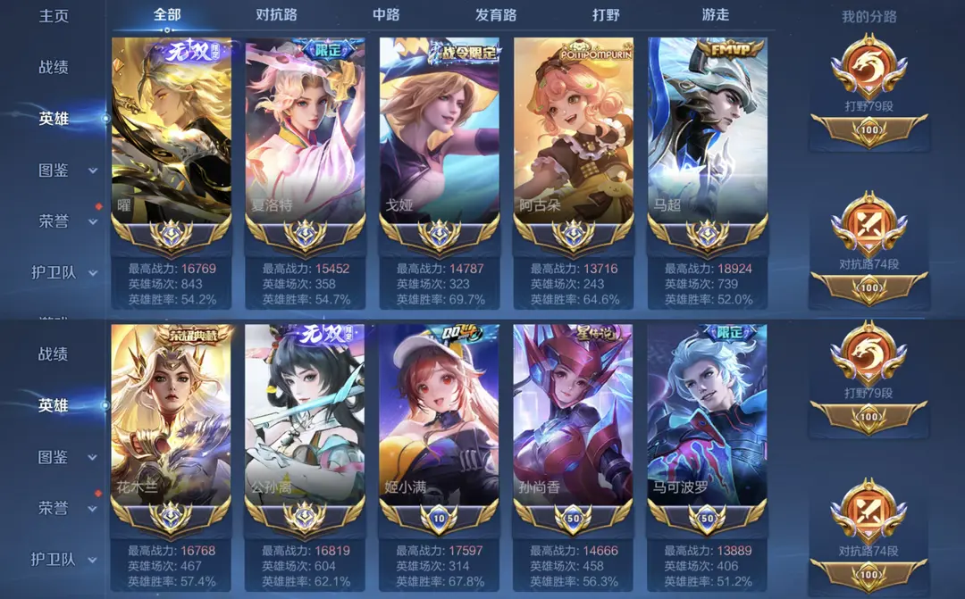 7大国标✨打野80段✨大国标马超✨大国服曜公孙离✨18典藏/11无双✨5小国✨孙悟空无相✨对抗70段