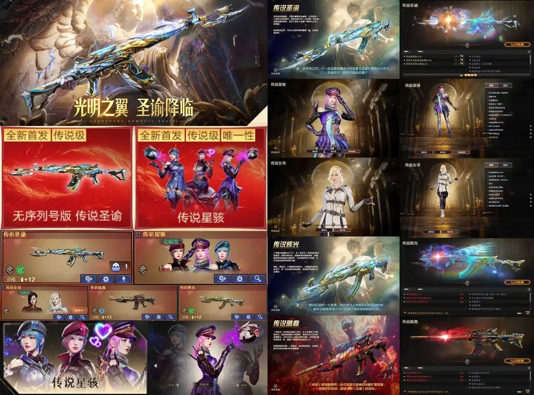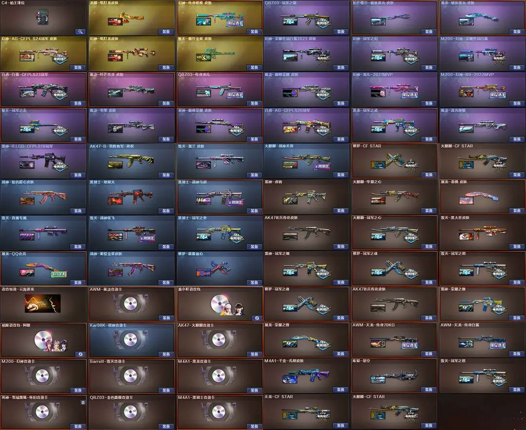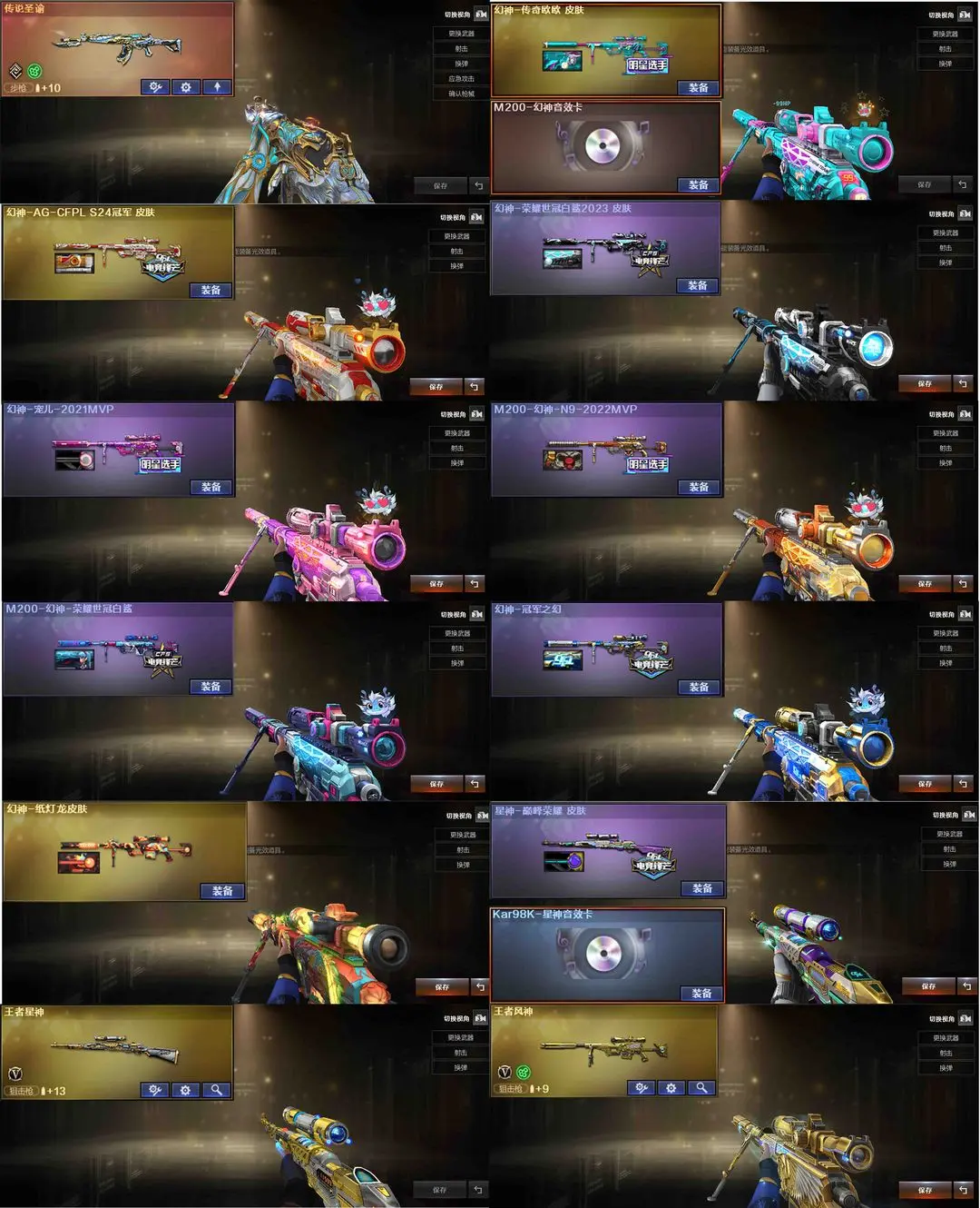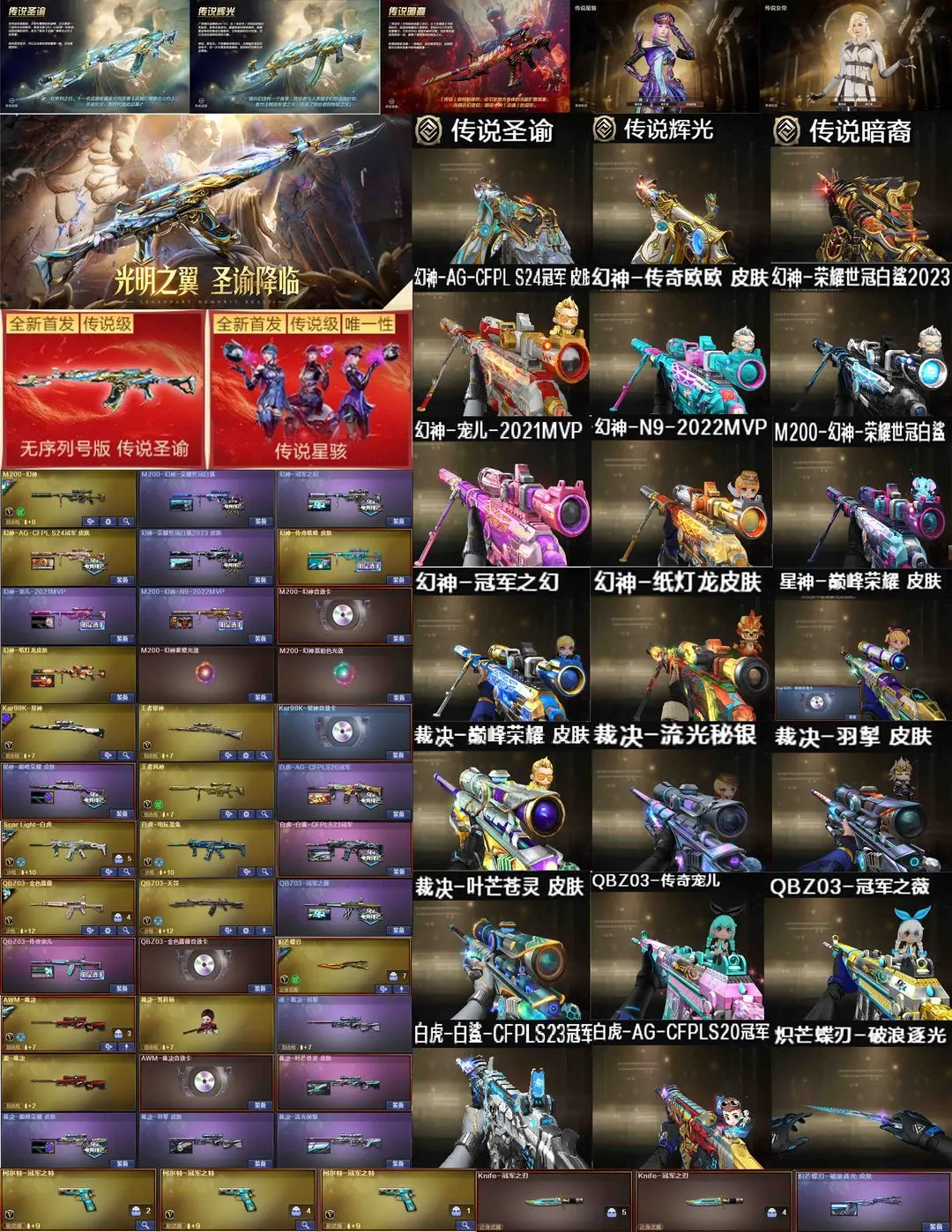 【装备道具】:传说圣谕/传说星骇/传说暗裔/传说辉光/传说女帝★幻神-纸灯龙皮肤/幻神-AG-CFPL S24冠军 皮肤/幻神-欧欧 皮肤/M200-幻神-荣耀世冠白鲨/幻神-荣耀世冠白鲨2023 皮肤/M200-幻神-N9-2022MVP/幻神-宠儿-2021MVP/幻神-冠军之幻/星神-巅峰荣耀 皮肤/白虎-白鲨-CFPLS23冠军/白虎-AG-CFPLS20冠军/QBZ03-冠军之薇/QBZ03-传奇宠儿/裁决-叶芒苍灵 皮肤/裁决-流光秘银/裁决-巅峰荣耀 皮肤/裁决-羽掣 皮肤/屠龙-破浪逐光/炽芒蝶刃-破浪逐光/擎天-傲竹金蛇/裁决音效卡/98K-星神音效卡/M200-幻神音效卡/黑骑士音效卡/黑龙音效卡/QBZ03-金色蔷薇音效卡/毁灭音效卡/火麒麟音效卡/毁灭-直播专属 /雷神-冠军之魄/雷神-荣耀之魄/荣耀世冠-柯尔特/柯尔特-冠军之特(3)/柯尔特-竞技荣光/USP-雷暴/幻灵之锋/王者之锋/炽芒蝶刃/柯尔特-荣耀世冠白鲨2023/QBZ03-天罚/HK417-朱雀/白虎-电玩蓝兔/王者星神-觉醒版/AWM-裁决★炫/电竞教官-云悠悠/枪娘樱/雪域霜狐/王者-救世主