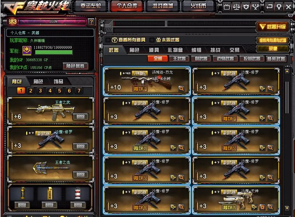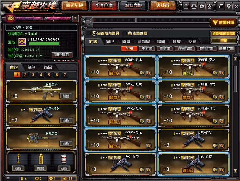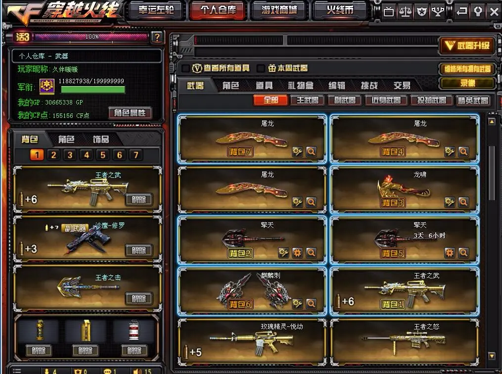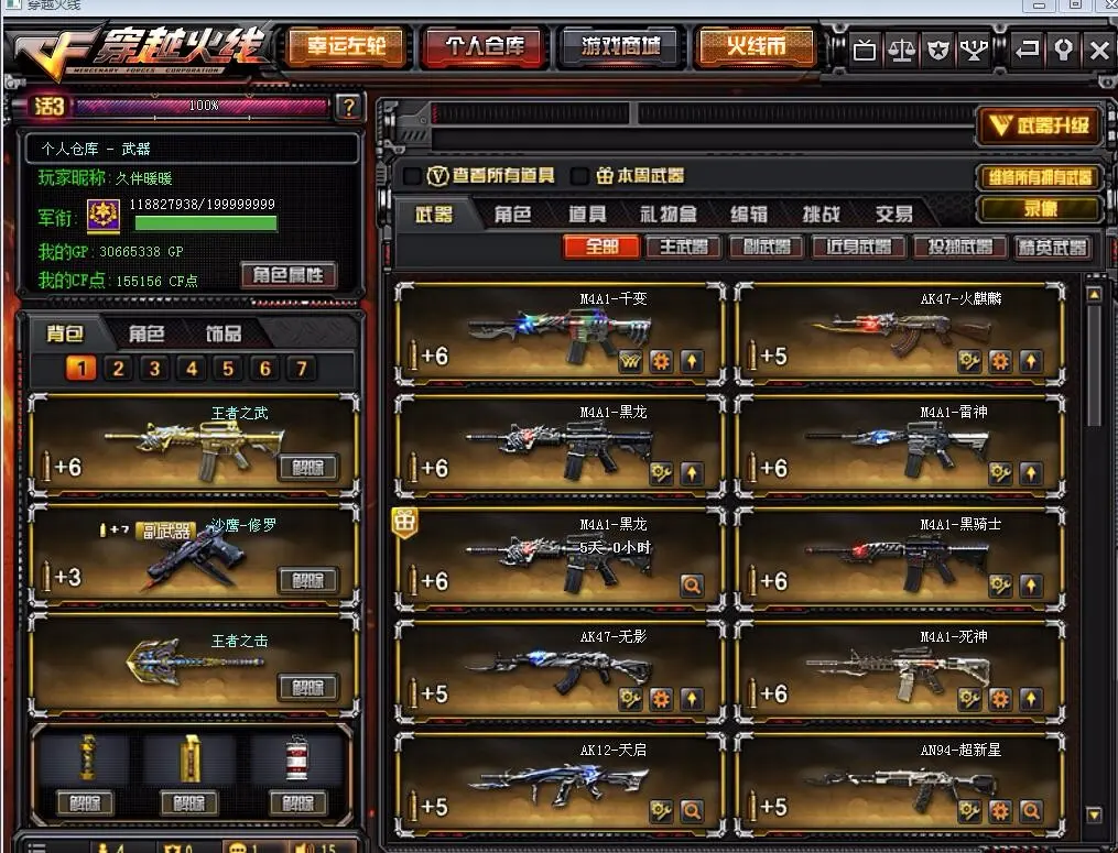 本游戏账号:英雄武器37个; 王者武器4个。 装备不多,但是主武器、副武器、近身武器够用 拥有完美游戏体验。重要的是,特殊装备有:M4A1-玫瑰精灵、AK47-火麒麟、麒麟刺、玫瑰精灵-悦动、王者之武、王者之怒、王者之击、堕天使、等,随意畅选。