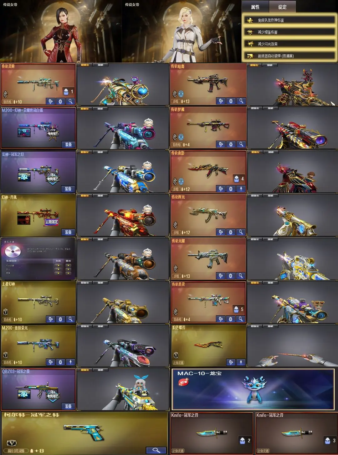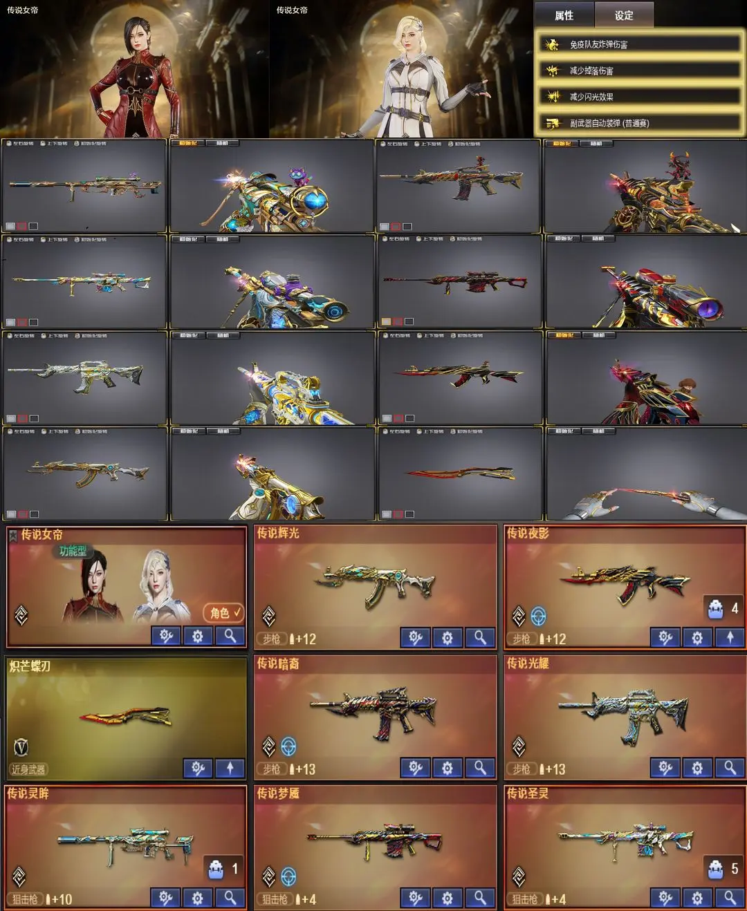 【装备道具】:传说暗裔/传说夜影/传说辉光/传说光耀/传说梦魇/传说圣灵/传说灵眸★幻神黄忠/幻神世冠白鲨/幻神冠军之幻/幻神丹凤/毁灭CFPL冠军/雷神R.LGDCFPLS18冠军/雷神荣耀世冠AG/火麒麟荣耀世冠AG/QBZ03冠军之薇/传说女帝 ★M200-幻神/M200-竞技荣光/王者幻神-觉醒版/Barrett-毁灭(6)/Barrett-极光/竞技荣光套装/夜魔套装/雷暴套装/M200-幻神音效卡/M4A1-黑骑士音效卡/火麒麟音效卡/毁灭音效卡/雷神音效卡★竞技荣光套装/夜魔套装/雷暴套装★王者幻神-觉醒版★斯泰尔-蝴蝶★炼狱-迷你小钢★M37-葵★龙宝★雷神火麒麟-荣耀世冠AG★荣耀之怒★毁灭耀金★雷神-传奇N9★雷神-宠儿-2019MVP★雷神-白鲨皮肤★荣耀之魄★白虎-电玩粉兔★传说女帝/葵/春/炫/樱/荒漠琉璃/魅影/电竞教官-云悠悠/王者玲珑/王者-魅影/王者-葵-貂蝉/王者-救世主/雅典娜/狐影/王者零-传说之路/乔伊教练/灵动武士/职业选手★生化弹夹防化服变异宝贝死亡之眼★佣兵觉醒手斧镜减速雷★捕食者之眼死亡之眼对讲机不退包★无需换弹查看血量★