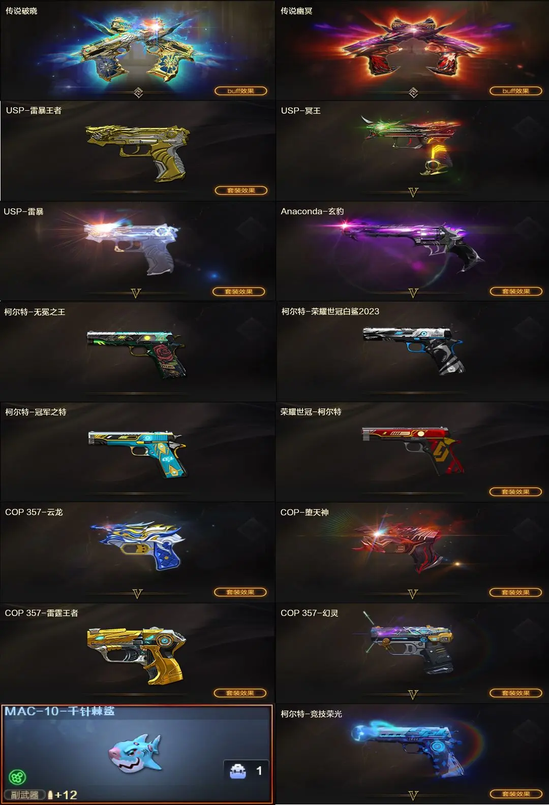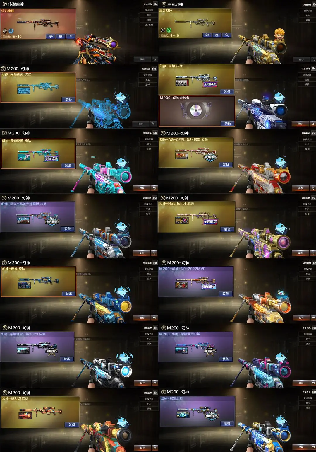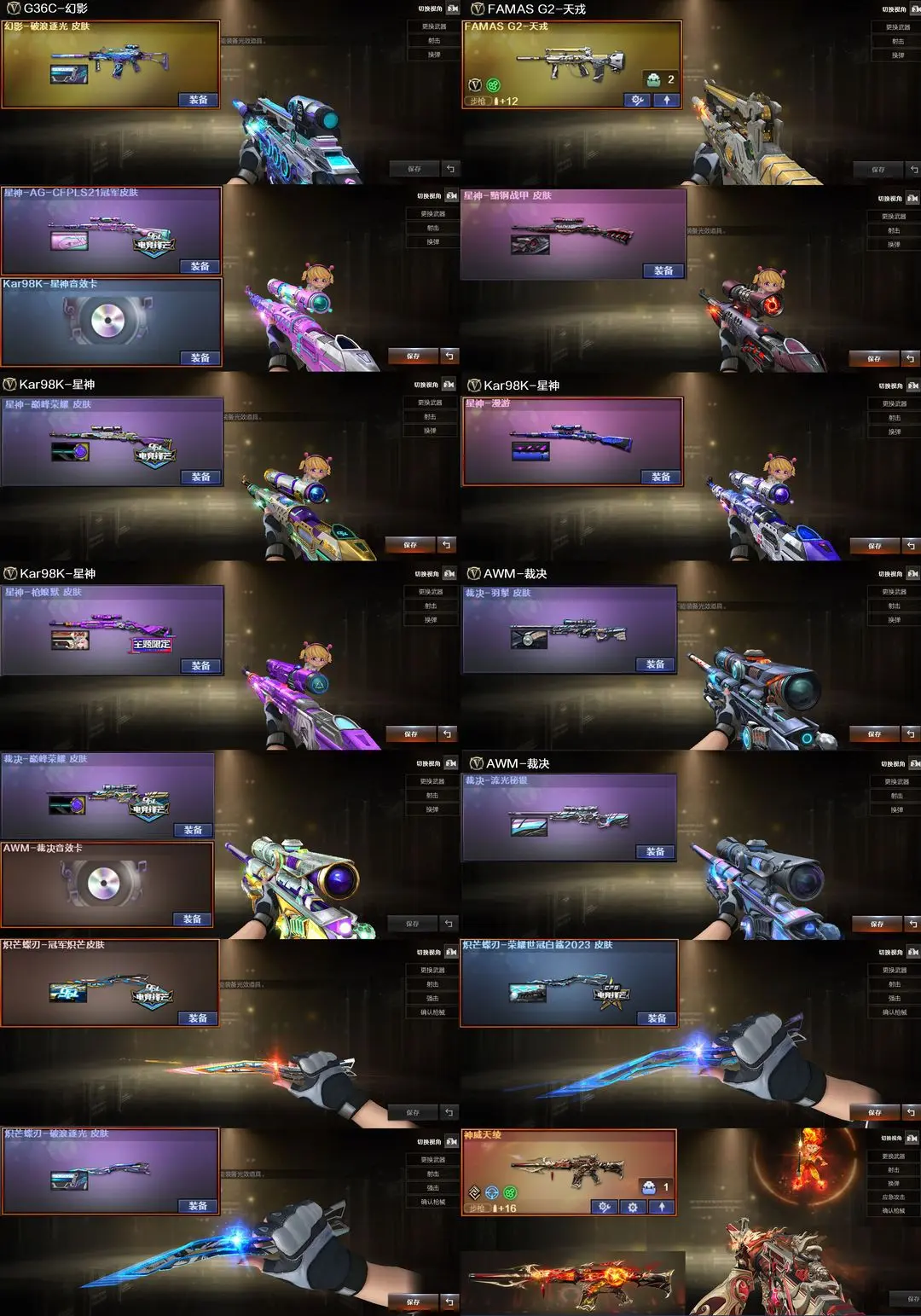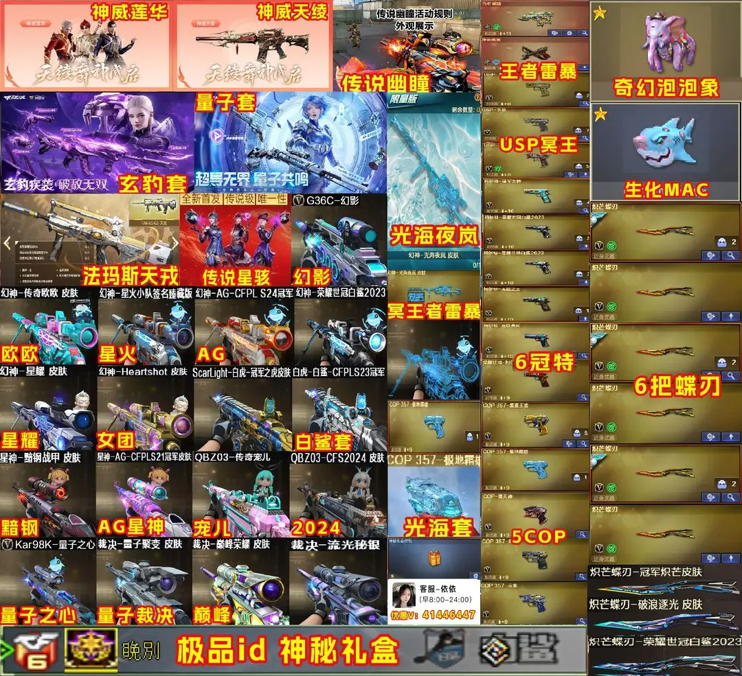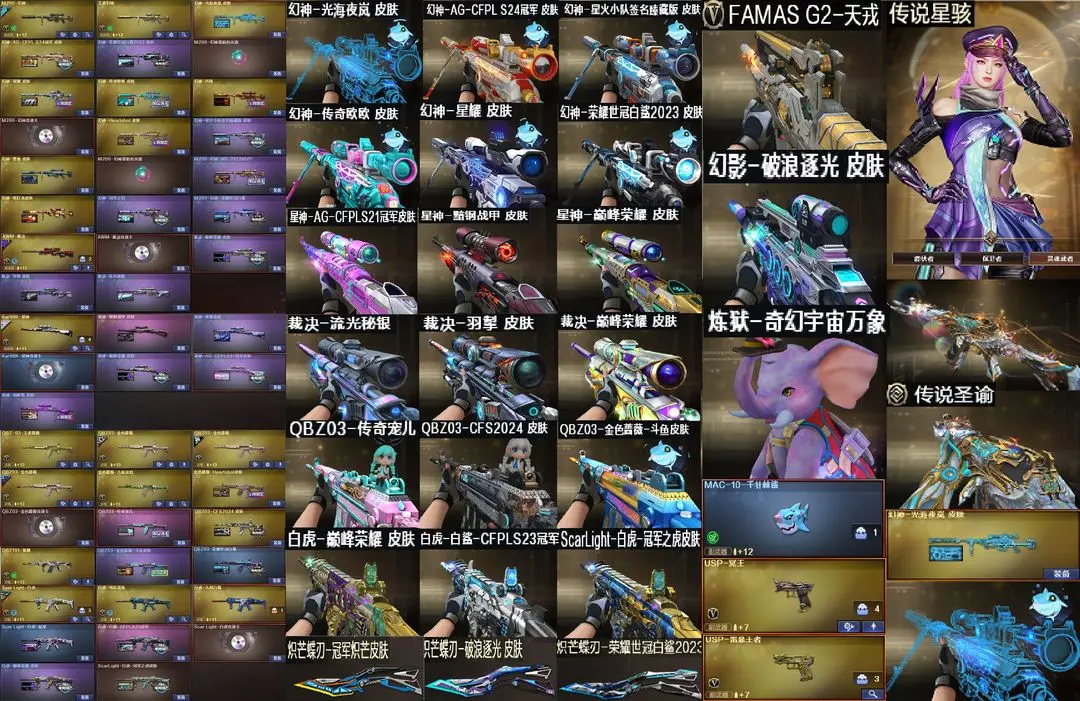 【装备道具】:传说星骇★传说圣谕★神秘礼盒背包金色昵称★光海夜岚幻神皮肤★/传说幽瞳/传说圣灵/传说幽冥/传说破晓★幻神-Heartshot/幻神-纸灯龙/幻神-星火小队签名臻藏版/幻神-AG-S24冠军/幻神-欧欧/幻神-荣耀世冠白鲨/幻神-荣耀世冠白鲨2023/M200-幻神-N9-2022MVP/幻神-冠军之幻/幻神-曹操/幻神-丹凤/幻神-星耀/星神-巅峰荣耀/98K-星神-AG-CFPLS21冠军/星神-枪娘默 皮肤/星神-璀璨★裁决-流光秘银/裁决-巅峰荣耀/裁决-羽掣★幻影-破浪逐光/金色蔷薇-Heartshot/白虎白鲨-S23冠军/Scar-白虎冠军之虎/Scar-白虎暗星/白虎-巅峰荣耀 /QBZ-CFS2024/QBZ-荣耀世冠白鲨/QBZ-传奇宠儿/QBZ-金色蔷薇-斗鱼/炽芒蝶刃-破浪逐光/炽芒蝶刃-荣耀世冠白鲨/炽芒蝶刃-冠军炽芒★裁决音效卡/星神音效卡/幻神音效卡/黑骑士音效卡/金色蔷薇音效卡/白虎音效卡/雷神音效卡/玄武音效卡USP-冥王/Anaconda-玄豹/柯尔特-无冕之王/FAMAS G2-天戎/G36C-幻影/QBZ191-银翼游侠/炼狱泡泡象
