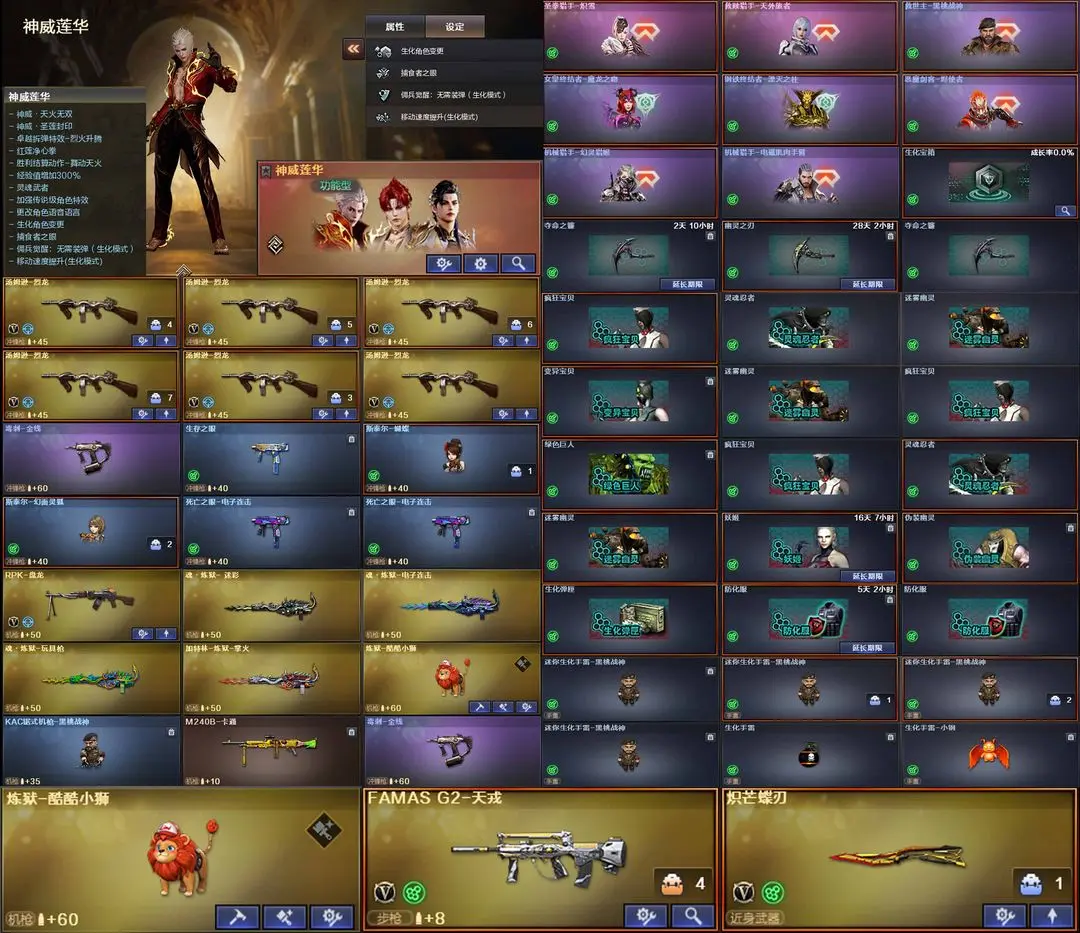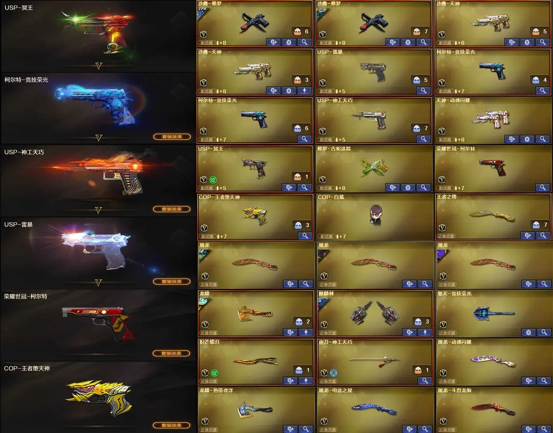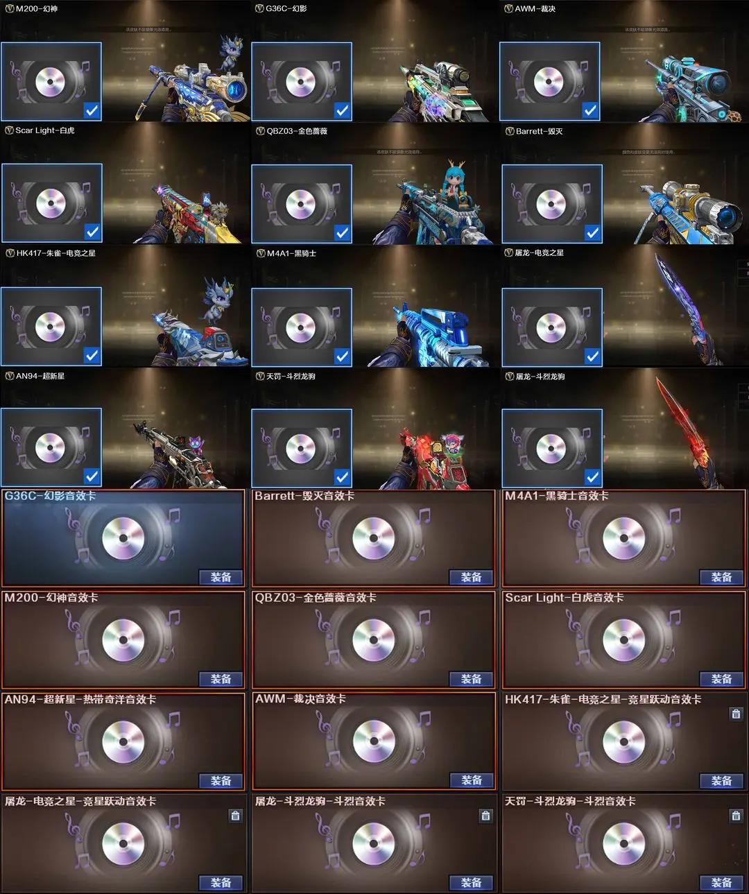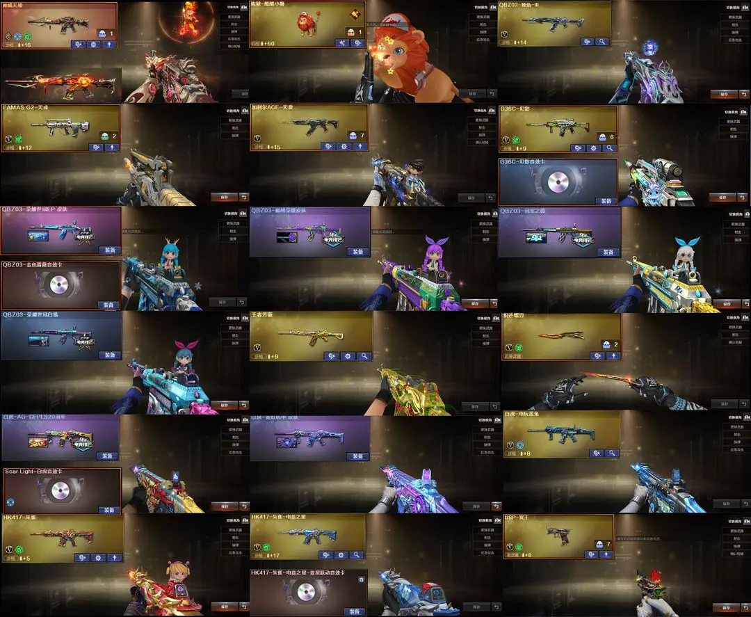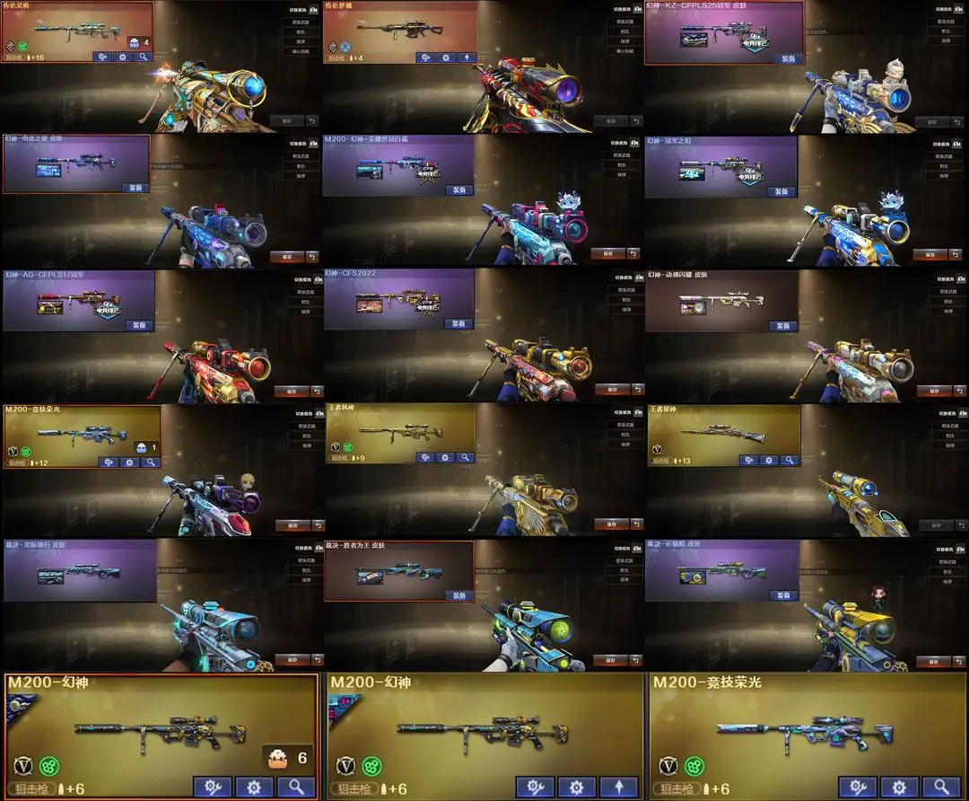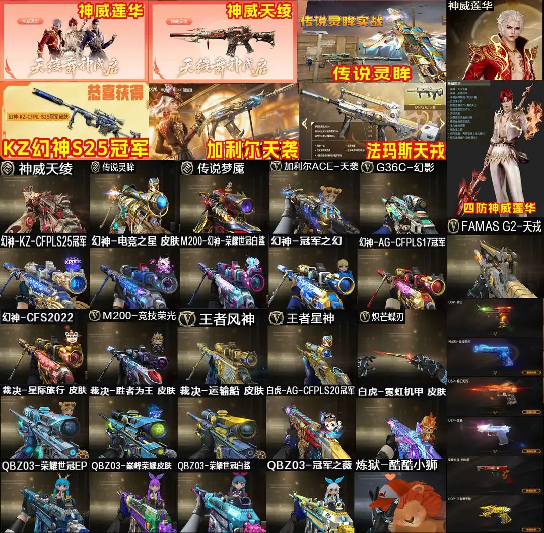 【装备道具】:神威莲华/神威天绫/传说灵眸/传说梦魇★幻神-电竞之星/幻神-动感闪耀/幻神-KZ-CFPLS25冠军/M200-幻神-荣耀世冠白鲨/幻神-冠军之幻/幻神-AG-CFPLS17冠军/幻神-CFS2022/Kar98K-星神-冠军之星/裁决-星际旅行/裁决-胜者为王/裁决-运输船/雷神-R.LGD-CFPLS18冠军/雷神-冠军之魄/雷神-传奇N9/冠军之武/白虎-霓虹机甲/白虎-AG-CFPLS20冠军/QBZ03-荣耀世冠EP/QBZ03-巅峰荣耀/QBZ03-荣耀世冠白鲨/QBZ03-冠军之薇★FAMAS G2-天戎/加利尔ACE-天袭/QBZ03-独角-III/G36C-幻影/王者芳薇/王者风神-觉醒版/USP-冥王/荣耀世冠-柯尔特/柯尔特-竞技荣光(2)/USP-雷暴/USP-神工天巧/scar白虎/白虎-电玩蓝兔/炽芒蝶刃/★幻神音效卡/金色蔷薇音效卡/白虎音效卡/幻影音效卡/裁决音效卡毁灭音效卡★COP-王者堕天神/独角之刃/星神-炽天使/炼狱-酷酷小狮/斯泰尔-幻面灵狐/斯泰尔-蝴蝶/★竞技荣光套装/荣耀世冠套装/电竞教官-云悠悠/隼/王者-魅影/王者影豹