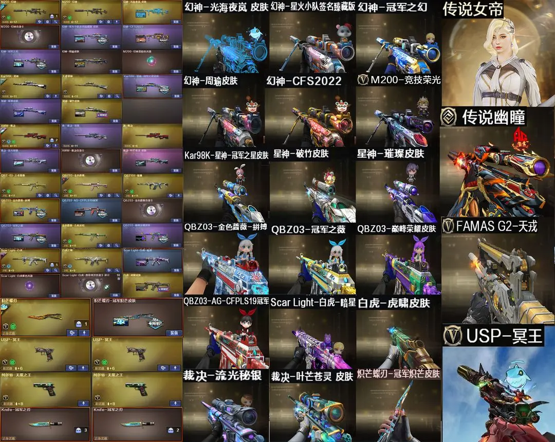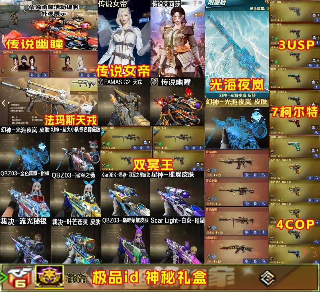 【装备道具】:极品id+神秘礼盒+金色昵称/QBZ金色蔷薇-拼搏/法玛斯天戎/USP-冥王2把/传说女帝/传说艾莉莎/传说夜影/传说辉光/传说暗裔/传说幽瞳/传说梦魇/传说破晓★幻神-光海夜岚/幻神-星火小队签名臻藏版/幻神-冠军之幻/幻神-周瑜皮肤/幻神-CFS2022/Kar98K-星神-冠军之星皮肤/星神-破竹/星神-璀璨/雷神-宠儿/雷神-白鲨/白虎-暗星/白虎-虎啸/QBZ03-巅峰荣耀/QBZ03-AG-CFPLS19冠军/QBZ03-冠军之薇/FAMAS G2-天戎/QBZ191-银翼游侠/★柯尔特-无冕之王2把/COP-幻灵/COP雷霆王者/荣耀世冠-柯尔特/柯尔特-冠军之特/柯尔特-竞技荣光/USP-雷暴/★幻灵套装/雷暴套装/炼狱-百战金芒/王者玄武/炽芒蝶刃/炫/影豹/鹰/关小雨/炼狱-末日审判屠龙-破浪逐光/炽芒蝶刃-冠军炽芒/炼狱-悦蓝/白虎之魄-觉醒版/幻神音效卡/金色蔷薇音效卡/朱雀音效卡/黑骑士音效卡/火麒麟音效卡/毁灭音效卡/AWM-裁决音效卡/炼狱-百战金芒-庆典舞曲音效卡/冠军之刃小刀/跳跳鲨/斯泰尔-蝴蝶/6烈龙毒蜂-死亡之眼/佣兵觉醒捕食者之眼