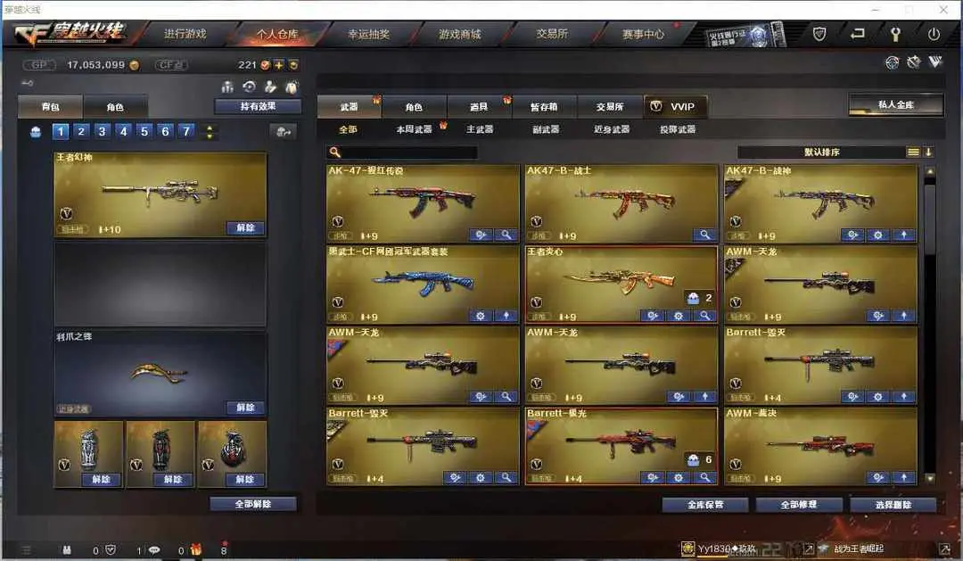 本游戏账号:英雄武器148个; 王者武器23个。 装备不多,但是主武器、副武器、近身武器够用 拥有完美游戏体验。重要的是,特殊装备有:加特林-炼狱、麒麟刺、M200-幻神、AK47-火麒麟、龙啸-堕天神、M4A1-玫瑰精灵、USP-雷暴、炼狱-悦蓝-觉醒版、王者之锋-觉醒版、炫金雷神、王者之光-觉醒版、王者之怒-觉醒版、王者之幻-觉醒版、王者之势-觉醒版、王者之魄-觉醒版、王者之心-觉醒版、炫金毁灭、王者之影、王者之武、王者之力、王者之锋、王者之戮、火麒麟-绝迹、魅影、迷迭香、王者-葵-貂蝉、王者-魅影、堕天使、王者之心金色光效、M4A1-黑骑士音效卡、生化弹匣、炼狱-悦蓝金色光效、王者之魄金色光效、等,随意畅选。