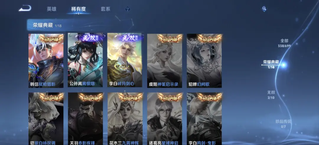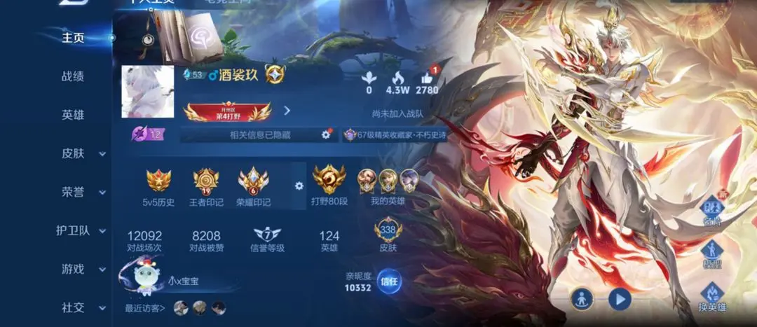 本游戏账号: V10用户,基础段位:至尊星耀III,英雄多,皮肤多。典藏皮肤15个,感受典藏皮肤带来的优质体验快感,FMVP皮肤9个,尽情享受FMVP皮肤带来的主角光环, 私人所属英雄皮肤有:诸葛亮 星域神启||铠 银白咏叹调||孙尚香 杀手不太冷||鲁班七号 星空梦想||芈月 大秦宣太后||夏侯惇 无限飓风号||李白 鸣剑·曳影||武则天 倪克斯神谕||关羽 赤影疾锋||貂蝉 幻阙歌||程咬金 活力突击||韩信 弑枪猎影||花木兰 九霄神辉||孙悟空 全息碎影||小乔 天鹅之梦,等等