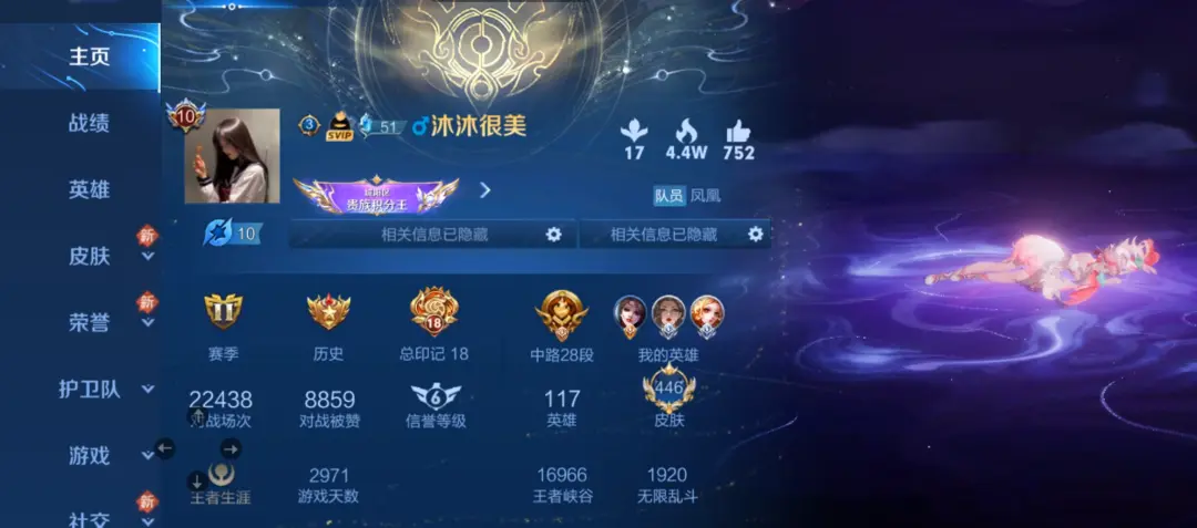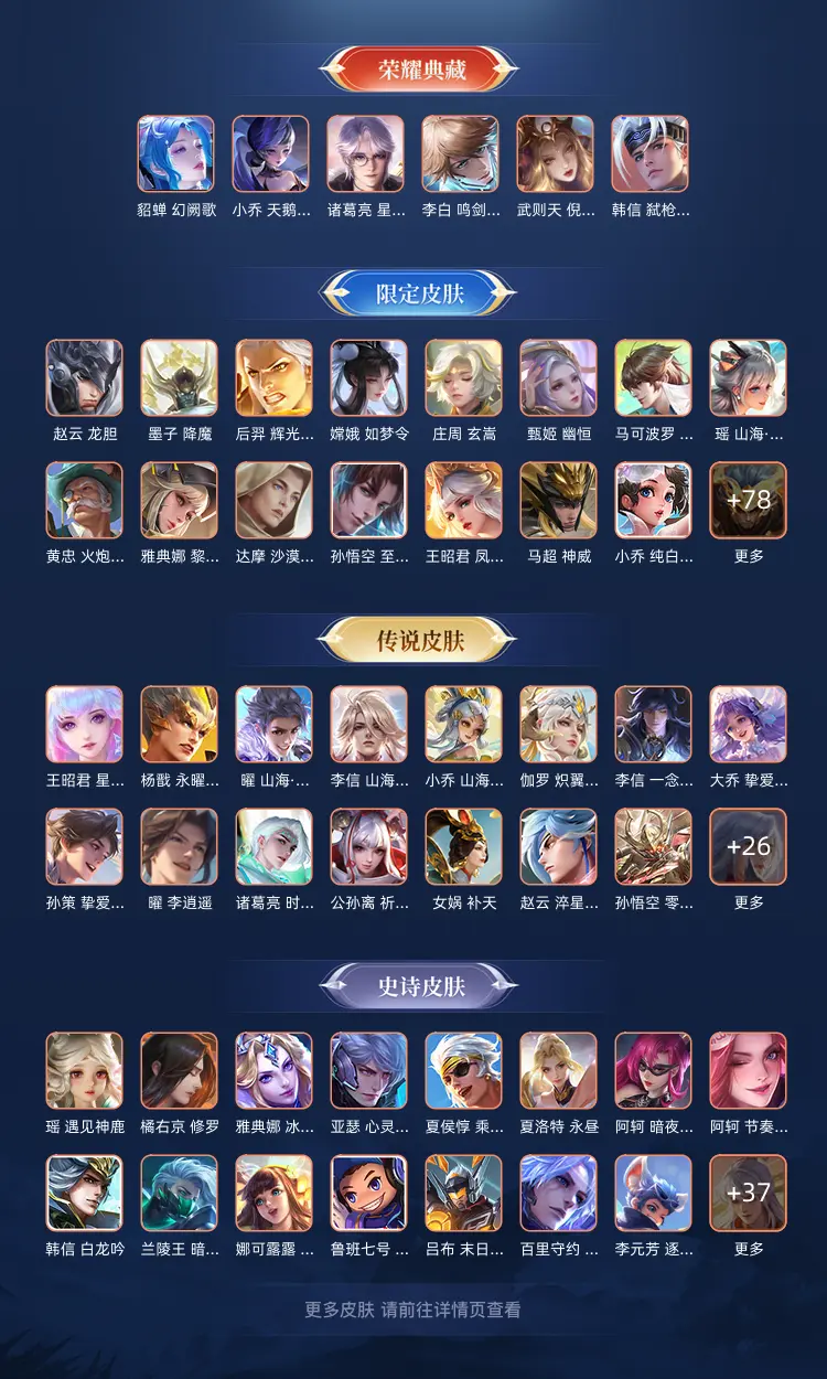 本游戏账号: V10用户,基础段位:至尊星耀IV,英雄多,皮肤多。典藏皮肤5个,感受典藏皮肤带来的优质体验快感,FMVP皮肤8个,尽情享受FMVP皮肤带来的主角光环, 私人所属英雄皮肤有:诸葛亮 星域神启||李白 鸣剑·曳影||武则天 倪克斯神谕||貂蝉 幻阙歌||小乔 天鹅之梦诸葛亮 时雨天司||诸葛亮 武陵仙君||大乔 挚爱花嫁||铠 绛天战甲||梦奇 胖达荣荣||孙尚香 音你闪耀||孙尚香 异界灵契||孙尚香 末日机甲||公孙离 记忆之芯||公孙离 祈雪灵祝||孙策 挚爱之约||孙策 末日机甲||上官婉儿 神器·万象笔||吕布 天魔缭乱||周瑜 音你心动||曜 山海·苍雷引||曜 李逍遥||宫本武藏 地狱之眼||李白 诗剑行||李白 凤求凰||狄仁杰 神器·狴犴令||狄仁杰 超时空战士||达摩 黄金狮子座||项羽 无限倾心||武则天 海洋之心||桑启 鸣野蒿||夏洛特 浮生妄||貂蝉 遇见胡旋||貂蝉 仲夏夜之梦||王昭君 星穹之声||王昭君 乞巧织情||花木兰 燃星之曲|