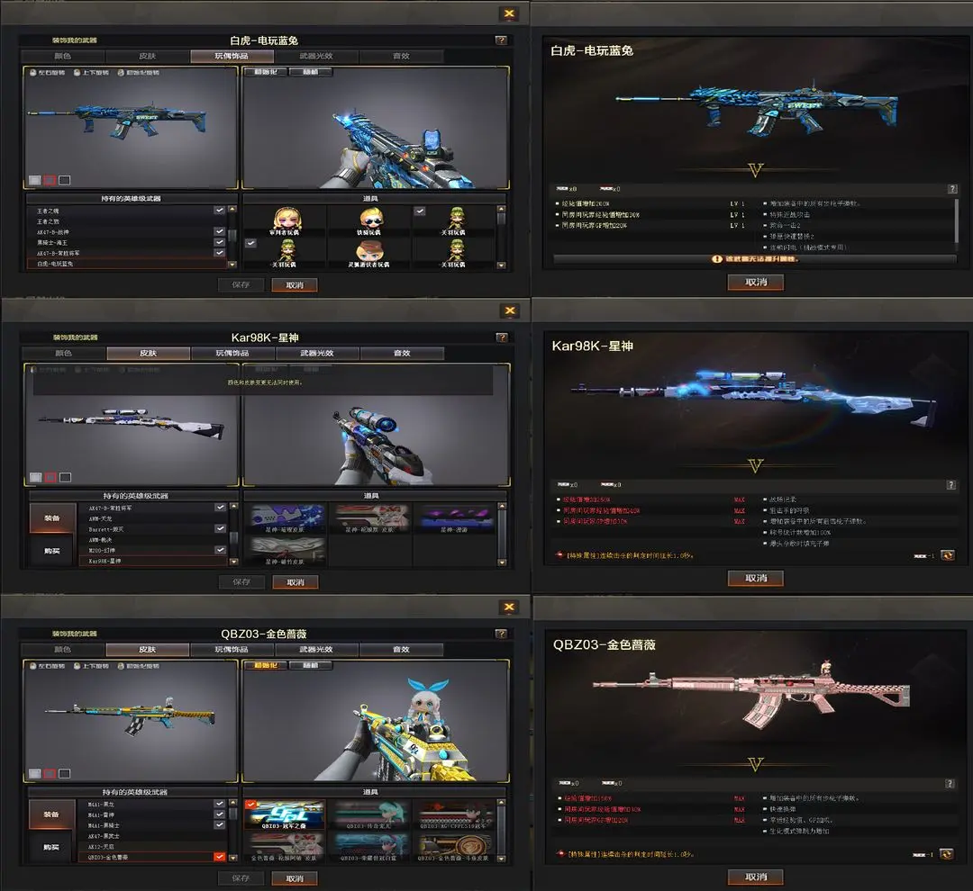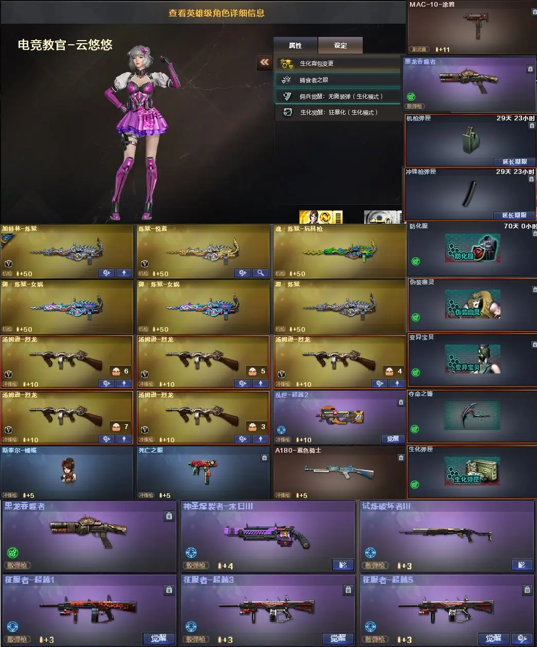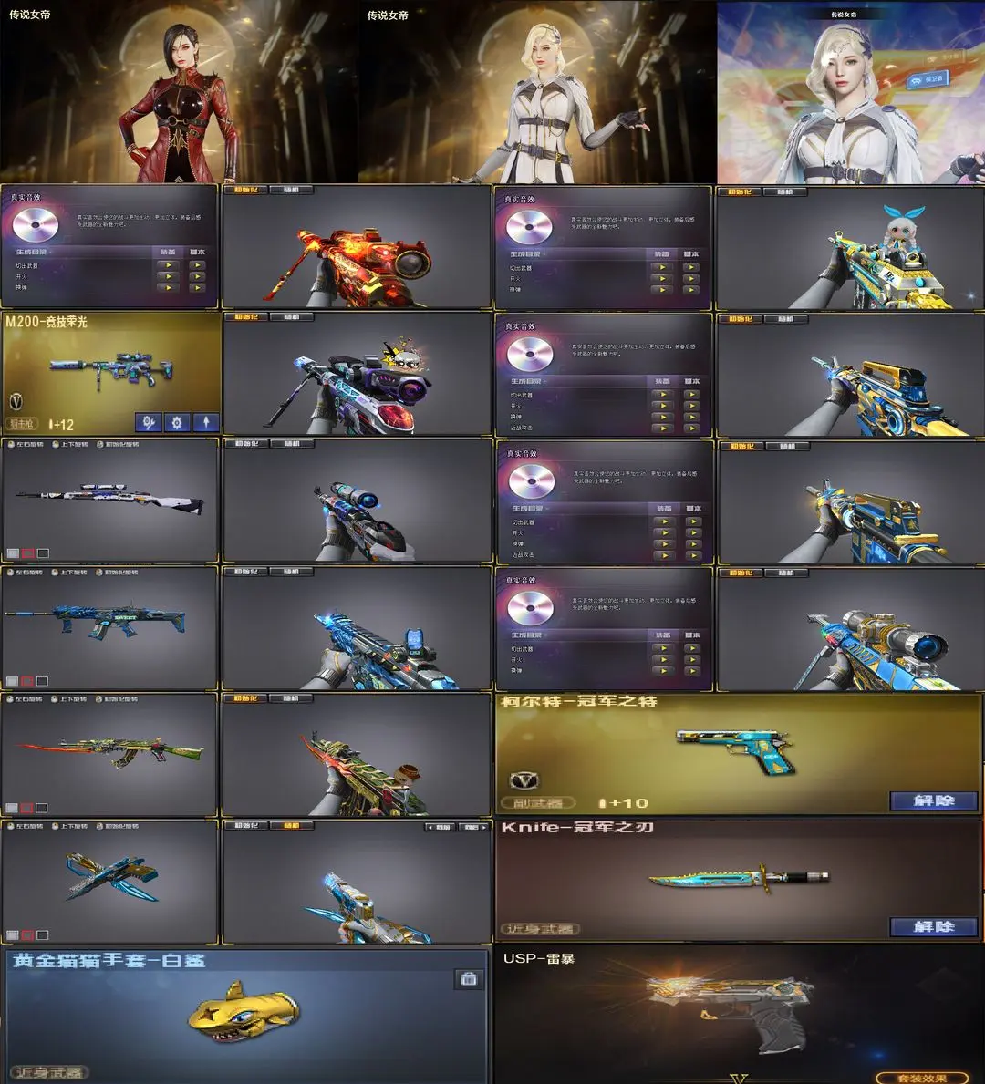 【装备道具】:传说女帝★云悠悠★QBZ-冠军之薇★Knife-冠军之刃★柯尔特-双冠军之特★火麒麟-冠军之心★修罗冠军之魂★幻神丹凤/QBZ03冠军之薇/毁灭冠军之怒/雷神冠军之魄/黑龙冠军之武/修罗冠军之魂/毁灭星空/雷神耀金/雷神暗月/雷神能量核心/战神赵云/黑骑士耀金/黑骑士暗月/黑龙暗月/黑龙能量核心/千变孔明/火麒麟心动糖果/火麒麟战神关羽/火麒麟轻羽/刘备/传说女帝 电竞教官-云悠悠/魅影/M200-幻神/M200-竞技荣光/Barrett-毁灭/Barrett-暗月传说(5)/Kar98K-星神/M200-幻神音效卡/M4A1-黑骑士音效卡/M4A1-黑龙音效卡/QBZ03-金色蔷薇音效卡/雷神音效卡★黄金猫猫手套-白鲨★魅影/乔伊教练★火麒麟-灵狐★雷神-精英刀锋★巴雷特-零-水下丽影★斯泰尔-蝴蝶★迷你手枪★MAC-10-涂鸦★QBZ-金色蔷薇★6烈龙炼狱盘龙★炼狱悦蓝★黑龙吞噬者★死亡之眼★神圣爆裂者★看血不换弹★荣耀之证卡牌★变异宝贝死亡对讲机不退包★佣兵觉醒无需换弹手斧镜减速雷★捕食者之眼查看血量★