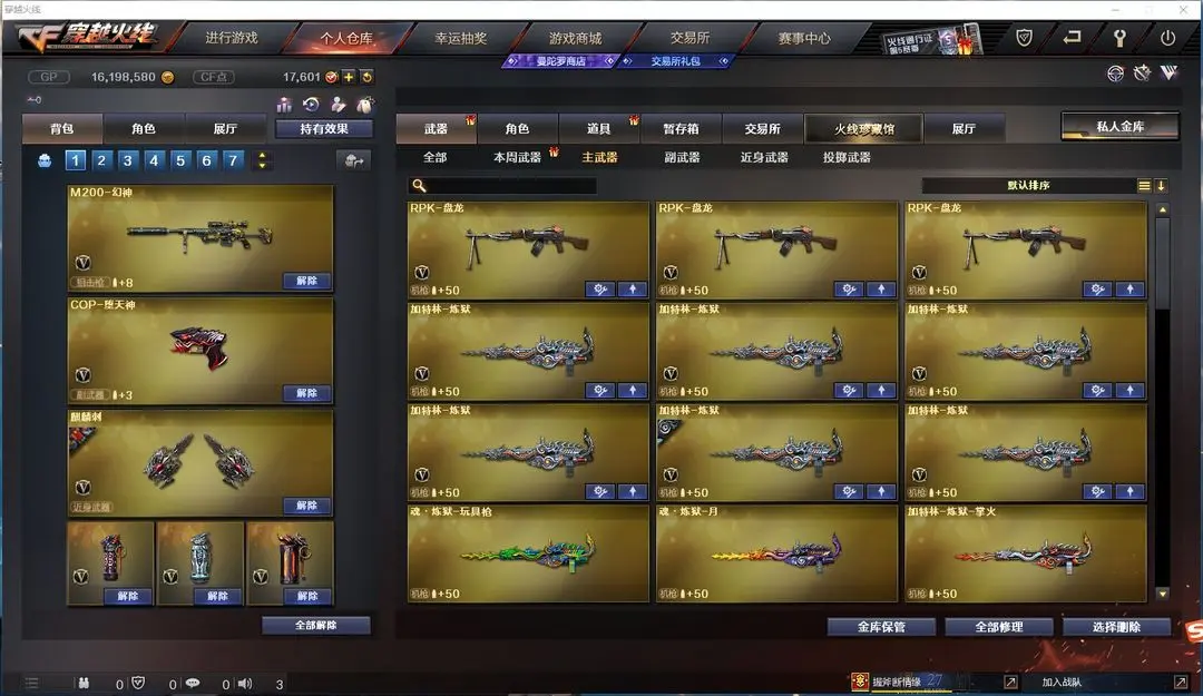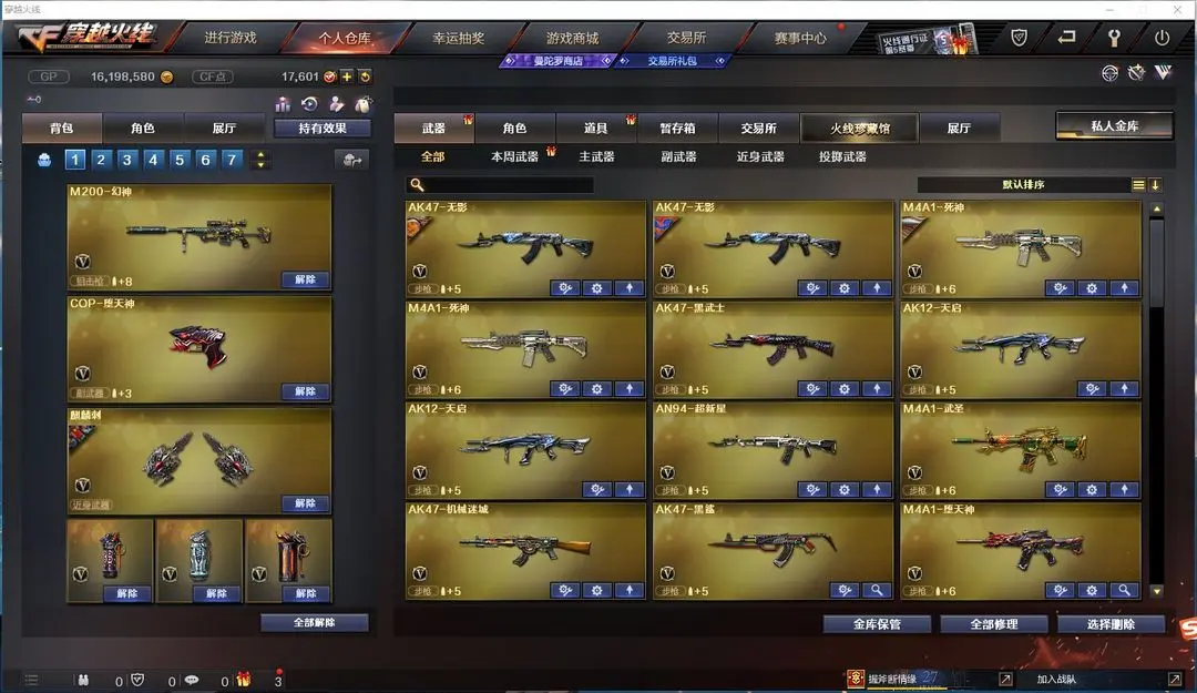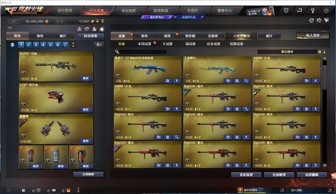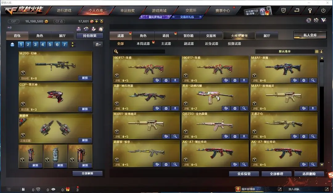 本游戏账号:英雄武器141个; 王者武器16个。 装备不多,但是主武器、副武器、近身武器够用 拥有完美游戏体验。重要的是,特殊装备有:HK417-朱雀、M4A1-玫瑰精灵、AK47-火麒麟、麒麟刺、M200-幻神、加特林-炼狱、龙啸-堕天神、王者之怒-觉醒版、王者之魄、王者霜心、王者之光-觉醒版、炫金骑士、王者之怒、王者之光、炫金毁灭、王者之力、王者之心-觉醒版、迷迭香、堕天使、M4A1-黑骑士音效卡、王者之魄金色光效、王者之心金色光效、炼狱-悦蓝金色光效、生化弹匣、等,随意畅选。