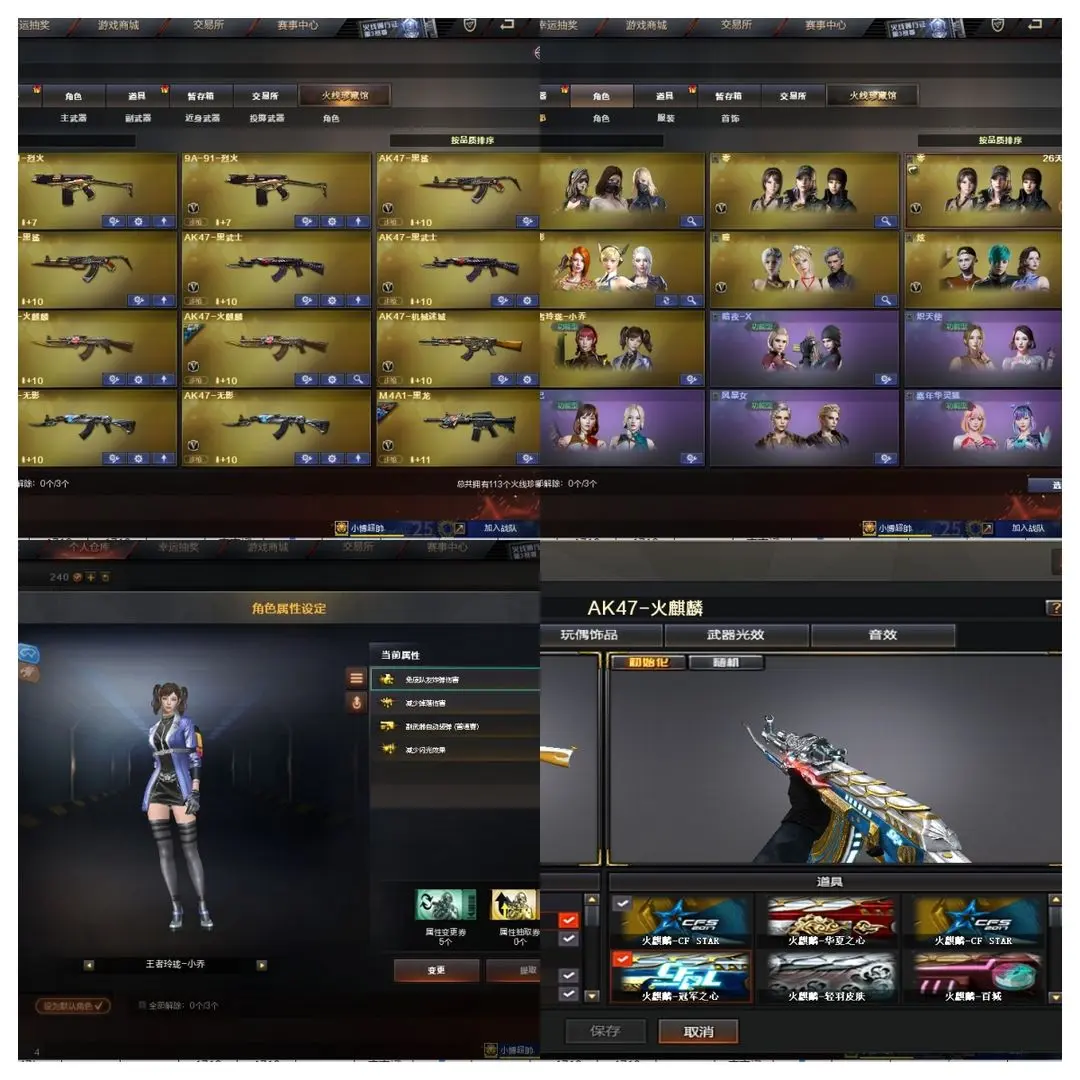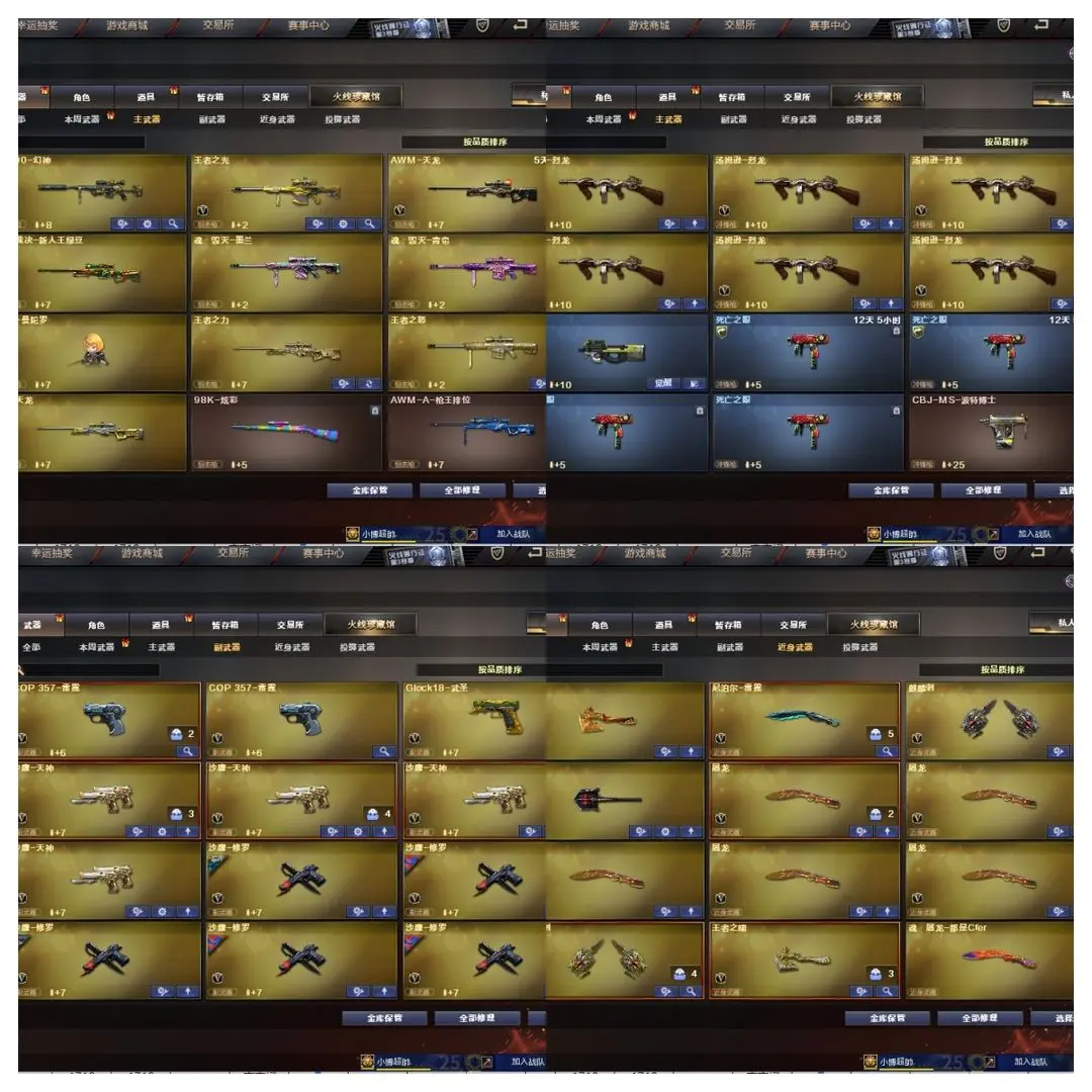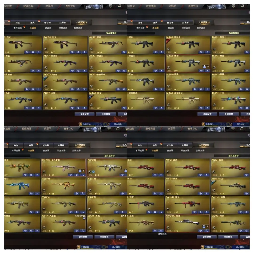本游戏账号:英雄武器93个; 王者武器24个。 装备不多,但是主武器、副武器、近身武器够用 拥有完美游戏体验。重要的是,特殊装备有:M4A1-玫瑰精灵、M200-幻神、加特林-炼狱、黑骑士-海王、麒麟刺、AK47-火麒麟、王者火魄、王者之戮、王者之光-觉醒版、炫金天龙、王者之武-觉醒版、王者之心-觉醒版、炼狱-悦蓝、炫金武士、王者之魄-觉醒版、王者之翼、王者之锋、王者之怒、王者之力、王者之魂、王者之幻、王者之势、火麒麟-灵狐、魅影、王者玲珑-小乔、炽天使、堕天使、王者之魄金色光效、王者之啸金色光效、M4A1-黑骑士音效卡、生化弹匣、等,随意畅选。