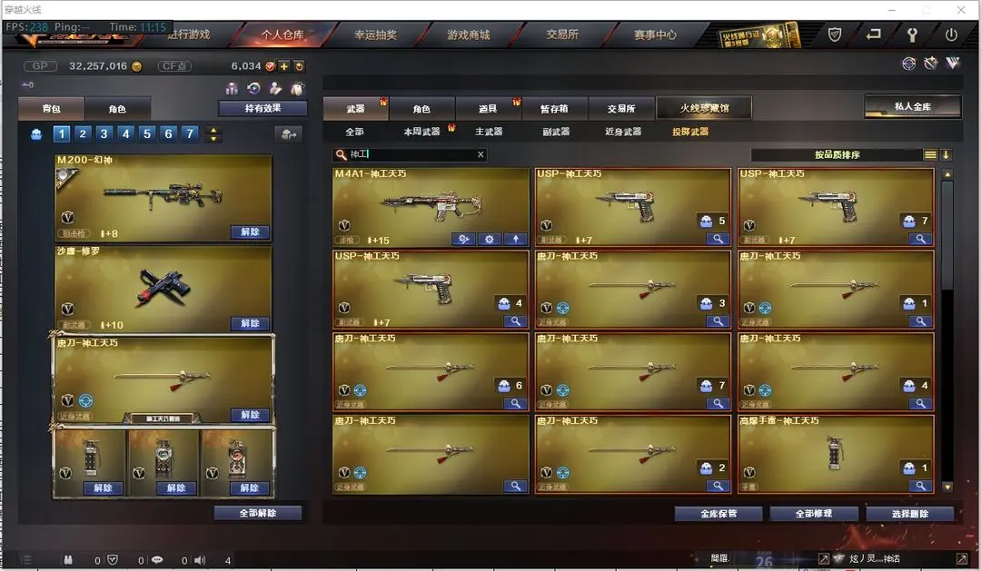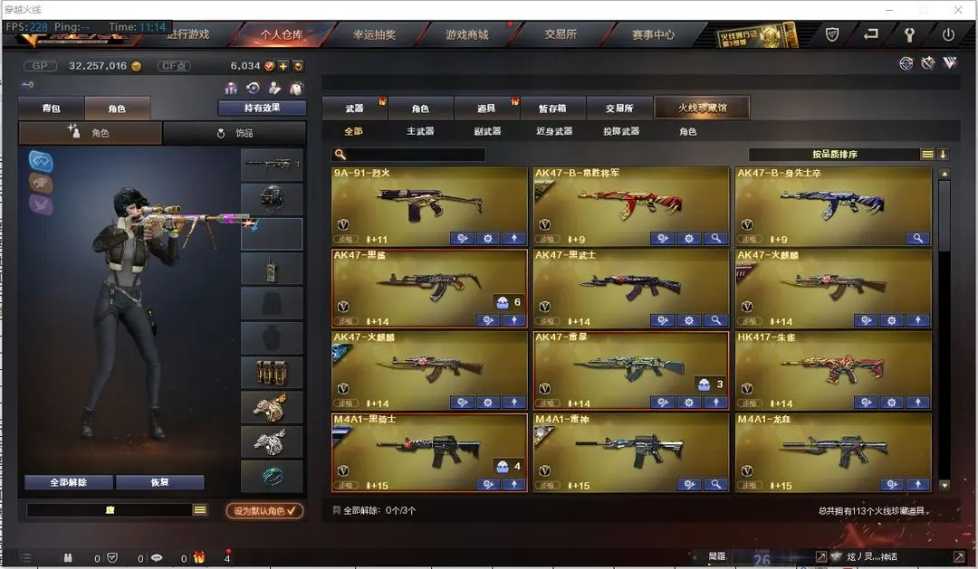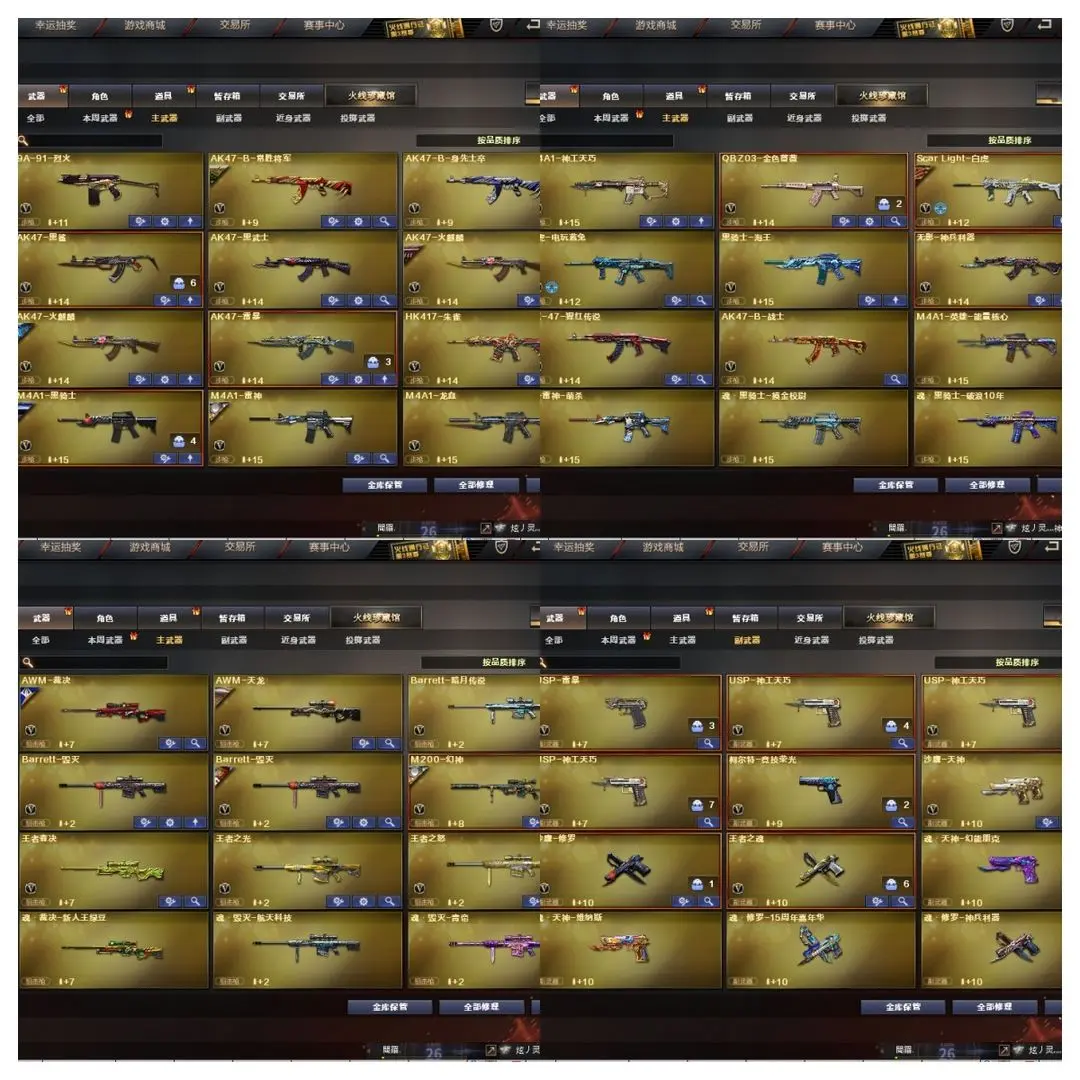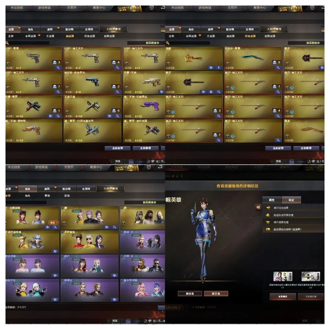 本游戏账号:英雄武器102个; 王者武器11个。 装备不多,但是主武器、副武器、近身武器够用 拥有完美游戏体验。重要的是,特殊装备有:USP-雷暴、M200-幻神、柯尔特-竞技荣光、加特林-炼狱、AK47-火麒麟、黑骑士-海王、HK417-朱雀、王者之怒-觉醒版、王者之光-觉醒版、炫金黑龙、炫金火麒麟、职业选手、王者沙漠玫瑰、堕天使、生化弹匣、M4A1-黑骑士音效卡、等,随意畅选。