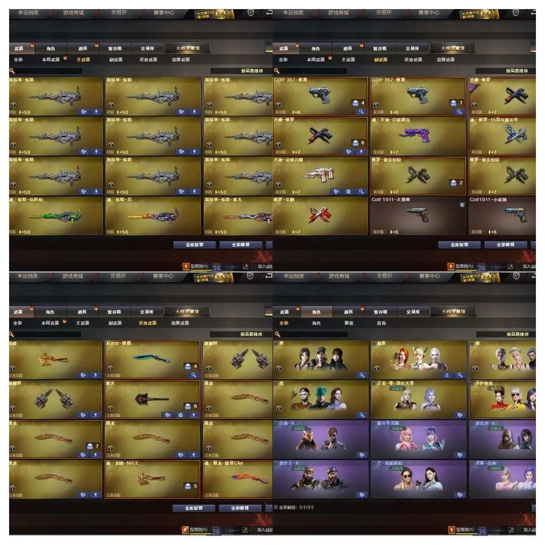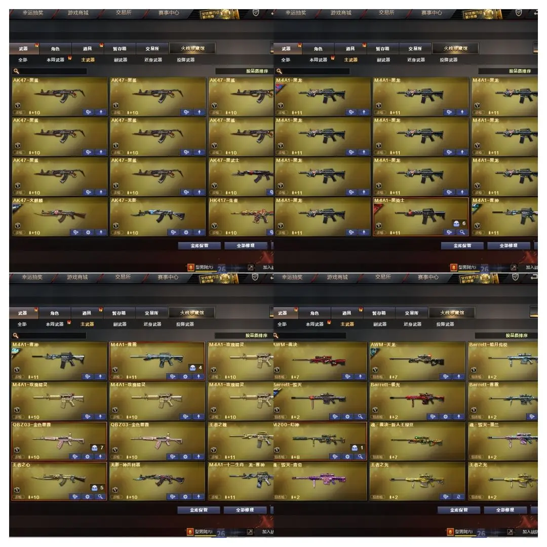 本游戏账号:英雄武器94个; 王者武器13个。 装备不多,但是主武器、副武器、近身武器够用 拥有完美游戏体验。重要的是,特殊装备有:M4A1-玫瑰精灵、加特林-炼狱、M200-幻神、麒麟刺、AK47-火麒麟、HK417-朱雀、炫金毁灭、炫金天龙、王者之魄-觉醒版、王者之光、炫金雷神、炫金骑士、王者之魄、王者之心-觉醒版、魅影、雪莉杨、堕天使、王者之啸金色光效、生化弹匣、王者之魄金色光效、M4A1-黑骑士音效卡、等,随意畅选。