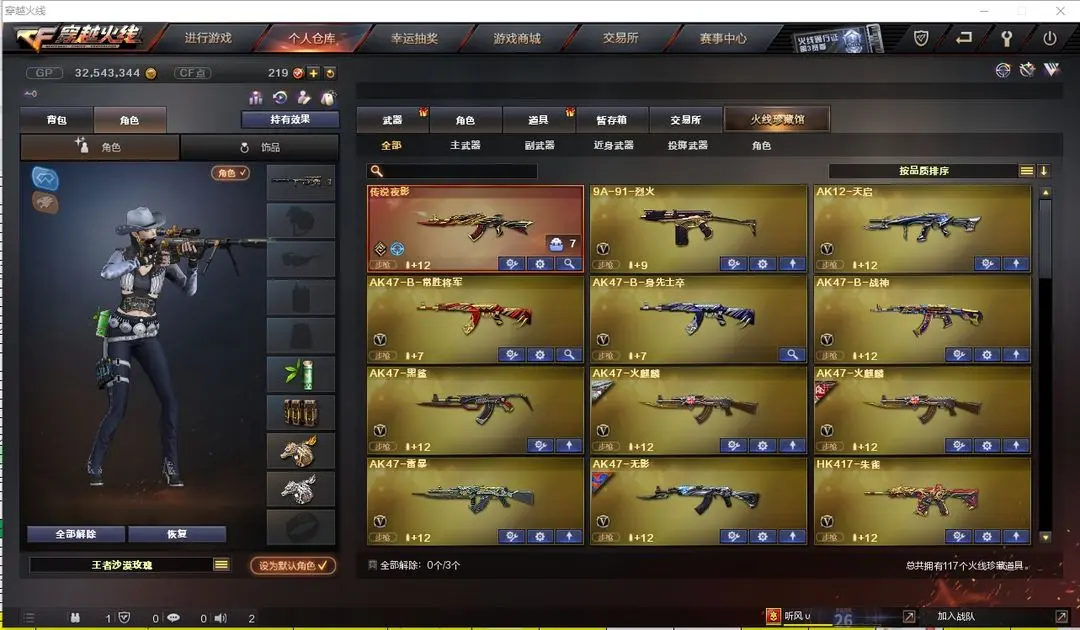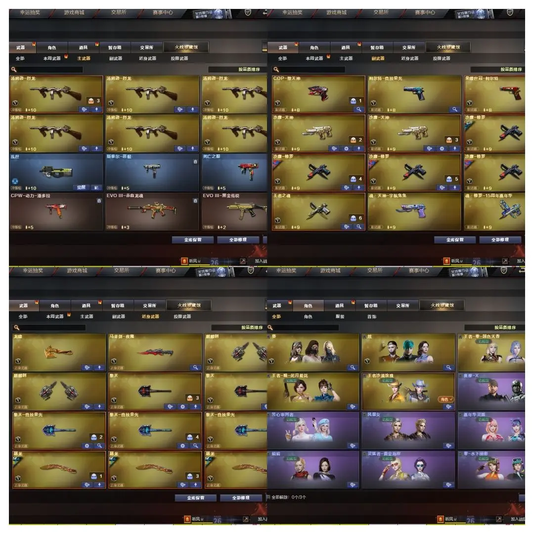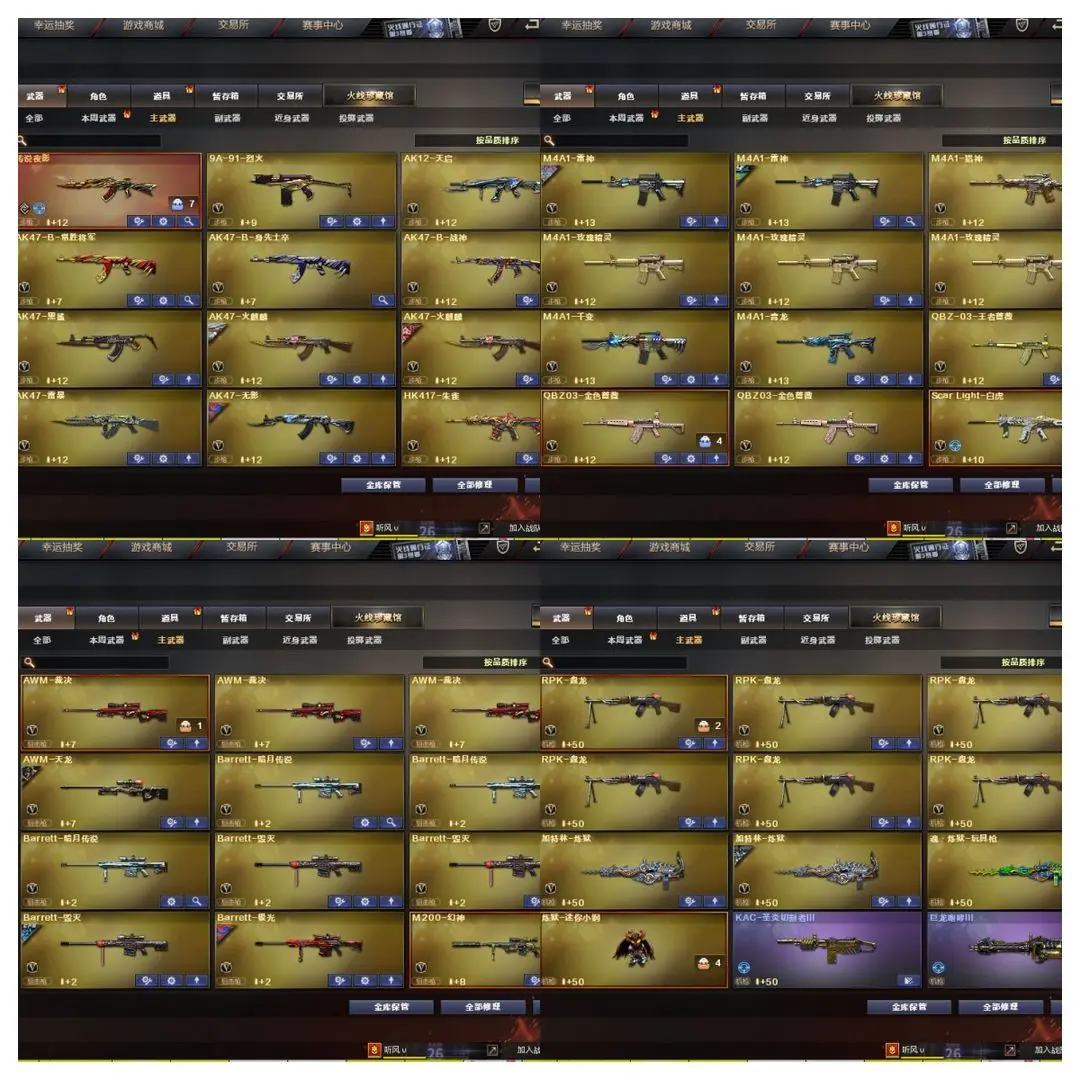 本游戏账号:英雄武器107个; 王者武器24个。 装备不多,但是主武器、副武器、近身武器够用 拥有完美游戏体验。重要的是,特殊装备有:荣耀世冠-柯尔特、荣耀世冠-雷神、黑骑士-海王、擎天-竞技荣光、加特林-炼狱、麒麟刺、HK417-朱雀、柯尔特-竞技荣光、烟雾弹-竞技荣光、M200-幻神、闪光弹-竞技荣光、M4A1-玫瑰精灵、AK47-火麒麟、王者之幻、炫金毁灭、王者之翼、炫金雷神、炫金黑龙、炫金火麒麟、王者之心-觉醒版、王者之魄-觉醒版、王者之怒-觉醒版、炫金天龙、炫金武士、炫金骑士、王者之锋-觉醒版、王者之锋、王者之光、火麒麟-绝迹、王者-瞳-闭月羞花、王者沙漠玫瑰、堕天使、M4A1-黑骑士音效卡、M200-幻神音效卡、王者之啸金色光效、王者之心金色光效、王者之魄金色光效、等,随意畅选。