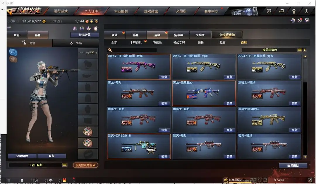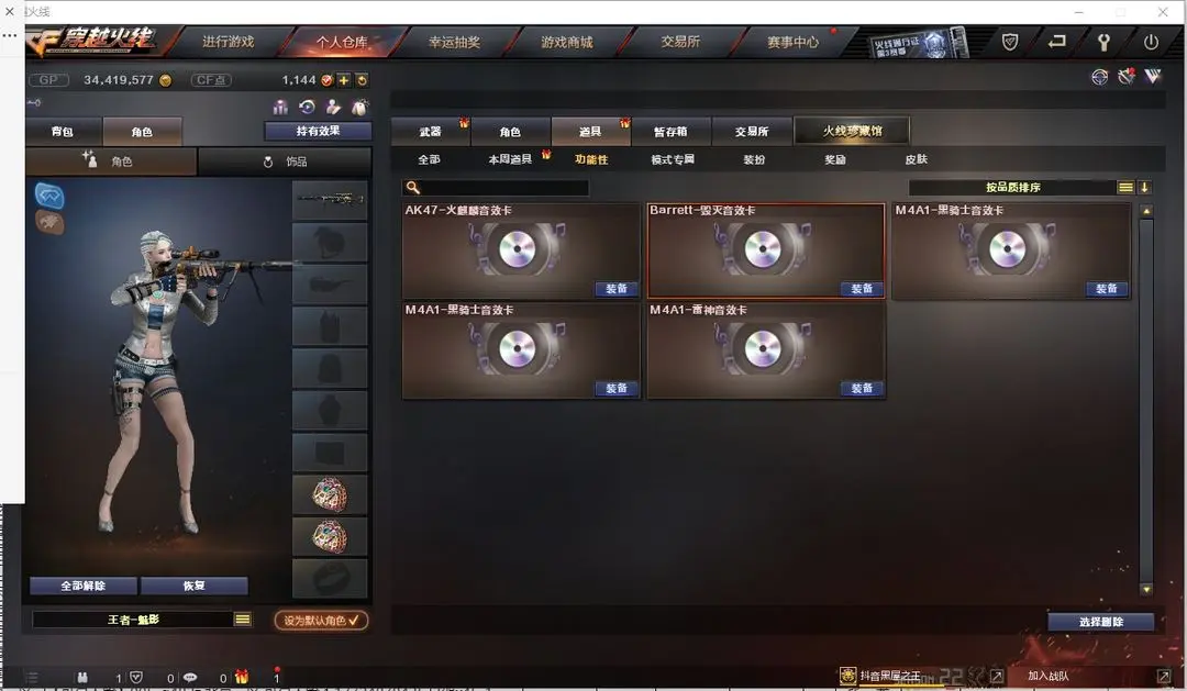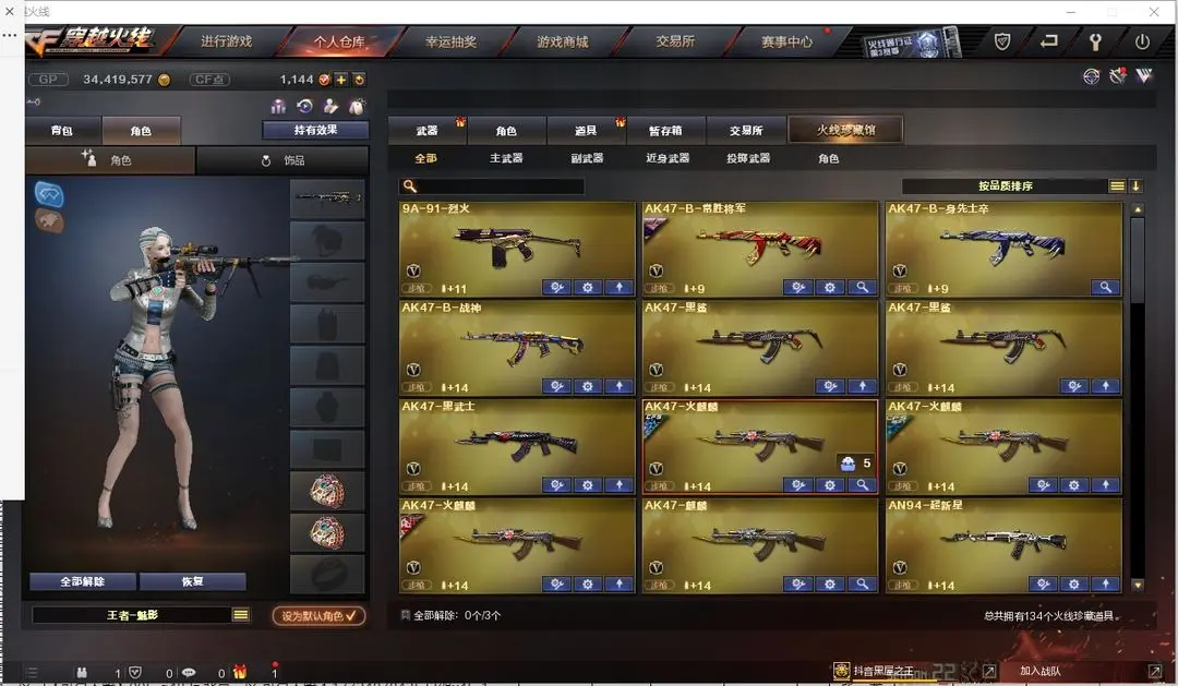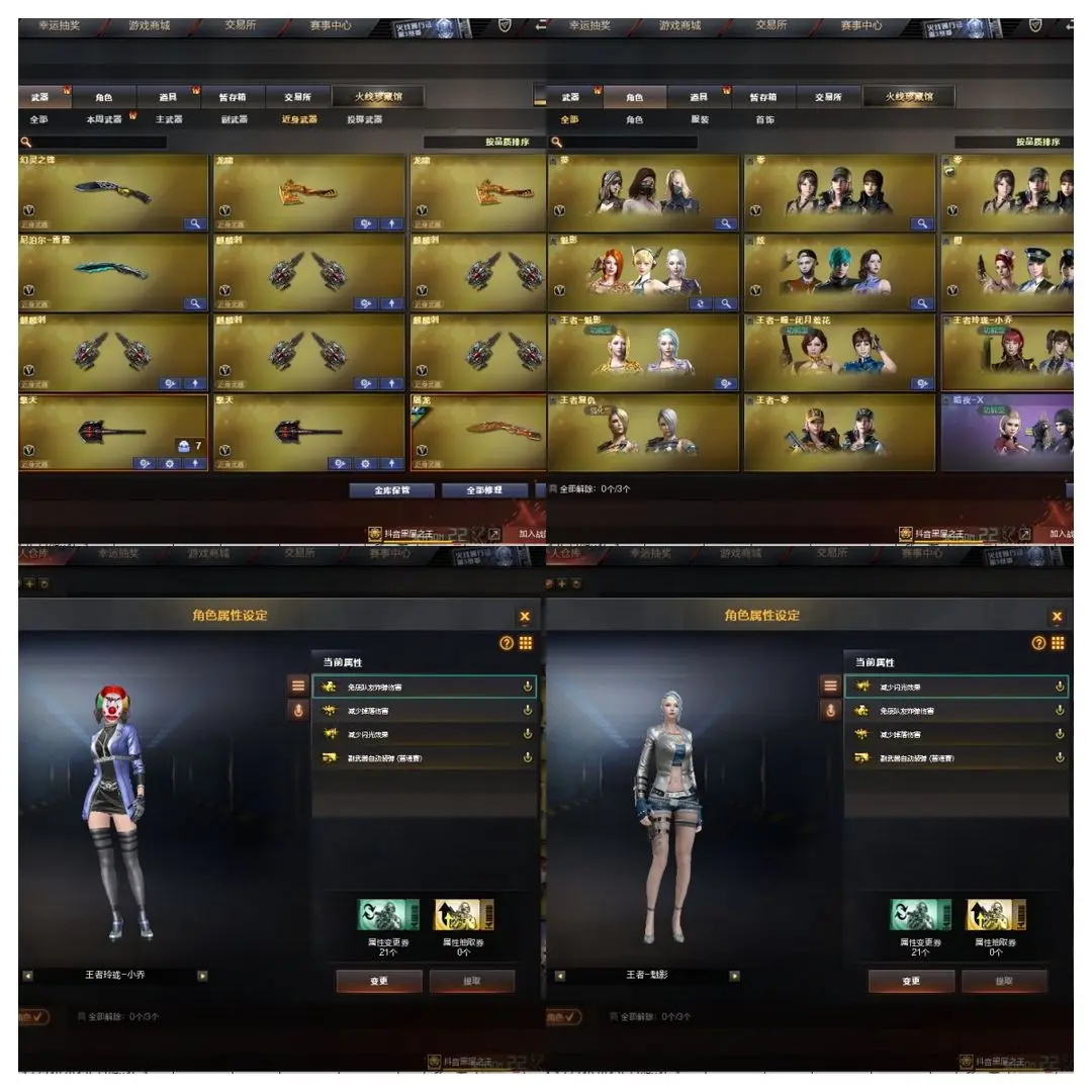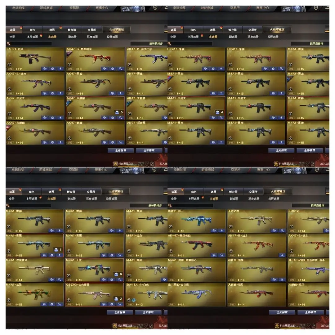 本游戏账号:英雄武器122个; 王者武器17个。 装备不多,但是主武器、副武器、近身武器够用 拥有完美游戏体验。重要的是,特殊装备有:HK417-朱雀、麒麟刺、加特林-炼狱、USP-雷暴、M200-幻神、AK47-火麒麟、M4A1-玫瑰精灵、黑骑士-海王、炫金黑龙、炫金雷神、王者之心-觉醒版、高爆手雷-雷霆王者、王者之魄-觉醒版、炫金骑士、王者之魂、王者之怒、火麒麟-暗月、魅影、王者-魅影、王者-瞳-闭月羞花、职业选手、王者玲珑-小乔、堕天使、王者-零、生化弹匣、王者之魄金色光效、王者之心金色光效、王者之啸金色光效、M4A1-黑骑士音效卡、等,随意畅选。