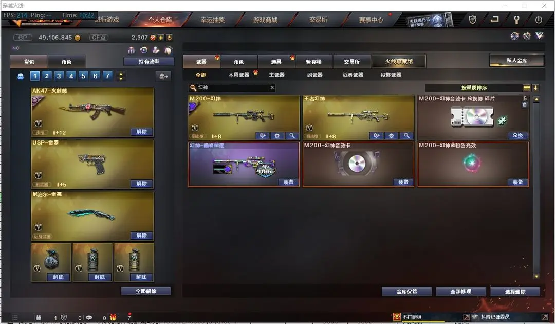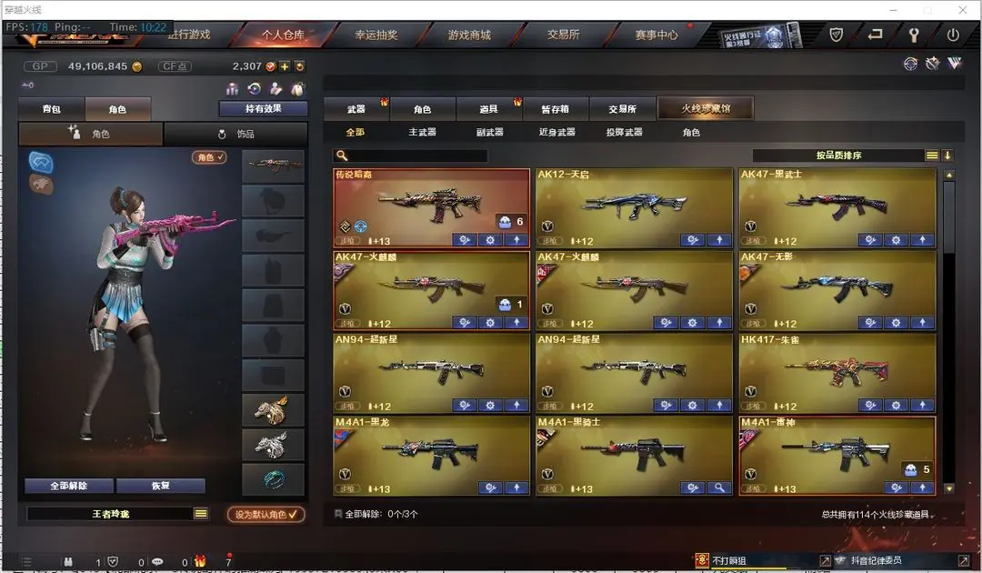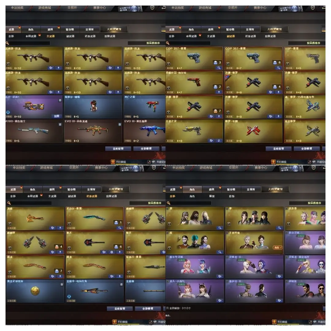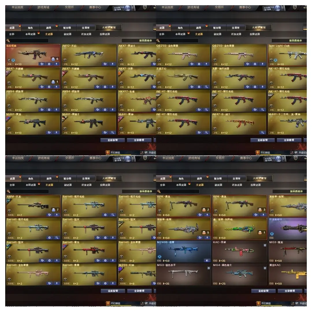 本游戏账号:英雄武器107个; 王者武器10个。 装备不多,但是主武器、副武器、近身武器够用 拥有完美游戏体验。重要的是,特殊装备有:麒麟刺、闪光弹-竞技荣光、加特林-炼狱、荣耀世冠-柯尔特、AK47-火麒麟、M200-幻神、HK417-朱雀、USP-雷暴、传说暗裔、王者之魄高爆手雷、王者之心-觉醒版、王者之灵、炫金黑龙、王者之怒-觉醒版、王者幻神-觉醒版、迷迭香、王者玲珑、职业选手、堕天使、M200-幻神音效卡、王者之心金色光效、等,随意畅选。