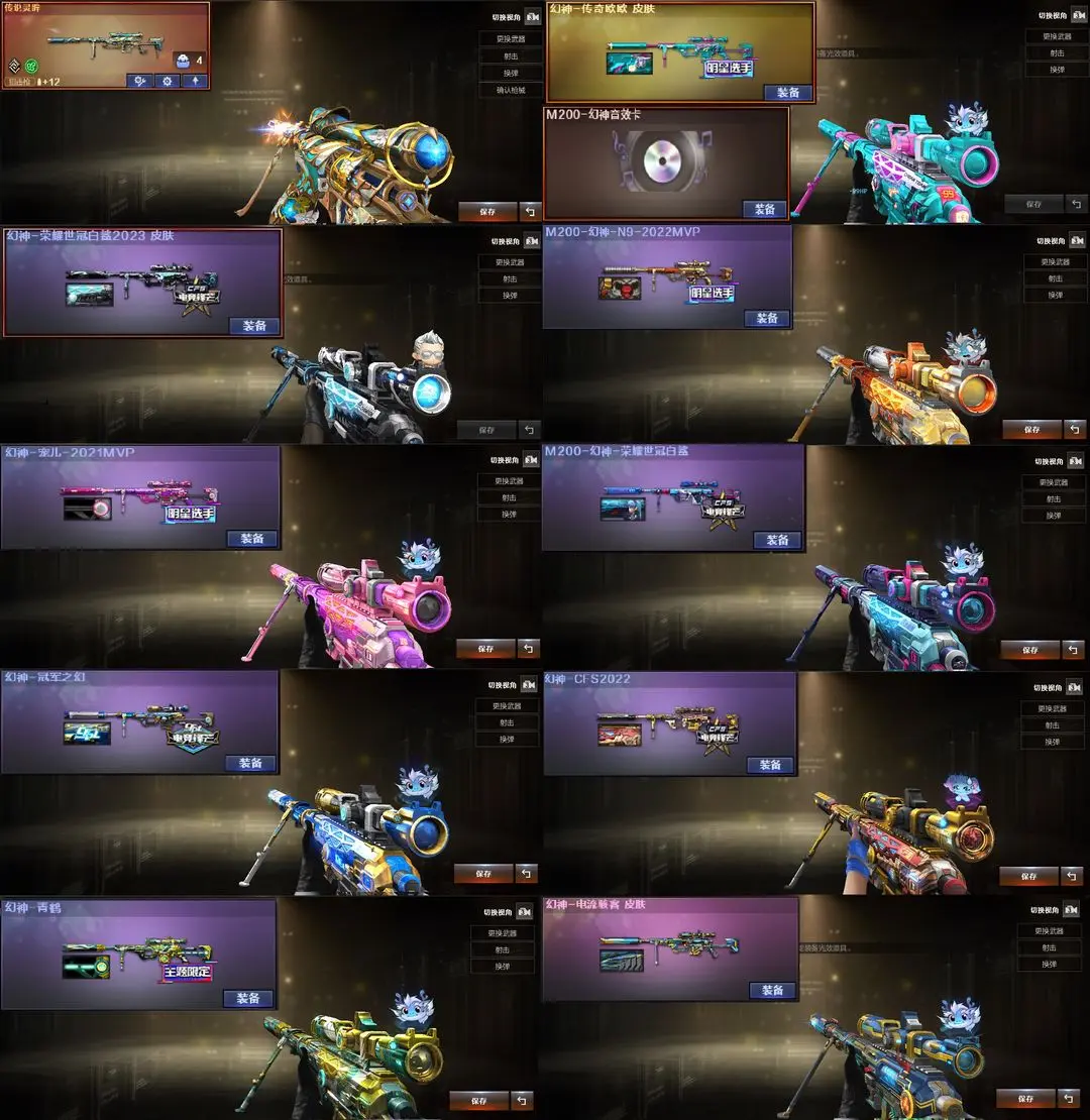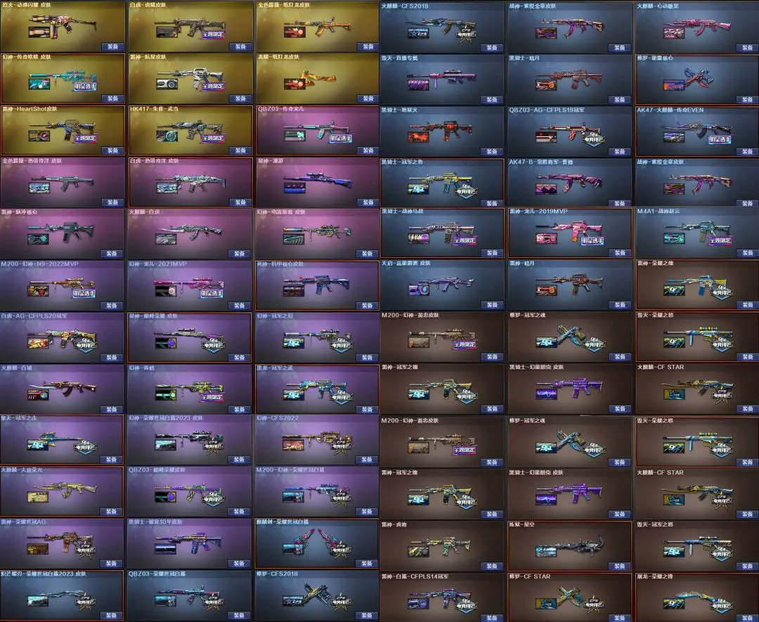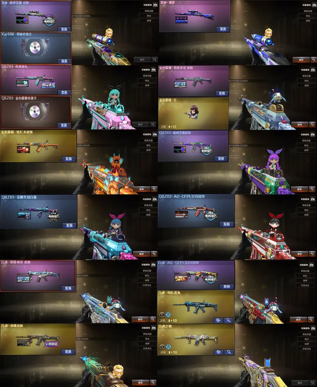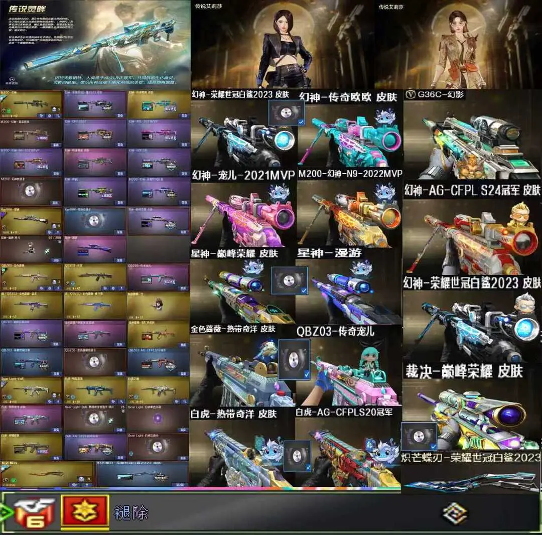 【装备道具】:AGs24幻神皮肤★裁决巅峰皮肤★传说艾莉莎★传说夜影/传说辉光/传说暗裔/传说灵眸★M200-幻神★幻神-电流骇客/幻神-欧欧/M200-幻神-黄忠/M200-幻神-荣耀世冠白鲨/幻神-荣耀世冠白鲨2023/M200-幻神-N9-2022MVP/幻神-宠儿-2021MVP/幻神-冠军之幻/幻神-青鹤/幻神-CFS2022/星神-巅峰荣耀/星神-漫游/炽芒蝶刃-荣耀世冠白鲨2023★朱雀-武当/金色蔷薇-纸灯龙/金色蔷薇-热带奇洋/白虎-热带奇洋/白虎-AG-CFPLS20冠军/白虎-虎啸/QBZ03-巅峰荣耀★QBZ03-AG-CFPLS19冠军/QBZ03-荣耀世冠白鲨/QBZ03-传奇宠儿★炼狱音效卡/朱雀音效卡/裁决音效卡/极光音效卡/星神音效卡/幻神音效卡/黑骑士音效卡/金色蔷薇音效卡/白虎音效卡/雷神音效卡/★98K-星神/Scar-白虎/白虎-电玩蓝兔/白虎之魄-觉醒版/M14EBR-玄武/★炫/影豹/雨棠/电竞教官-云悠悠/荒漠琉璃/关小雨/晴雅/隼/岚兮儿/司雨/王者-魅影/王者-迷迭香/王者沙漠玫瑰/王者影豹/王者潘多拉/王者岚兮儿/幽/