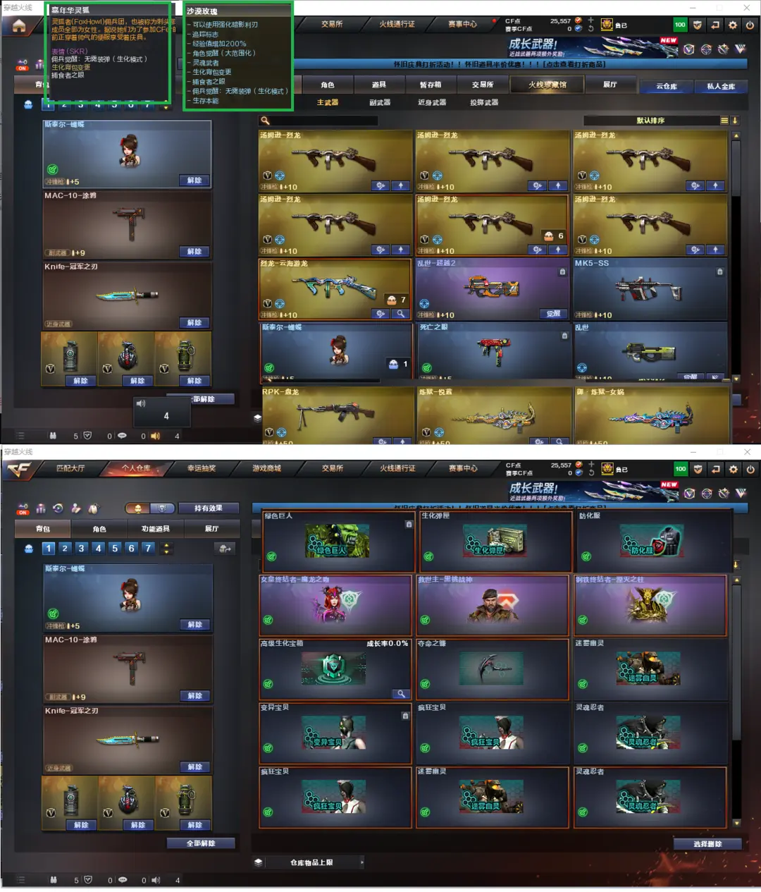 排位:可以、、、、、、、生化极品四防(可以变更背包、查看生化僵尸血量):6烈、盘龙、炼狱、斯泰尔蝴蝶、死亡之眼、MAC涂鸦、手斧镜、生化雷、超级对讲机、常用弹匣、、、、、、、、、、、、爆破四防:幻神2皮(冠军之幻、青鹤皮肤)、M200-竞技荣光、2个USP雷暴、2个COP雷霆、2个COP堕天神、2个COP幻灵、柯尔特竞技荣光、冠军之特、白虎、QBZ金色蔷薇、、、毁灭音效、黑骑士音效、、、6套雷霆、7套雷暴、6套堕天神、1套夜魔、5套电竞装甲、8套幻灵、2套竞技荣光、、、生化四防(沙漠玫瑰、嘉年华灵狐)爆破四防(云悠悠、影豹、女战神)