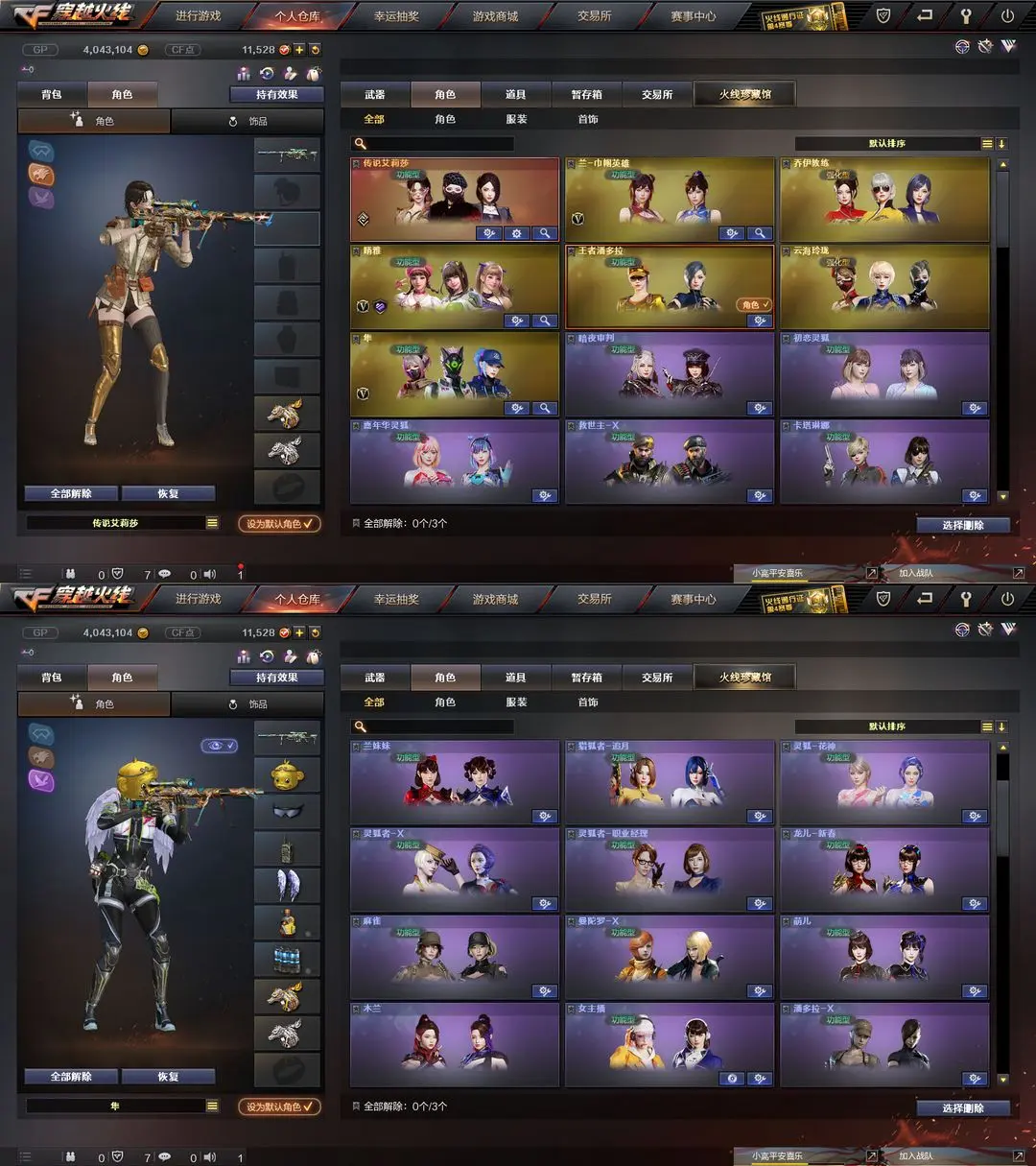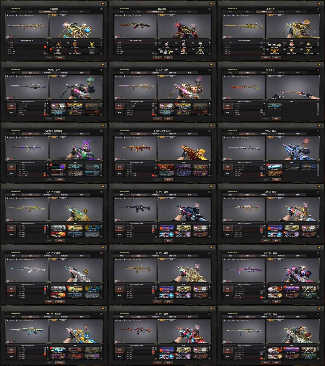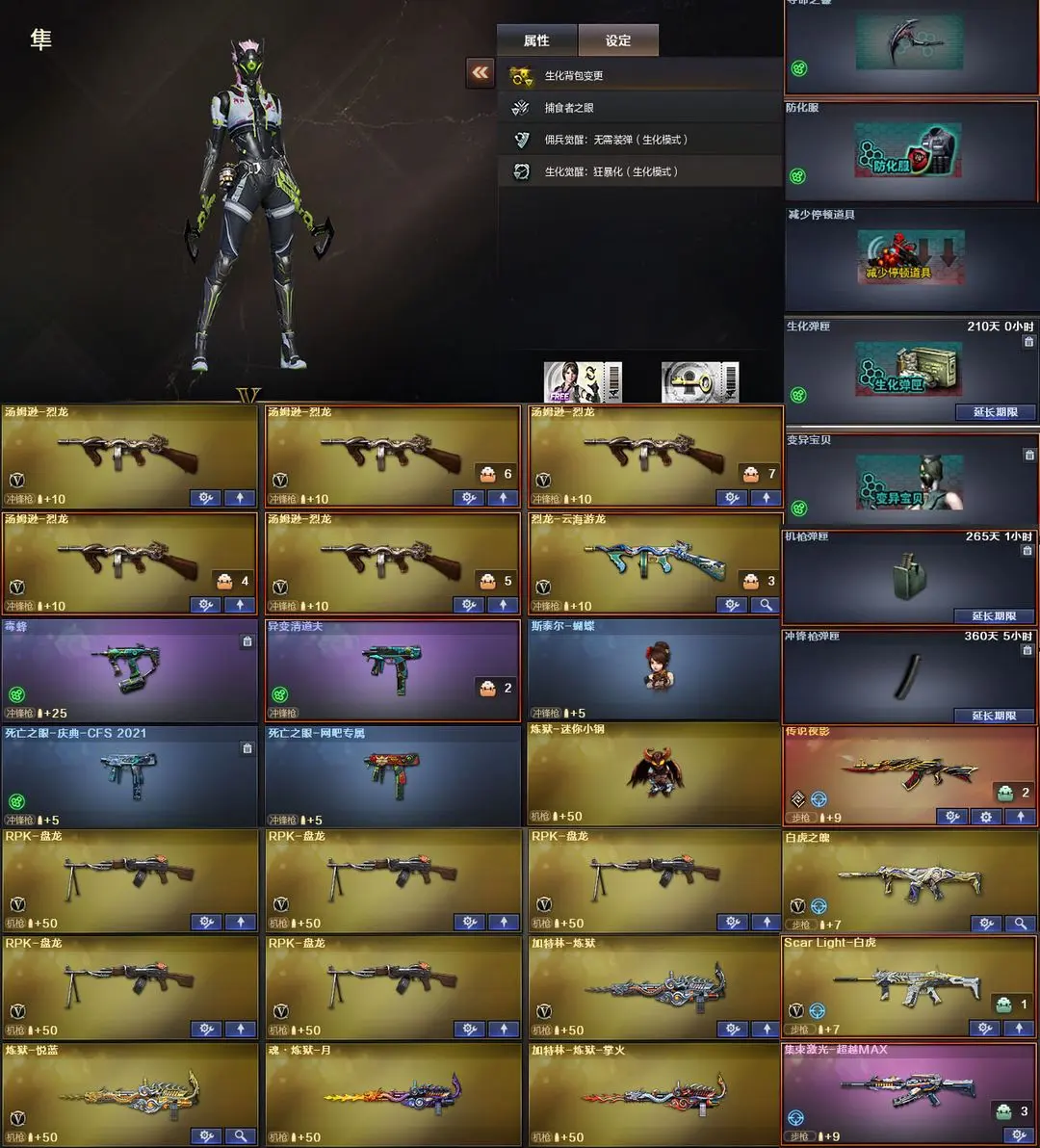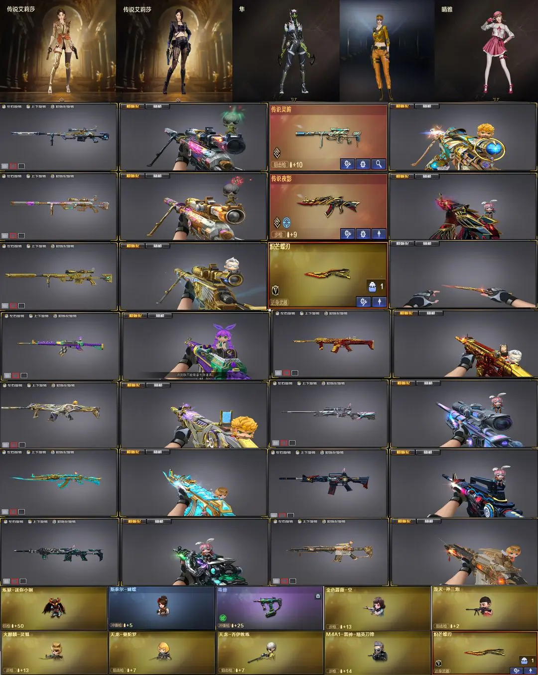 【装备道具】:传说灵眸+传说艾莉莎(四防)+m200-幻神+幻神-周瑜+幻神-动感闪耀+usp神工天巧*2 王者风神 传说夜影*2 【scar白虎+白虎音效卡+白虎-大汉风骨+白虎之魄】 【qbz金色蔷薇/qbz巅峰荣耀+炽芒蝶刃】 【6黑骑士+5盘龙+6烈龙+7修罗+炼狱+迷你小刚+毒蜂+变异清道夫】 m4a1-青龙 m14-玄武 裁决(裁决-流光秘银) 火麒麟(火麒麟-大唐荣光+火麒麟-轻羽) 雷神(雷神-动感闪耀音效卡+雷神-动感闪耀皮肤+雷神lgd-s18冠军+雷神-新春神龙皮肤) 黑骑士(黑骑士音效卡+黑骑士-冠军之势) 毁灭(毁灭音效卡+毁灭-云海游龙皮肤) 烈火-动感闪耀(烈火-动感闪耀音效卡) 天神-动感闪耀(天神-动感闪耀音效卡) 屠龙-动感闪耀音效卡★m4a1-神工天巧套装+7神工天巧手蕾套 千变 黑鲨 天龙 麒麟刺 幻灵之锋 【角色】 传说艾莉莎(四防) 晴雅(四防) 隼(四防) 王者潘多拉(四防) 女主播(四防)兰-巾帼英雄 云海玲珑 乔伊教练★灵狐者-职业经理★生化弹夹防化服变异宝贝死亡之眼对讲机不退包★佣兵觉醒无需换弹手斧镜减速雷★捕食者之眼查看血量★