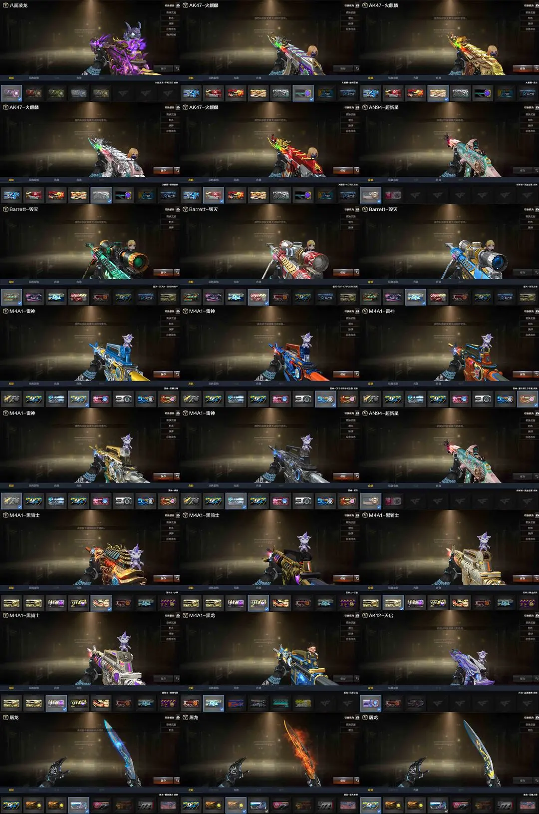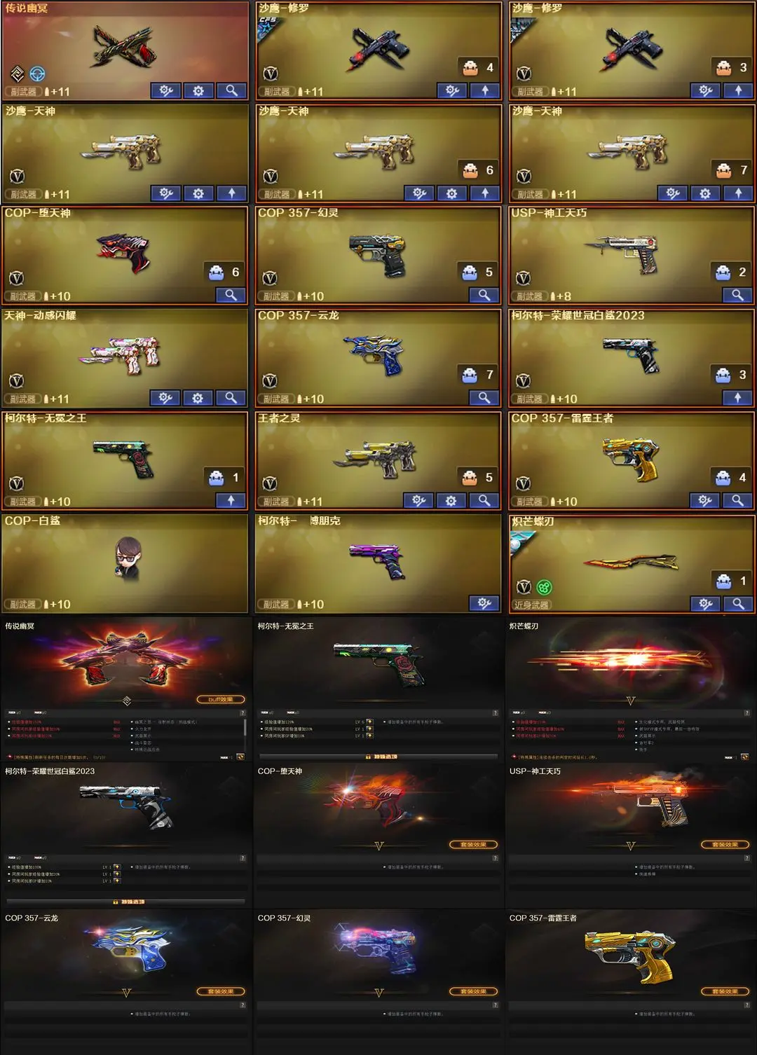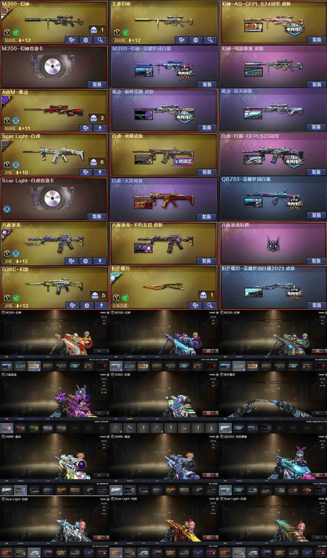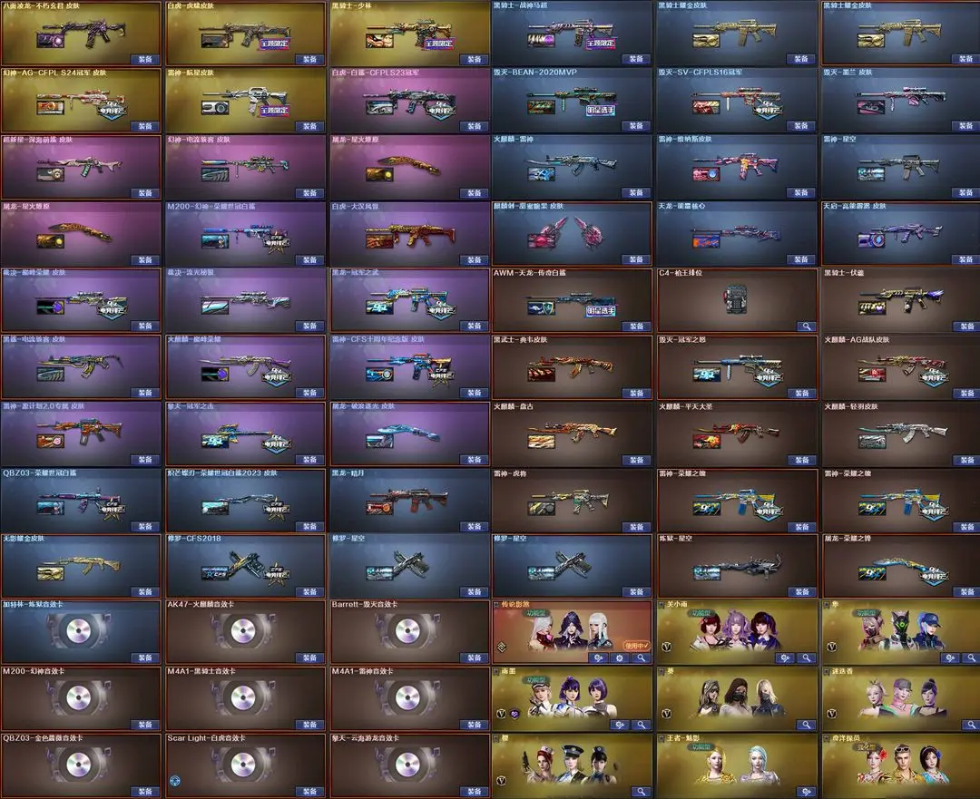 【装备道具】:传说幽瞳/传说幽冥★传说影煞/★M200-幻神/王者幻神-觉醒版/幻神-电流骇客 皮肤/幻神-AG-CFPL S24冠军 皮肤/M200-幻神-荣耀世冠白鲨/毁灭-冠军之怒/毁灭-BEAN-2020MVP/毁灭-墨兰皮肤/巴雷特SV皮肤/裁决-流光秘银/裁决-巅峰荣耀/火麒麟-AG/火麒麟-巅峰荣耀/雷神-源计划2.0专属 皮肤/雷神-航星/雷神-荣耀之魄/雷神-虎将/雷神-星空/雷神-维纳斯/雷神-CFS十周年纪念版/屠龙-破浪逐光炽芒蝶刃-荣耀世冠白鲨2023 皮肤/炼狱音效卡/幻神音效卡/黑骑士音效卡/金色蔷薇音效卡/白虎音效卡/雷神音效卡/毁灭音效卡/火麒麟音效卡//Kar98K-星神/Scar Light-白虎/USP-神工天巧/炽芒蝶刃/八面凌龙/柯尔特-荣耀世冠白鲨2023/柯尔特-无冕之王/COP-堕天神/COP 357-云龙/COP 357-幻灵/COP 357-雷霆王者-觉醒版/★王者凤吟/王者青龙/MK5-炽火炎龙/真的是手枪/COP-旗袍/COP-白鲨/迷你白狐/★★幻灵套装/云龙套装/臻选金狐套装