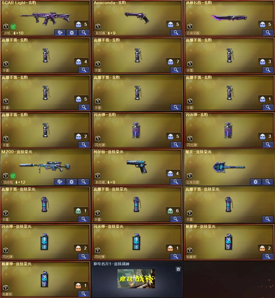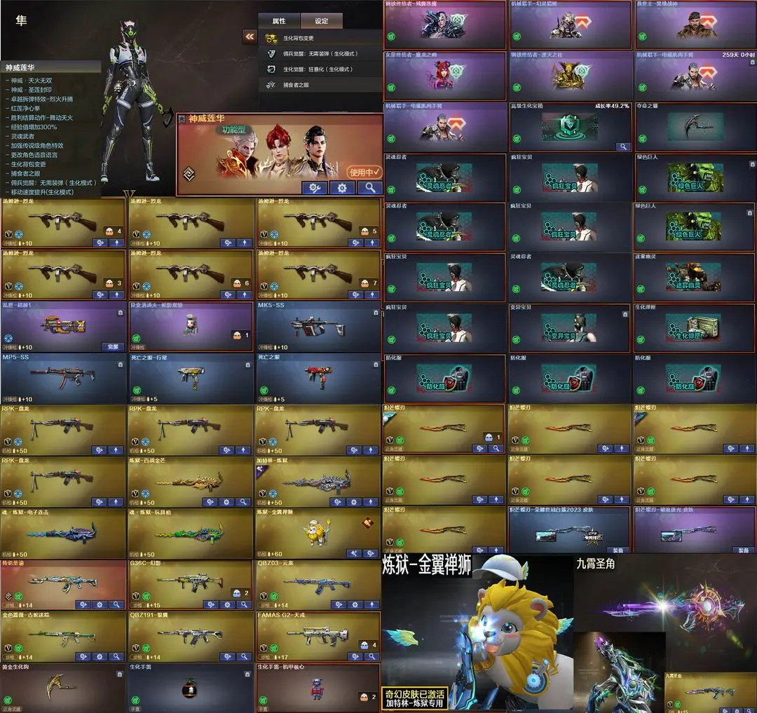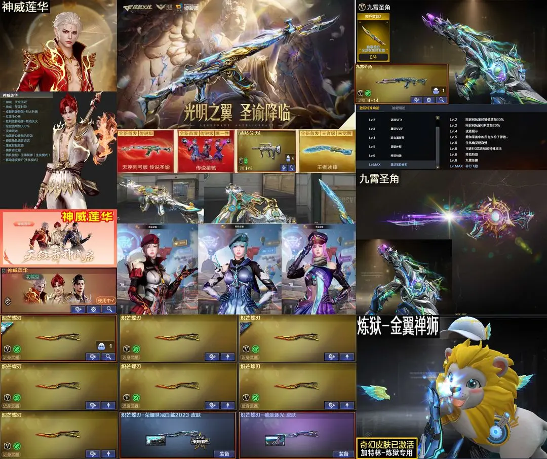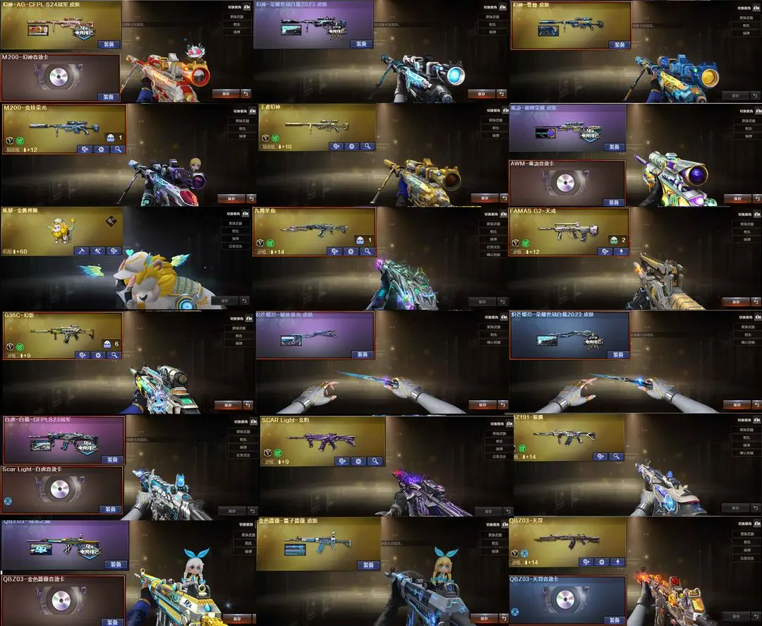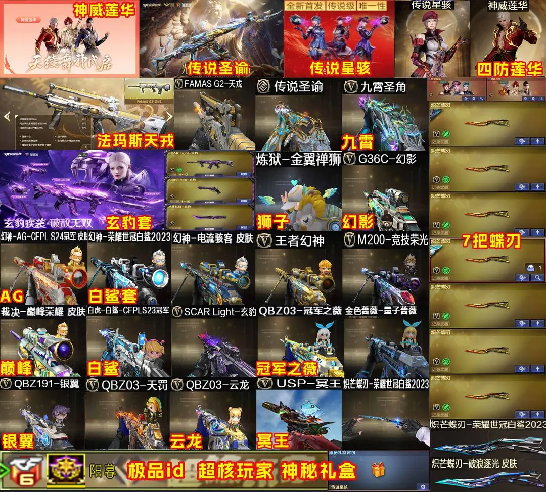 【装备道具】:神威莲华四防已开/炼狱新狮-金翼禅狮已赋予/炽芒蝶刃7把/白虎白鲨冠军皮肤/白虎音效卡/SCAR-白虎❤幻神-AG-CFPL S24冠军/幻神-荣耀世冠白鲨2023/幻神-电流骇客/裁决-巅峰荣耀/传奇石头-横秒之巅/雷神-冠军之魄/雷神-白鲨金色蔷薇-量子蔷薇 皮肤/白虎-白鲨-CFPLS23冠军/QBZ03-冠军之薇/屠龙-破浪逐光屠龙-荣耀之锋炽芒蝶刃-破浪逐光/炽芒蝶刃-荣耀世冠白鲨2023❤幻神音效卡/金色蔷薇音效卡/天罚音效卡/朱雀音效卡/雷神音效卡/黑骑士音效卡/毁灭音效卡/裁决音效卡/炼狱-百战金芒-庆典舞曲音效卡❤王者幻神/QBZ-云龙/QBZ-天罚/SCAR -玄豹/FAMAS G2-天戎/G36C-幻影/QBZ191-银翼游侠/炼狱-百战金芒/USP-冥王/Anaconda-玄豹/柯尔特-荣耀世冠白鲨2023/丛林匕首-玄豹/青龙之魄/独角之刃/王者冰锋❤竞技荣光套装/玄豹套装/魅影/月兔特工/关小雨/隼/机械姬/玄豹/幻神-魅影/异变清道夫-蛇影双骄/COP-白鲨/6烈6盘龙炼狱
