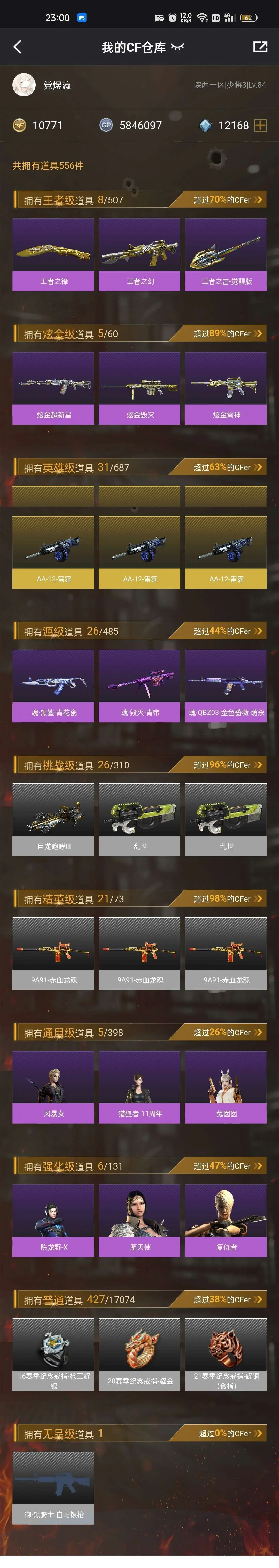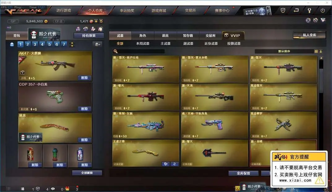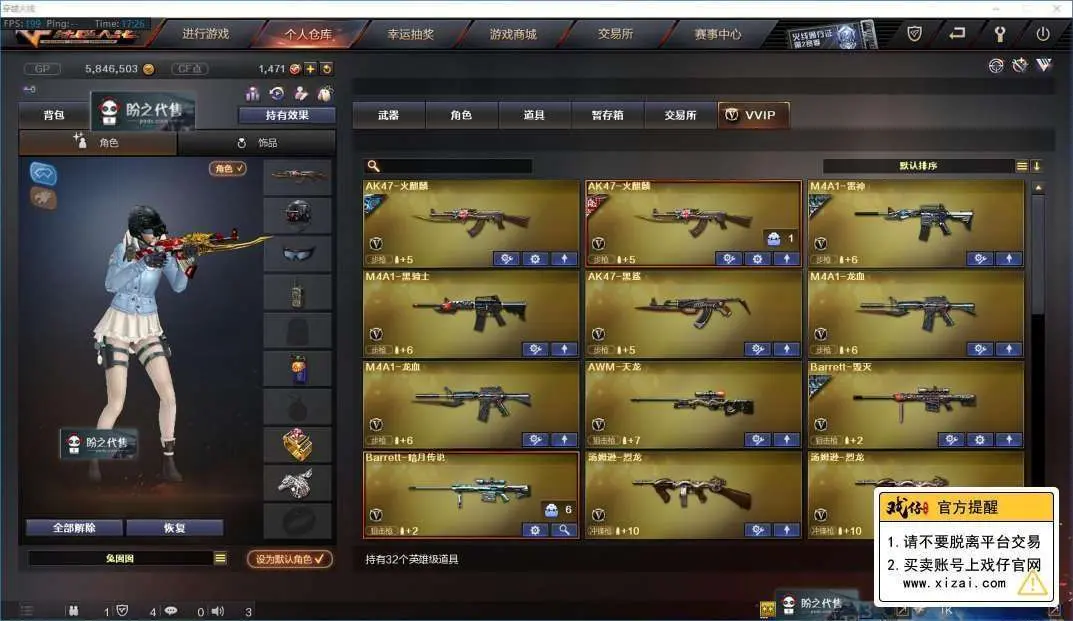 本游戏账号:英雄武器34个; 王者武器12个。 装备齐全拥有完美游戏体验。重要的是,特殊装备有:M4A1-黑骑士、麒麟刺、AK47-火麒麟、AWM-天龙、Barrett-毁灭、M4A1-雷神、AK-47-雷神、AA-12-雷霆、火麒麟-AG、炫金武士、王者之幻、炫金雷神、炫金毁灭、王者之势、王者之翼、王者之力、王者之锋、炫金超新星、源·毁灭、源·火麒麟、堕天使、雷霆-β、潘多拉、圣诞潘多拉-X、M4A1-雷神音效卡、AK47-火麒麟音效卡、等,随意畅选。