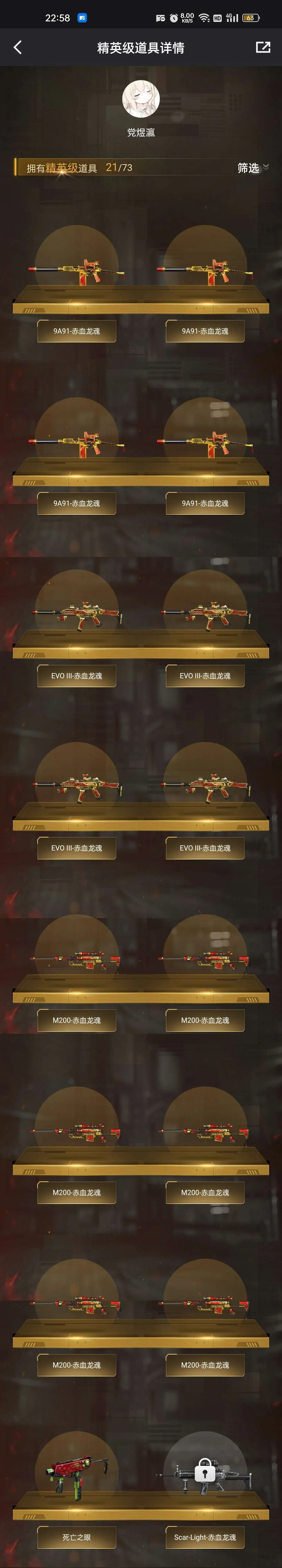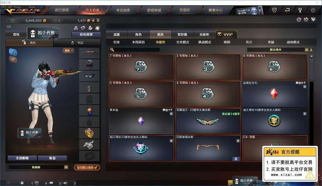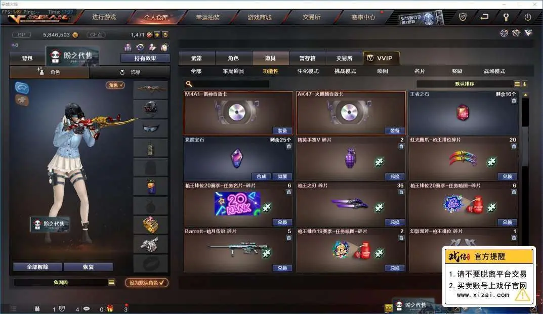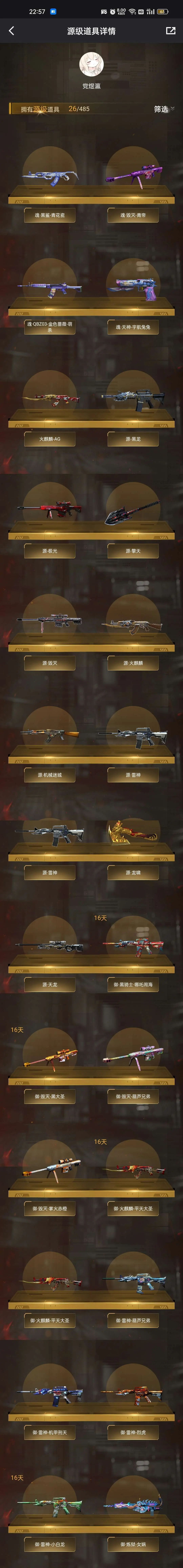 本游戏账号:英雄武器34个; 王者武器12个。 装备齐全拥有完美游戏体验。重要的是,特殊装备有:M4A1-黑骑士、麒麟刺、AK47-火麒麟、AWM-天龙、Barrett-毁灭、M4A1-雷神、AK-47-雷神、AA-12-雷霆、火麒麟-AG、炫金武士、王者之幻、炫金雷神、炫金毁灭、王者之势、王者之翼、王者之力、王者之锋、炫金超新星、源·毁灭、源·火麒麟、堕天使、雷霆-β、潘多拉、圣诞潘多拉-X、M4A1-雷神音效卡、AK47-火麒麟音效卡、等,随意畅选。