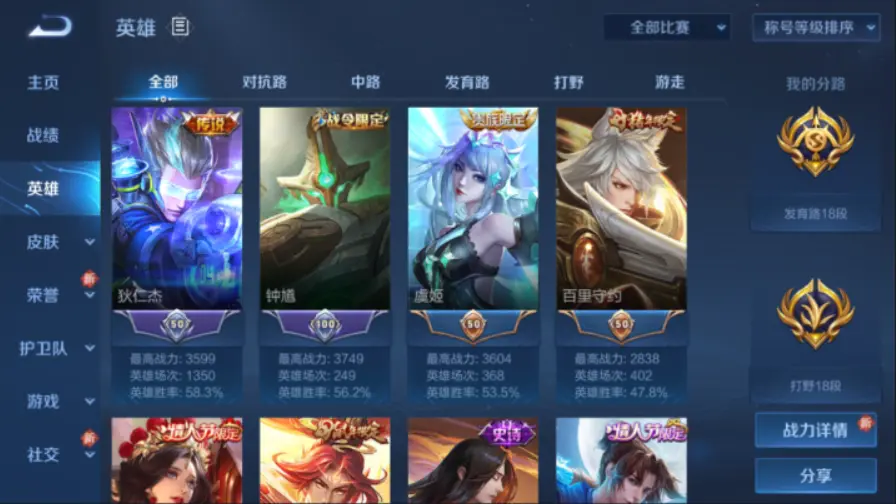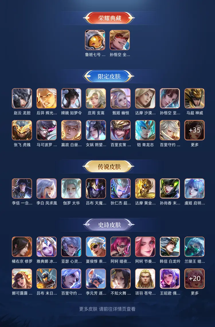 本游戏账号: V10用户,基础段位:永恒钻石I,英雄多,皮肤多。典藏皮肤2个,感受典藏皮肤带来的优质体验快感,FMVP皮肤1个,尽情享受FMVP皮肤带来的主角光环, 私人所属英雄皮肤有:鲁班七号 星空梦想||孙悟空 全息碎影孙尚香 末日机甲||吕布 天魔缭乱||李白 凤求凰||狄仁杰 超时空战士||艾琳 觅芳踪||虞姬 启明星使||李信 一念神魔||伽罗 太华,等等