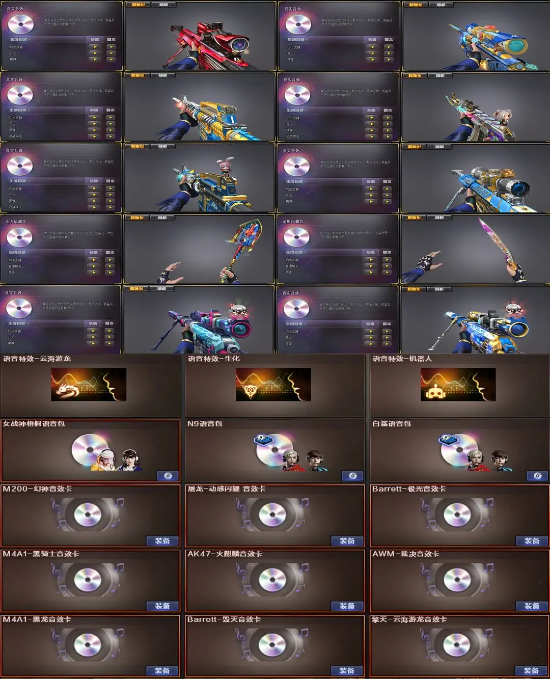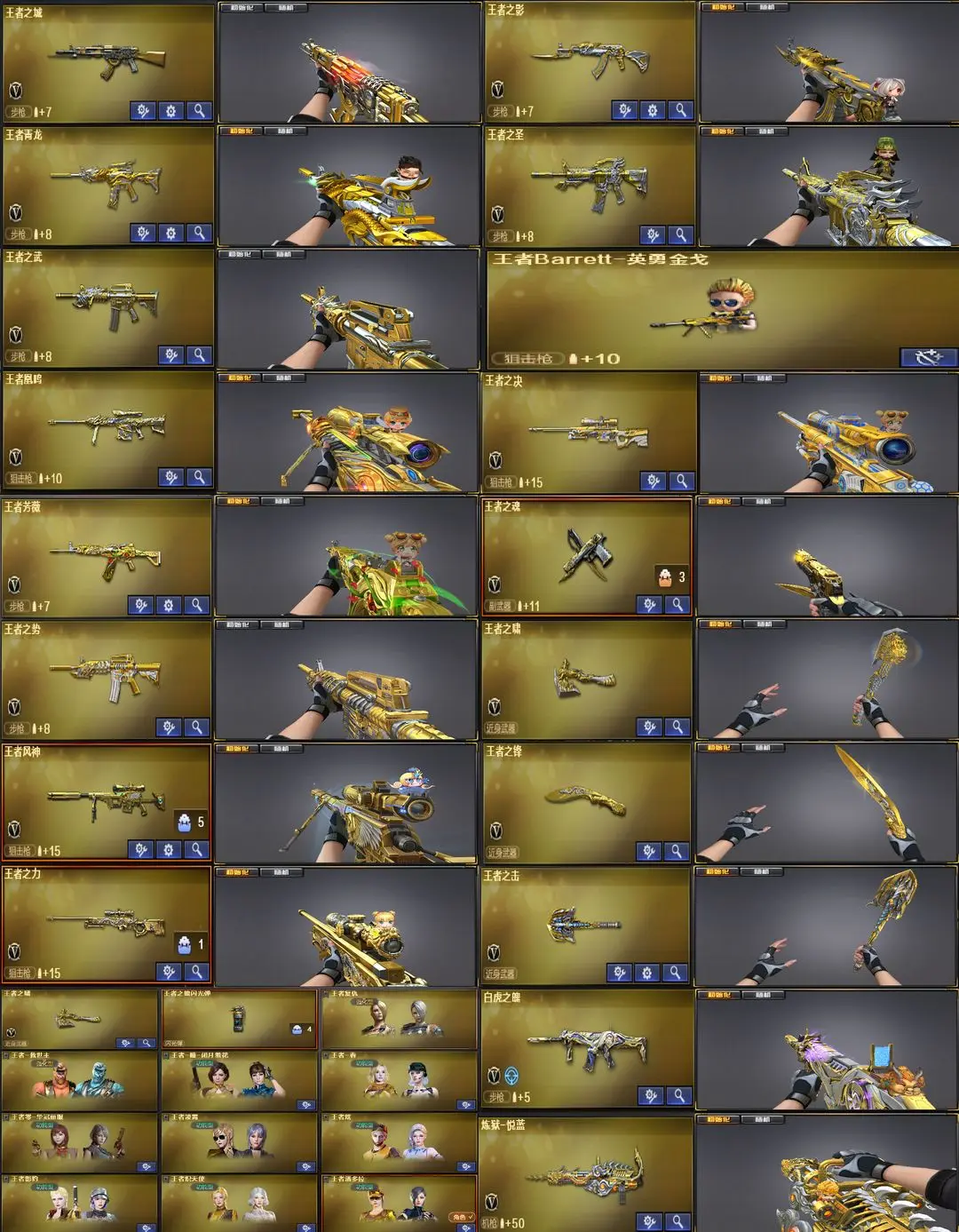 【装备道具】:传说灵眸/王者芳薇/王者潘多拉/幻神动感闪耀/王者风神/隼/幻神世冠白鲨皮肤/幻神冠军之幻/幻神巅峰荣耀/幻神周瑜/幻神青鹤/极光能量核心/雷神R.LGDCFPLS18冠军/黑骑士AGS4冠军典藏/QBZ03巅峰荣耀/传说艾莉莎 葵/影豹/荒漠琉璃/魅影/隼/M200-幻神(2)/Barrett-毁灭(2)/Barrett-极光/王者凰鸣-觉醒版/Kar98K-星神/幻灵套装/屠龙-动感闪耀 音效卡/AWM-裁决音效卡/Barrett-极光音效卡/M200-幻神音效卡/M4A1-黑骑士音效卡/M4A1-黑龙音效卡/火麒麟音效卡/毁灭音效卡/传说艾莉莎/葵/影豹/荒漠琉璃/魅影/隼/兰-巾帼英雄/晴雅/王者零-华冠丽服/王者春/王者-瞳-闭月羞花/王者凌霄/王者炽天使/王者潘多拉/王者影豹/王者炫/王者复仇/王者-救世主/乔伊教练/女主播/新海豹突击队/零-热舞青春/灵狐者-职业经理/铁骑荣耀/女战神★王者凰鸣★Knife-冠军之刃★QBZ03-天罚★炽芒蝶刃★USP-神工天巧★QBZ03-天罚★变异宝贝死亡对讲机不退包★佣兵觉醒无需换弹手斧镜减速雷★捕食者之眼查看血量★