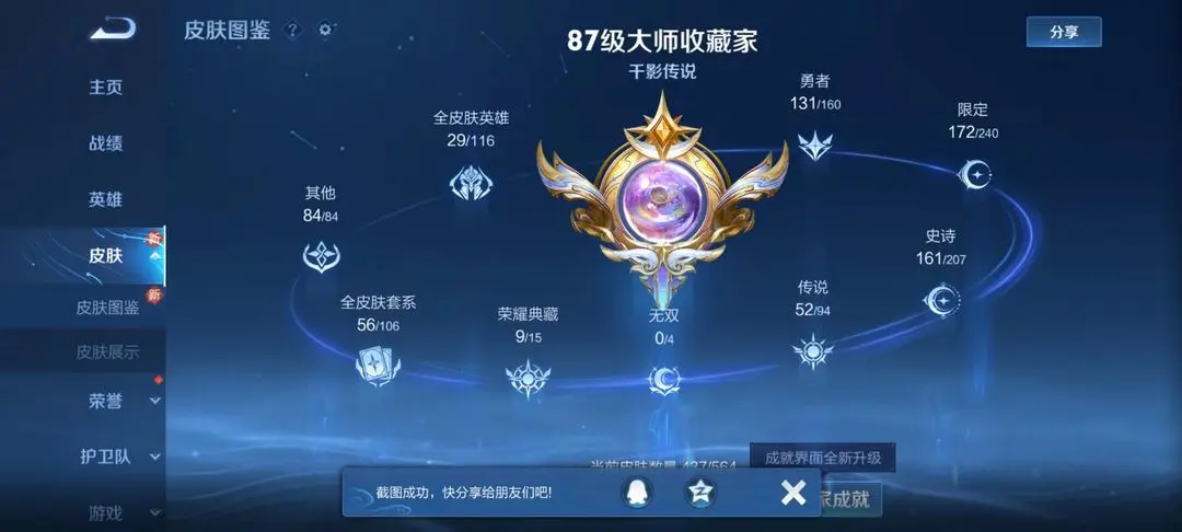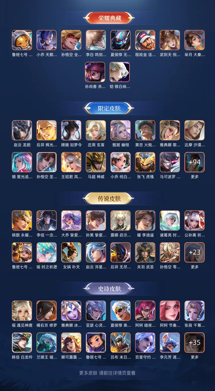 本游戏账号: V10用户,基础段位:至尊星耀V,英雄多,皮肤多。典藏皮肤9个,感受典藏皮肤带来的优质体验快感,FMVP皮肤6个,尽情享受FMVP皮肤带来的主角光环, 私人所属英雄皮肤有:孙尚香 杀手不太冷||鲁班七号 星空梦想||芈月 大秦宣太后||夏侯惇 无限飓风号||李白 鸣剑·曳影||武则天 倪克斯神谕||程咬金 活力突击||孙悟空 全息碎影||小乔 天鹅之梦,等等