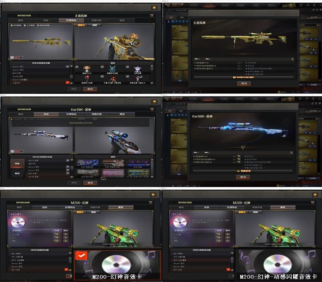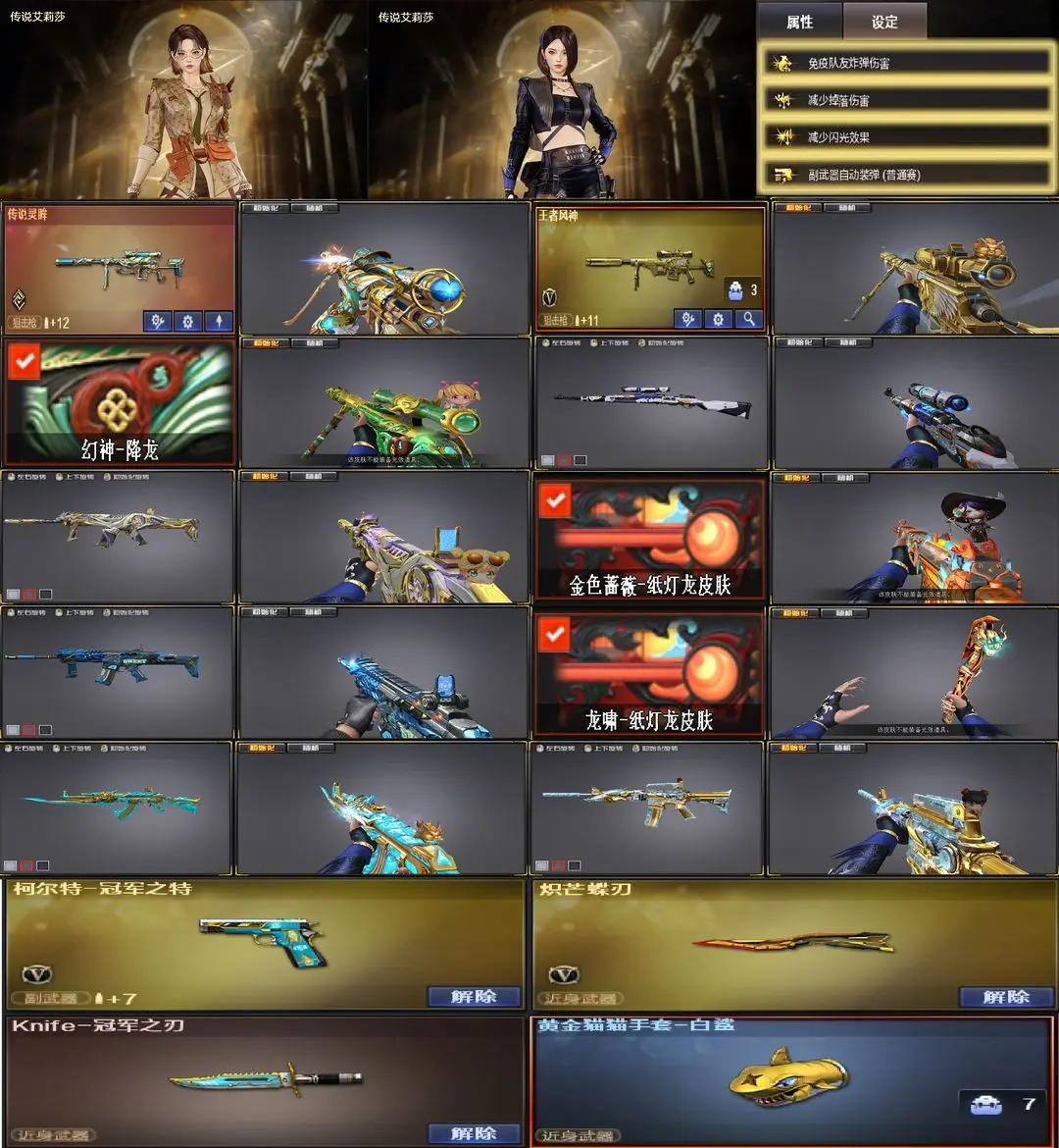 【装备道具】:传说灵眸★觉醒王者风神★炽芒蝶刃★降龙幻神皮肤★双幻神音效卡★动感闪耀幻神音效卡★98K-星神★四防传说艾莉莎★晴雅★隼★岚兮儿★白虎★冠军之特★冠军之刃★白虎之魄★王者冰魄★王者霜心★王者龙血★王者之武★王者之霆★王者之锋★王者之击★王者玉锋★★鲨臂-黄金猫猫手套★炼狱迷你小钢★斯泰尔-蝴蝶★毒蜂★擎天柱★Knife-冠军之刃★柯尔特-双冠军之特★王者沙漠玫瑰★王者凌霄★新海豹突击队★雷神耀金皮肤★雷神新春神龙★火麒麟荣耀世冠AG★黑骑士冠军之势★毁灭直播专属★麒麟刺世冠白鲨★纸灯龙qbz皮肤★纸灯龙龙啸皮肤★白虎电玩蓝兔★雷神宇航兔★变异宝贝死亡对讲机不退包★佣兵觉醒无需换弹手斧镜减速雷★捕食者之眼查看血量★