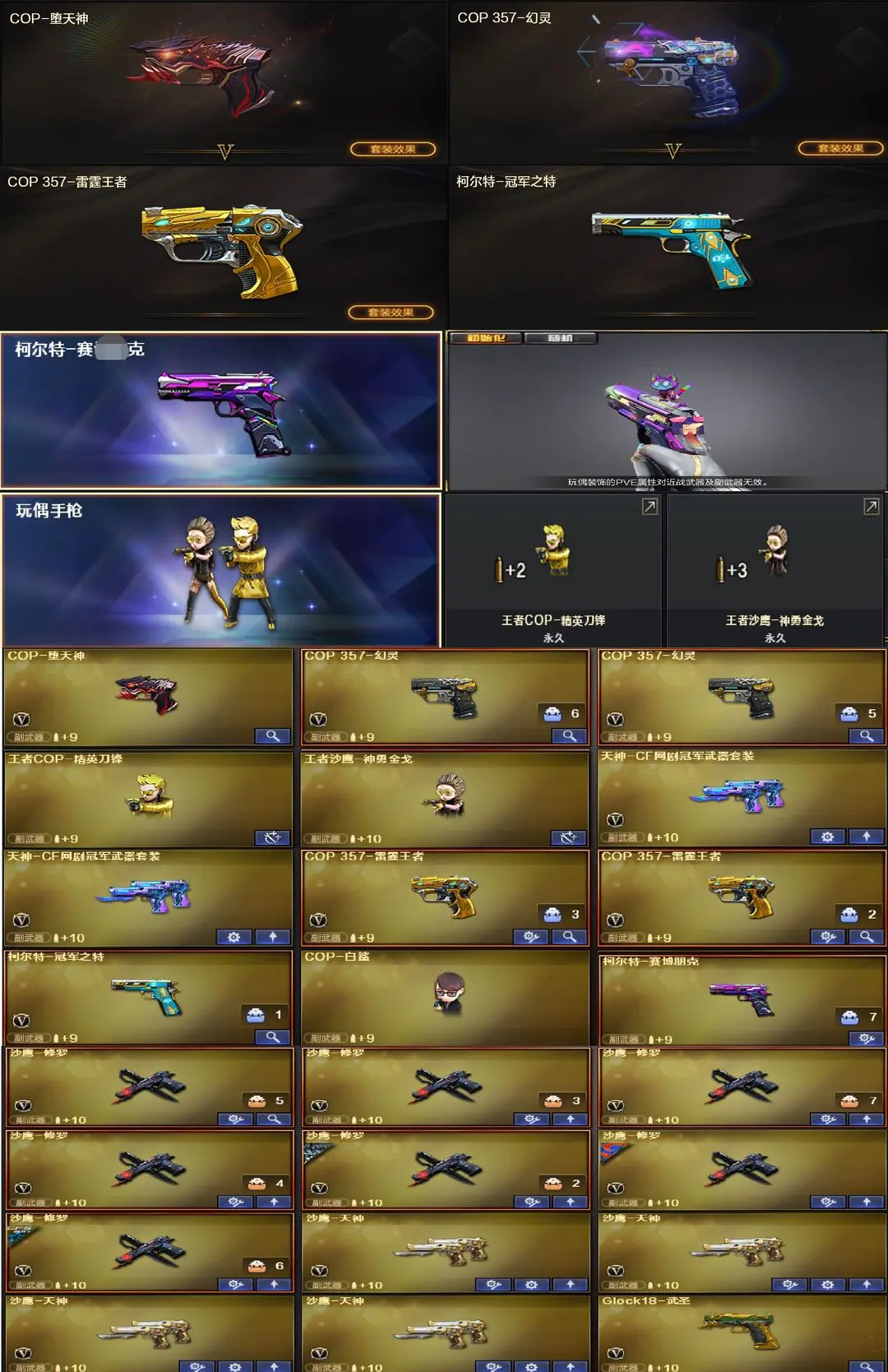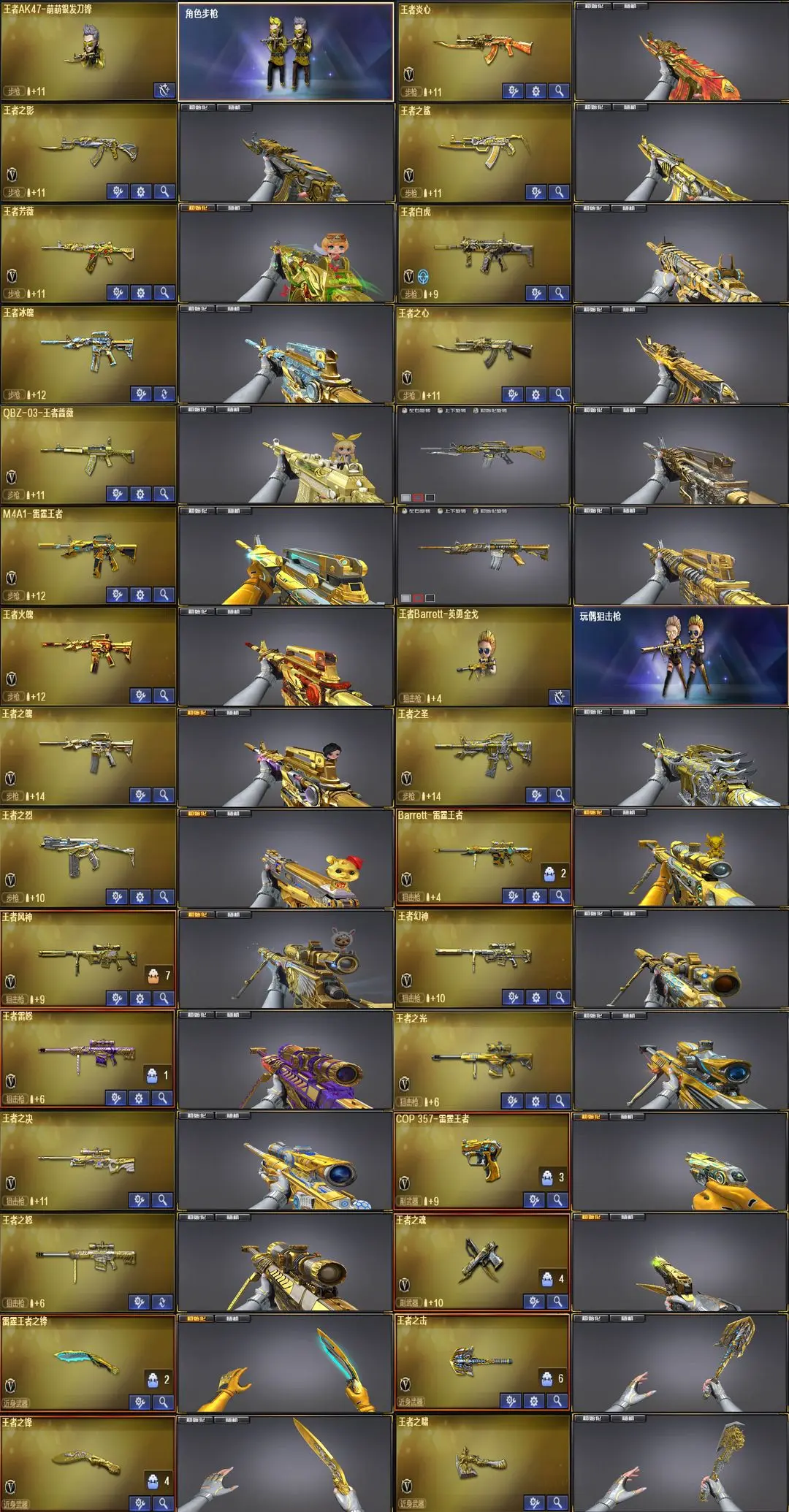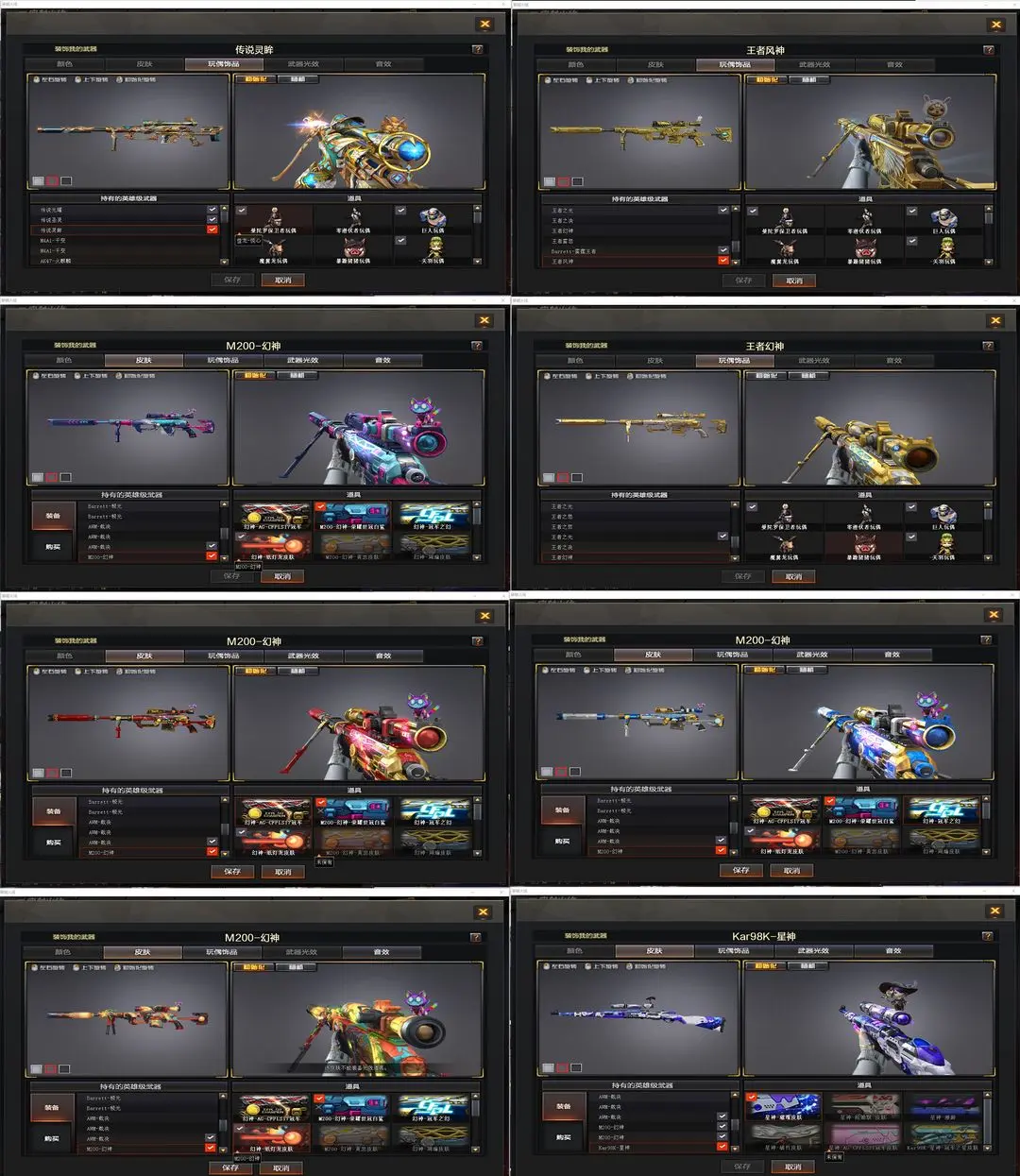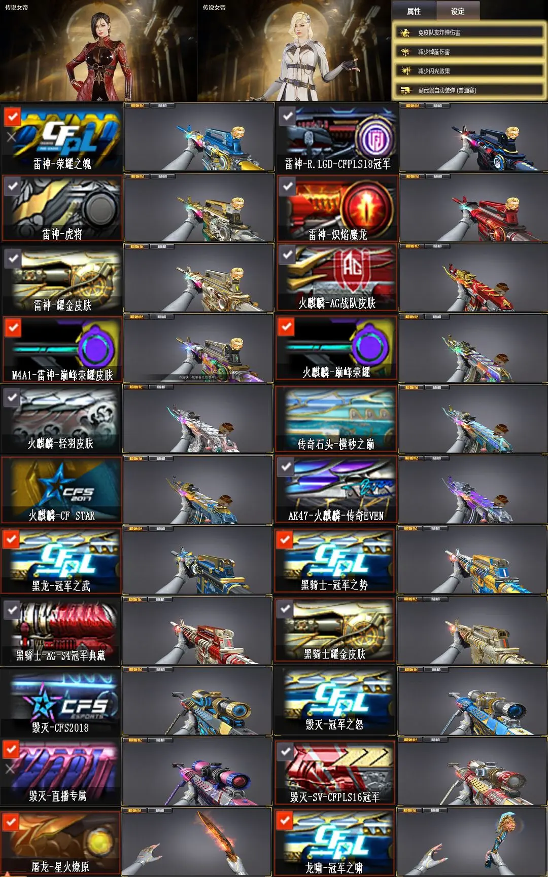 【装备道具】:传说女帝★传说艾莉莎★传说光耀★传说圣灵★传说灵眸★幻神纸灯龙★幻神世冠白鲨★幻神冠军之幻★幻神AG冠军★毁灭SV冠军★雷神R.LG-S18冠军★黑骑士AGS4冠军典藏/麒麟刺荣耀世冠白鲨★毁灭冠军之怒★王者风神★王者幻神-觉醒版★朱雀/雷霆王者套装★加特林-炼狱音效卡/烈火-动感闪耀音效卡/裁决音效卡/极光音效卡/黑骑士音效卡/黑龙音效卡★白虎音效卡/火麒麟音效卡★毁灭音效卡/雷神音效卡★堕天神套装/幻灵套装/网剧冠军套装/雷霆王者套装★影豹/葵/樱/机械姬/隼/炫/零/枪娘樱/雾萌萌/雨棠/王者-迷迭香/王者-瞳-闭月羞花/王者玲珑/王者-魅影/王者-葵-貂蝉/王者潘多拉/雅典娜/王者零-传说之路/乔伊教练/女主播/新海豹突击队/幽/职业选手/灵狐者-职业经理★王者幻神-觉醒版★王者冰魄★火麒麟-绝迹cat猫枪★白虎-迷你小艾★雷神-小红★毁灭-孙三炮★英勇金戈★迷你小钢★斯泰尔-蝴蝶★COP-白鲨★枪娘阿敏★电玩粉兔★霓虹机甲★星火燎原★横秒之巅★巅峰荣耀皮肤★玄武★王者蔷薇★荣耀之证卡牌★变异宝贝死亡对讲机不退包★佣兵觉醒无需换弹手斧镜减速雷★捕食者之眼查看血量★