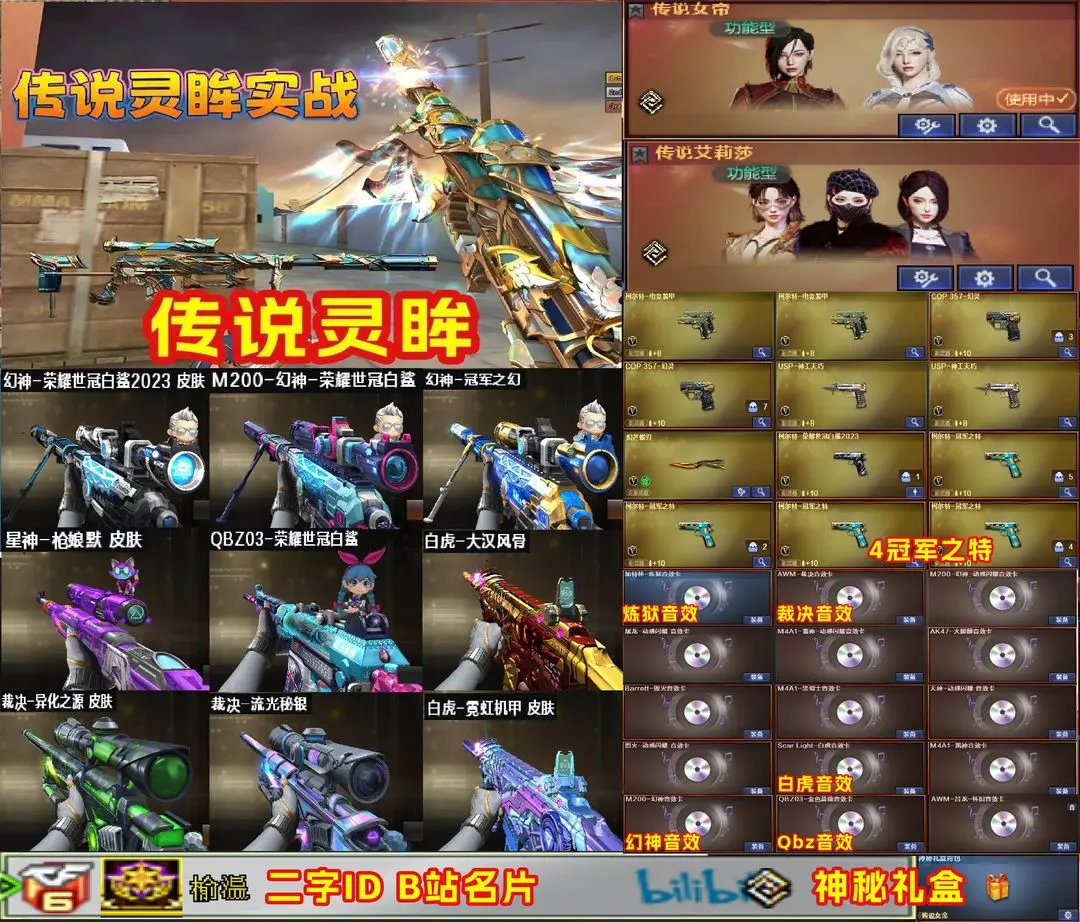 【装备道具】:传说夜影/传说灵眸/传说女帝/传说艾莉莎★幻神世冠白鲨/幻神冠军之幻/幻神巅峰荣耀/幻神丹凤/雷神巅峰荣耀/雷神R.LGDCFPLS18冠军/雷神荣耀世冠AG/QBZ03荣耀世冠白鲨/火麒麟荣耀世冠AG/麒麟刺荣耀世冠白鲨★王者风神★ M200-幻神/幻灵套装/M200-幻神-动感闪耀音效/雷神动感闪耀音效/加特林-炼狱音效卡/屠龙动感闪耀音效卡/天神-动感闪耀 音效卡/烈火动感闪耀音效卡/裁决音效卡/幻神音效卡/黑骑士音效卡/金色蔷薇音效卡/白虎音效卡/雷神音效卡/毁灭音效卡/火麒麟音效卡★晴雅/影豹/雾萌萌/岚兮儿/荒漠琉璃/兰-巾帼英雄/王者-迷迭香/王者葵-惊若翩鸿/王者零-华冠丽服/王者潘多拉/王者炽天使★白虎-迷你小艾★雷神-小红★炼狱-迷你小钢★斯泰尔-蝴蝶★USP-嘉年华柯基★COP-白鲨★雷神-小红★冠军之心★冠军之怒★冠军之魄★冠军之势★雷神-炽焰魔龙★星神-枪娘默★裁决-异化之源★裁决-流光秘银★传奇石头-横秒之巅★白虎-大汉风骨★白虎-电玩粉兔★白虎-霓虹机甲★★变异宝贝死亡对讲机不退包★佣兵觉醒无需换弹手斧镜减速雷★捕食者之眼查看血量★