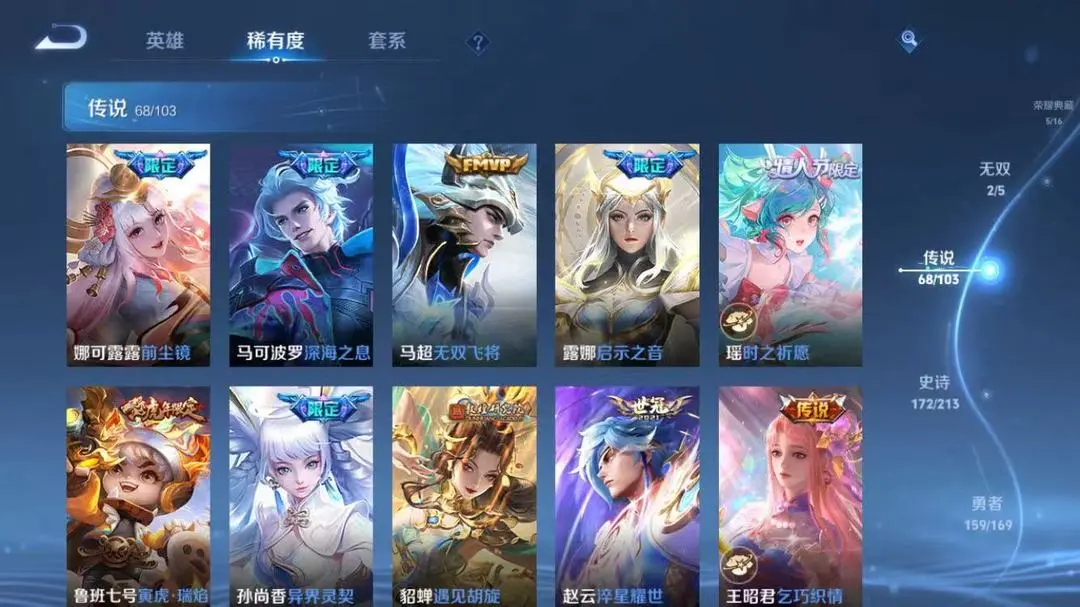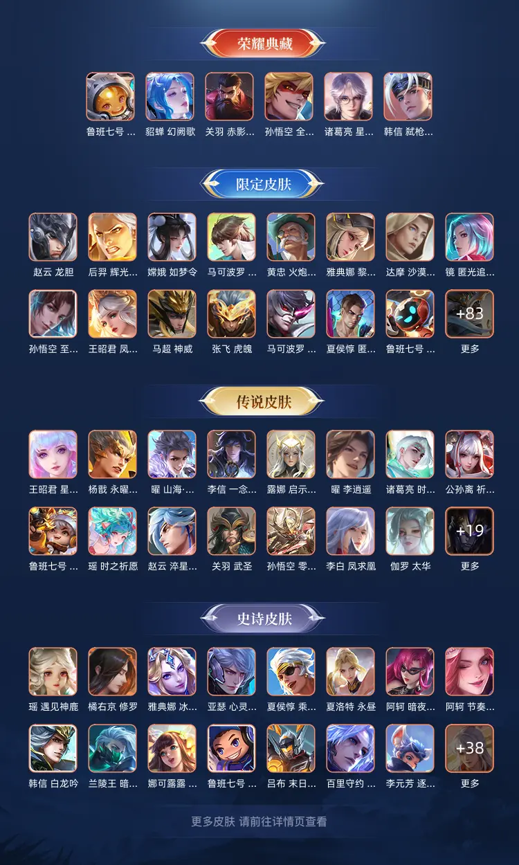 本游戏账号: V10用户,基础段位:永恒钻石IV,英雄多,皮肤多。典藏皮肤5个,感受典藏皮肤带来的优质体验快感,FMVP皮肤9个,尽情享受FMVP皮肤带来的主角光环, 私人所属英雄皮肤有:诸葛亮 星域神启||鲁班七号 星空梦想||貂蝉 幻阙歌||韩信 弑枪猎影||孙悟空 全息碎影诸葛亮 鹤羽星尊||诸葛亮 时雨天司||诸葛亮 武陵仙君||大乔 时之奇旅||铠 绛天战甲||孙尚香 异界灵契||孙尚香 末日机甲||公孙离 祈雪灵祝||鲁班七号 寅虎·瑞焰||鲁班七号 时之奇旅||上官婉儿 妄想奇谈||吕布 遇见神鼓||吕布 天魔缭乱||周瑜 音你心动||曜 山海·苍雷引||曜 李逍遥||澜 电玩·雷克斯||宫本武藏 惊梅引||宫本武藏 地狱之眼||李白 凤求凰||马可波罗 妄想实况||马可波罗 深海之息||狄仁杰 超时空战士||达摩 黄金狮子座||武则天 海洋之心||夏洛特 浮生妄||云缨 鹤归松栖||关羽 武圣||貂蝉 遇见胡旋||露娜 启示之音||王昭君 星穹之声||王昭君 乞巧